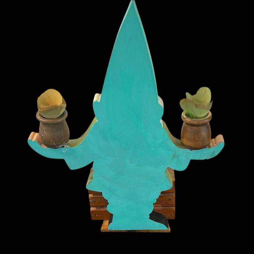 12 x 9" weighs 15ozs. Has a wood chair that sits in front of him for you to fill with faux succulents, plants, etc. Hand painted not by me but I repainted the hat and embellished. Stands alone.