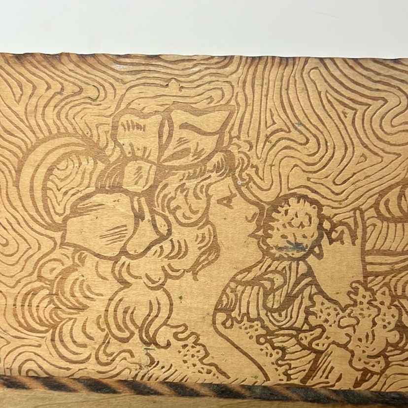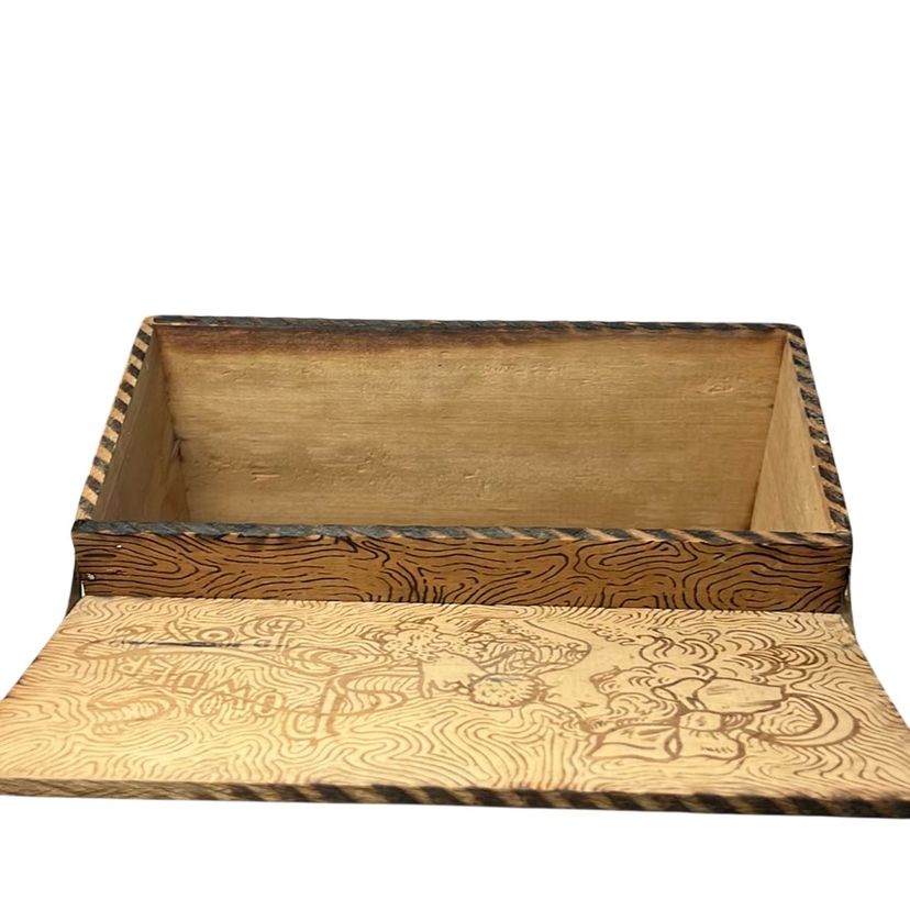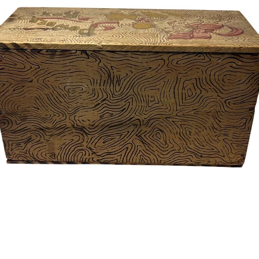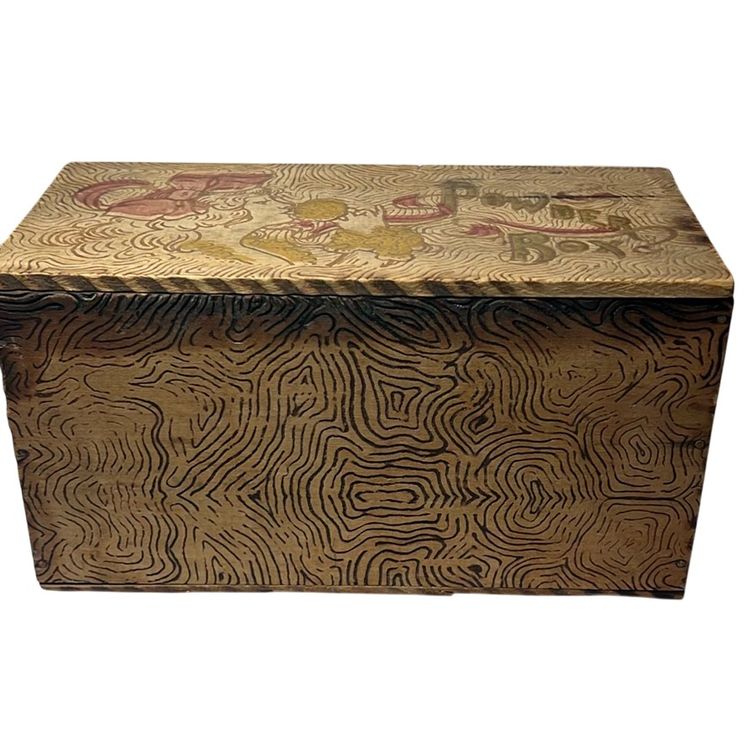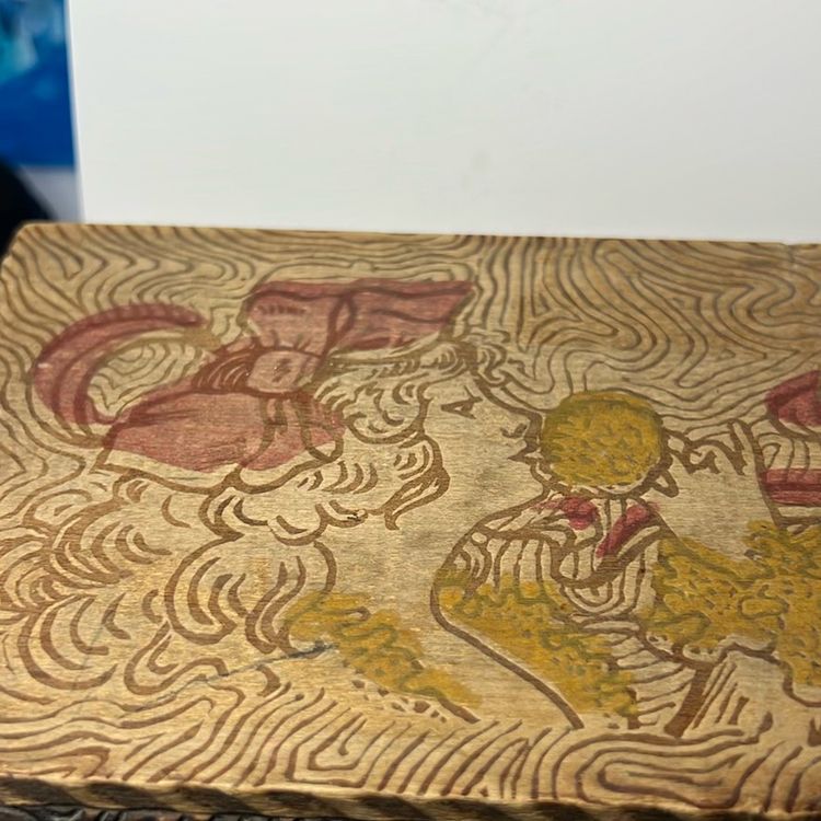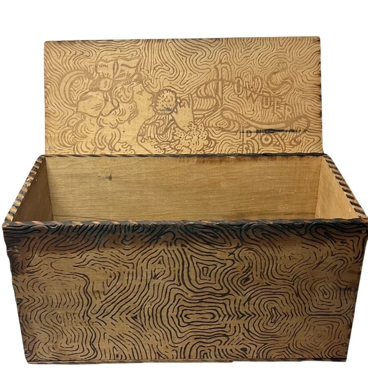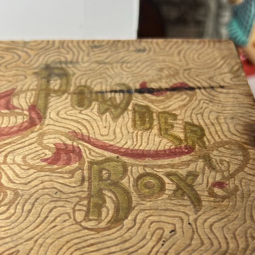Made in old art deco style - says “Powder Box” on top of lid and inside lid. For its age it is in great condition. No damage and measures 4” wide, 4.5” tall & 8.5” long