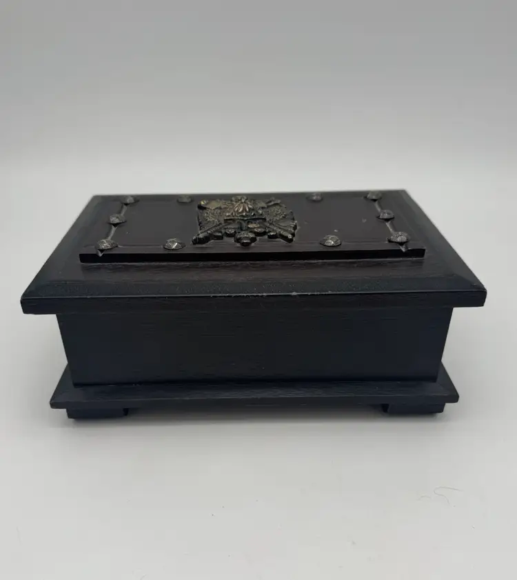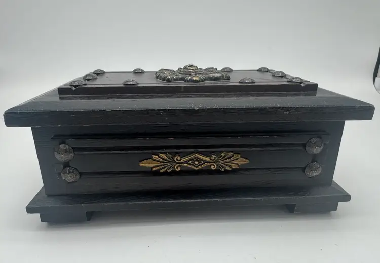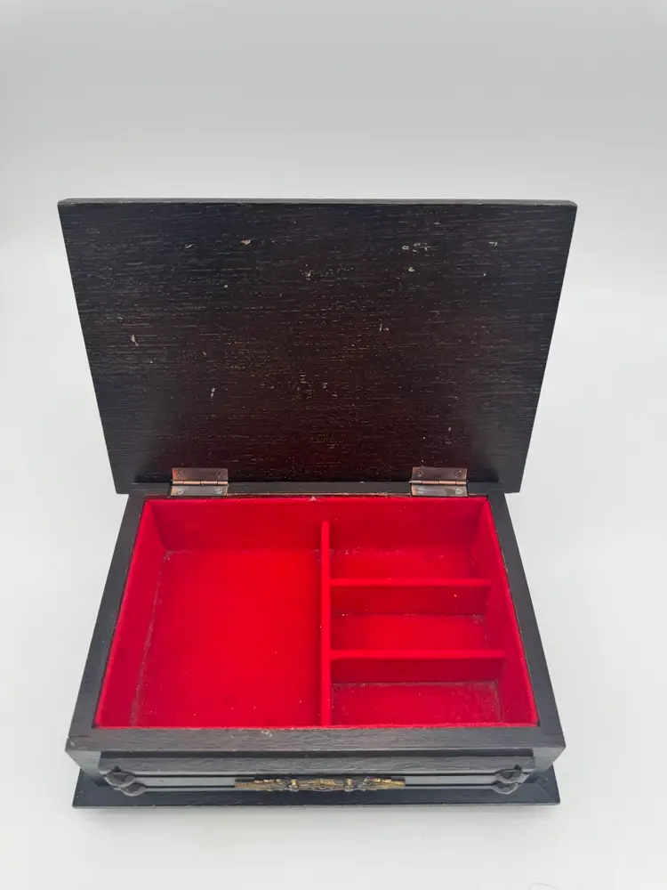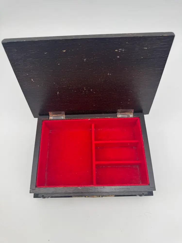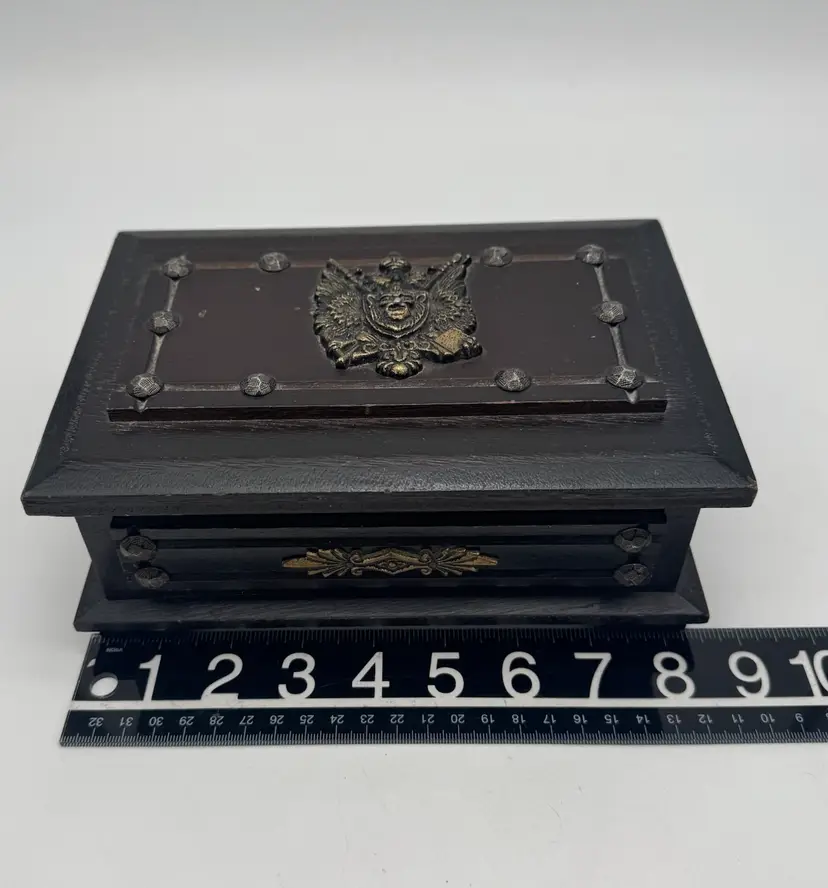 Vintage Wood Jewelry Box Lion’s Crest 8.5" Red Interior