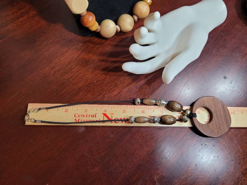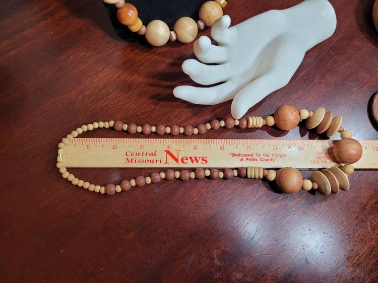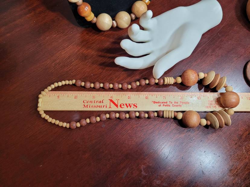Three necklaces and one wood bracelet are in this LOT. The first necklace is about 16 inches with a 2 inch pendant of wood and a lobster claw clasp making it the more modern piece in the lot. The second necklace is longer with mixed wood tones and a Barrell Clasp at 18 inches. The third and longest necklace is mixed wood tones and shapes at aprox. 32 inches and has a sheen to the beads. It has a Vintage HOOK closure. Also included in a HEAVY thick wooden bangle bracelet. It is 3 inches WIDE. All pieces are sold together as a lot. Thank you for looking.
