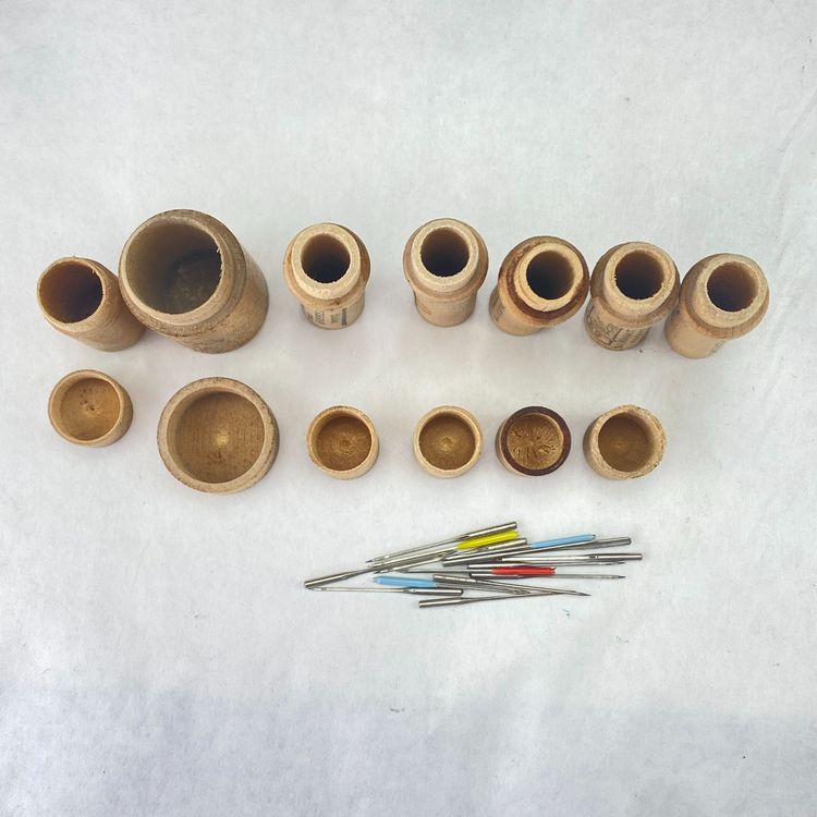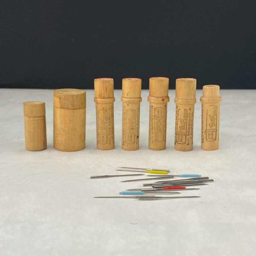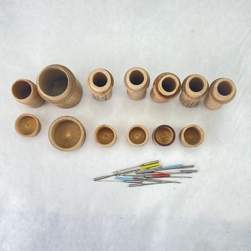 • Includes 6 wooden needle tubes (1 freebie doesn't have the cap) • Assorted needle sizes and tip colors (all needles will be put in 1 of the tubes, as I received them) • Vintage design with labeled tubes