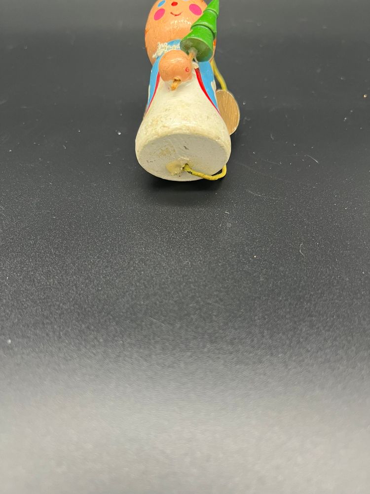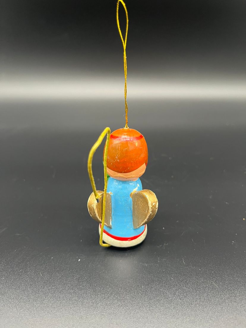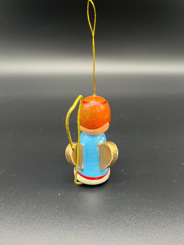Add a touch of handcrafted charm to your tree with this vintage wooden Christmas ornament featuring a sweet angel in a blue dress holding a tiny green tree. With bright orange hair, red shoes, and a golden hanging string, this charmer evokes nostalgic holiday magic. Perfect for small trees, wreaths or gift toppers. Includes shipping. Well-loved condition. Approximately 2.5" tall, 1" wide.