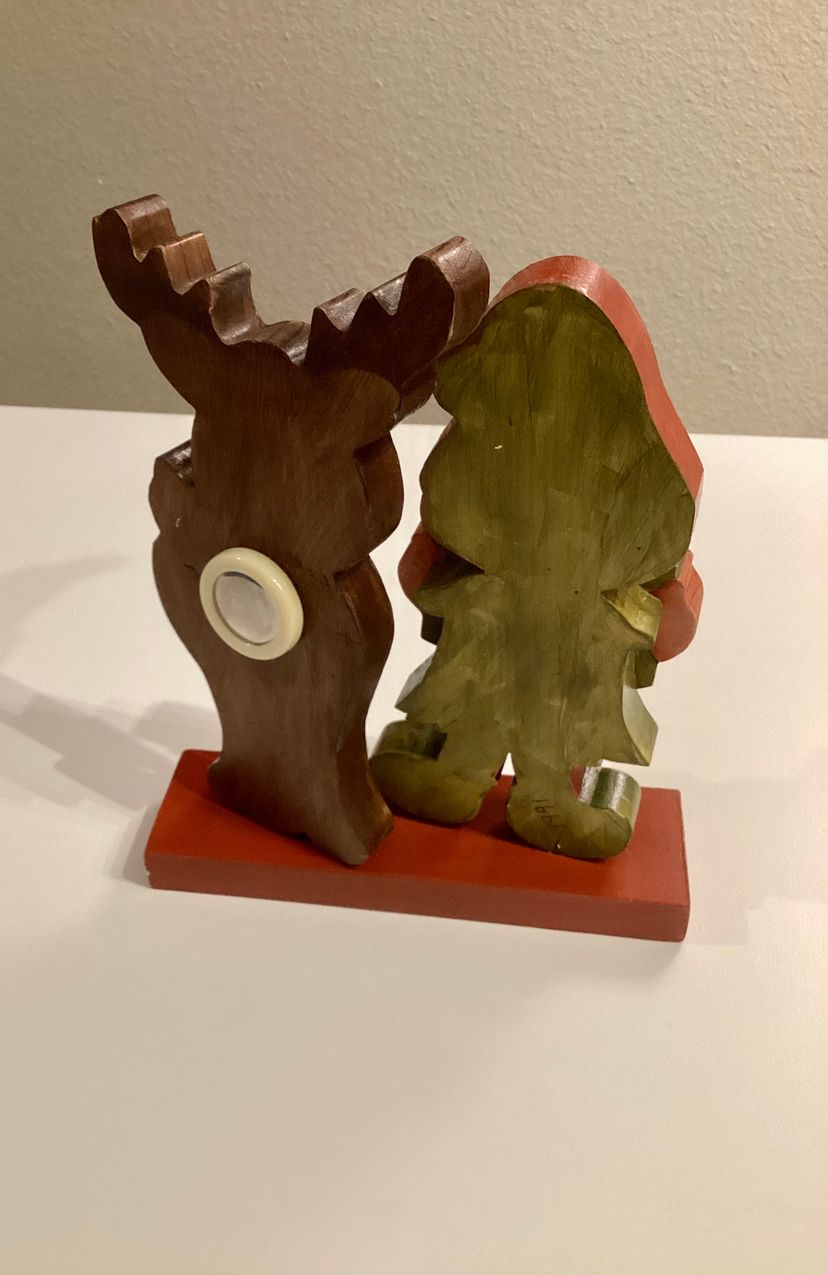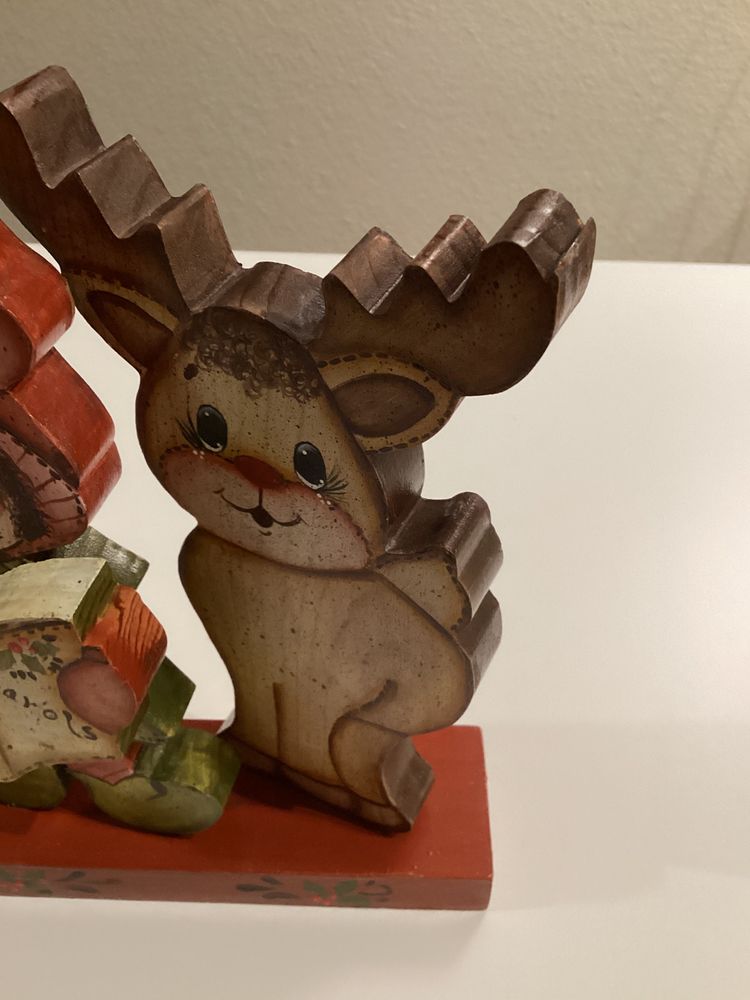 This vintage wooden hand-painted Christmas figurine in the shape of a reindeer and folk art caroller is a charming collectible from 1991. The asymmetrical figure features a traditional Christmas theme and is adorned with multicolor paint, making it a unique addition to any holiday decor collection. Handmade in the United States, this original reideer collection piece showcases intricate details and a festive design that captures the spirit of Christmas in a creative and nostalgic way. Perfect for adults looking to add a touch of seasonal artistry to their home during the holiday season.
