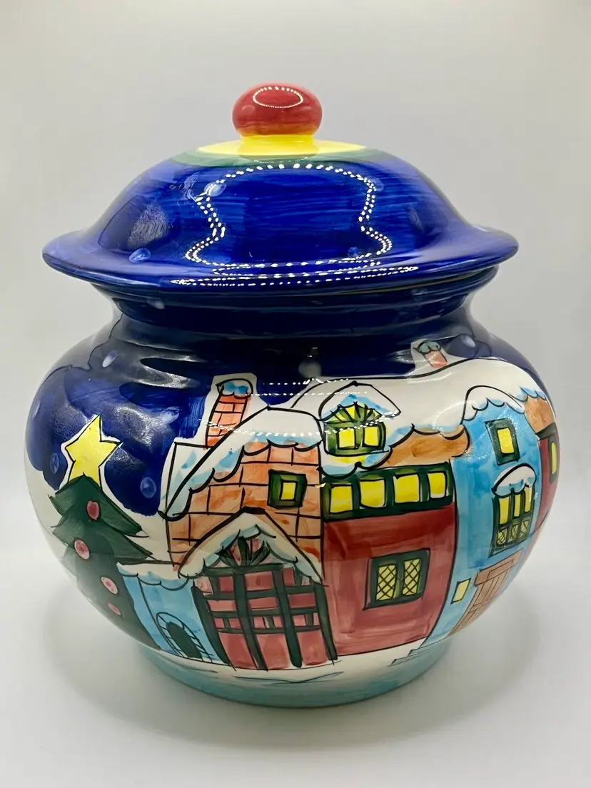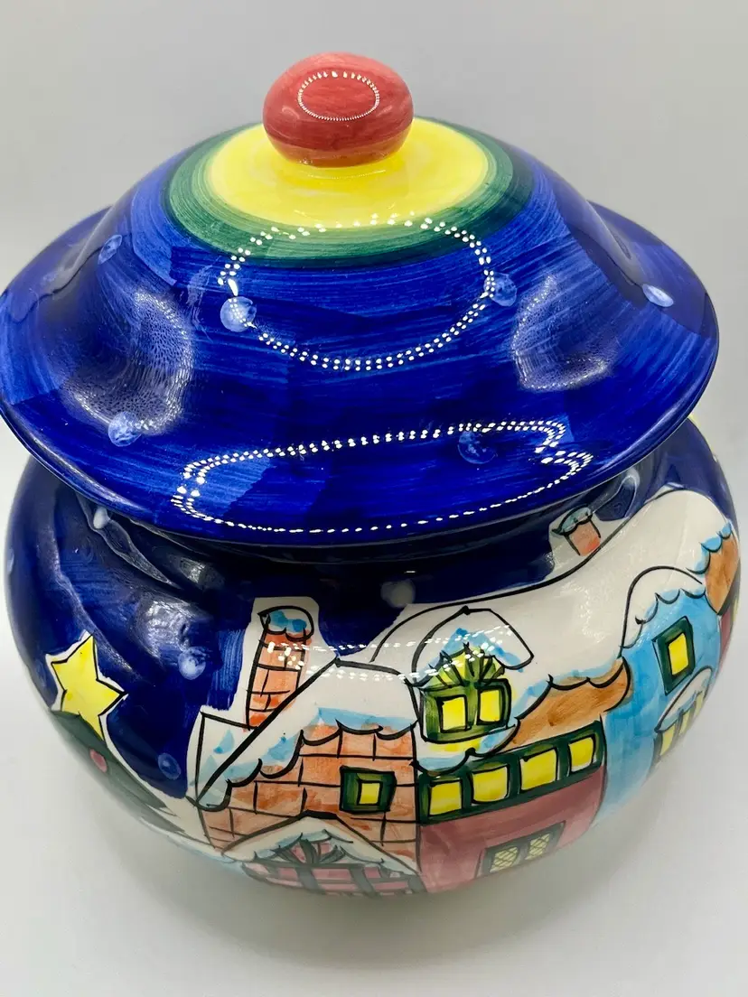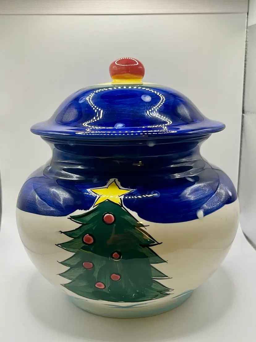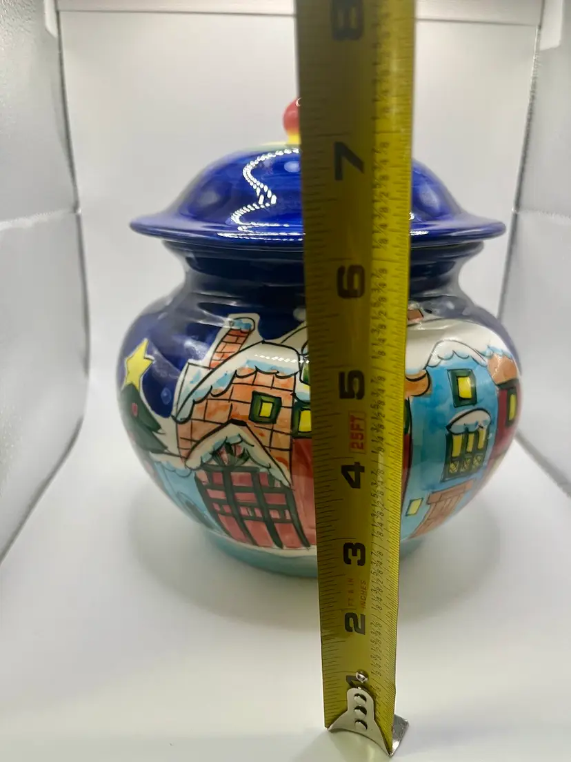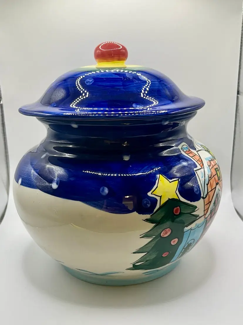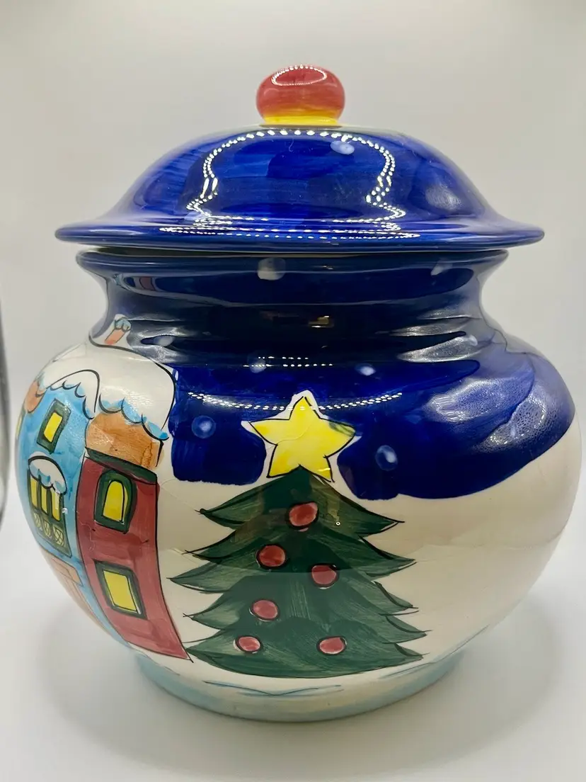 Vintage World Bazaars Christmas Cookie Jar W Lid 8" Tall 7" Wide. No Condition Issues