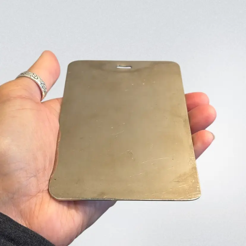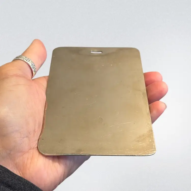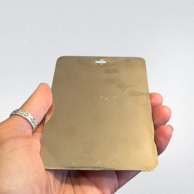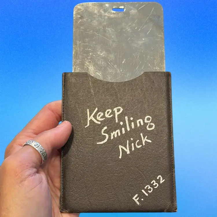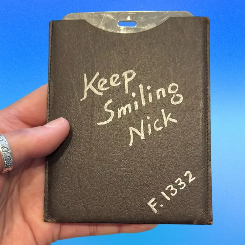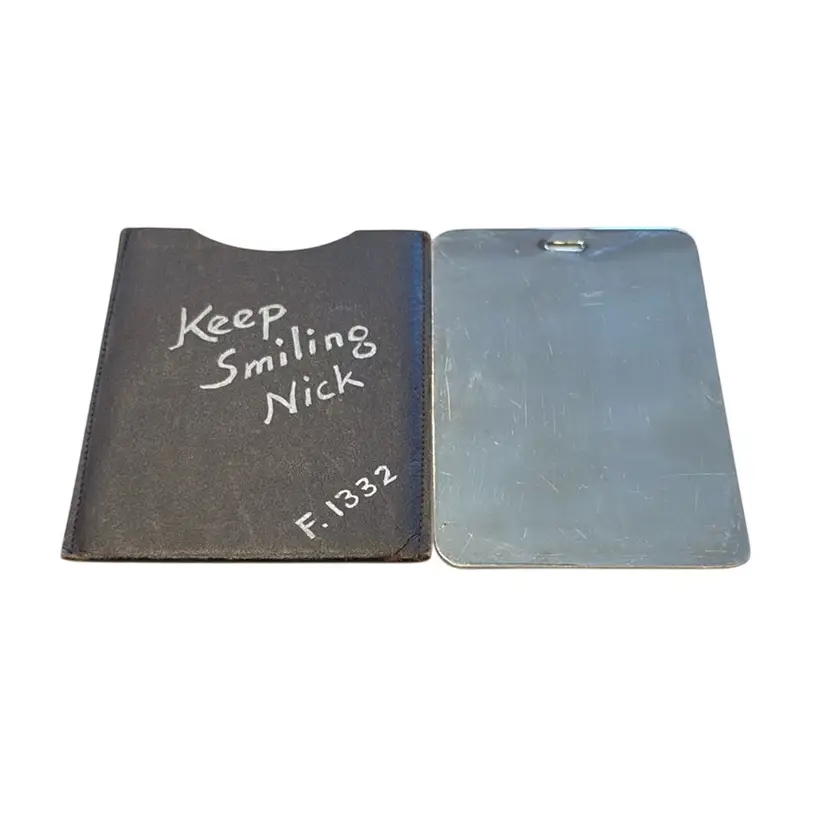 Vintage WWII Military Metal Double Sided Mirror measuring 5.75”. Mirror was purchased in a lot of other WWII items from a dealer. The case is just big enough so the mirror slips in easily. The case is in good condition with message “Keep Smiling Nick,” F.1332 written on one side. The mirror has a few scuffs but works great.