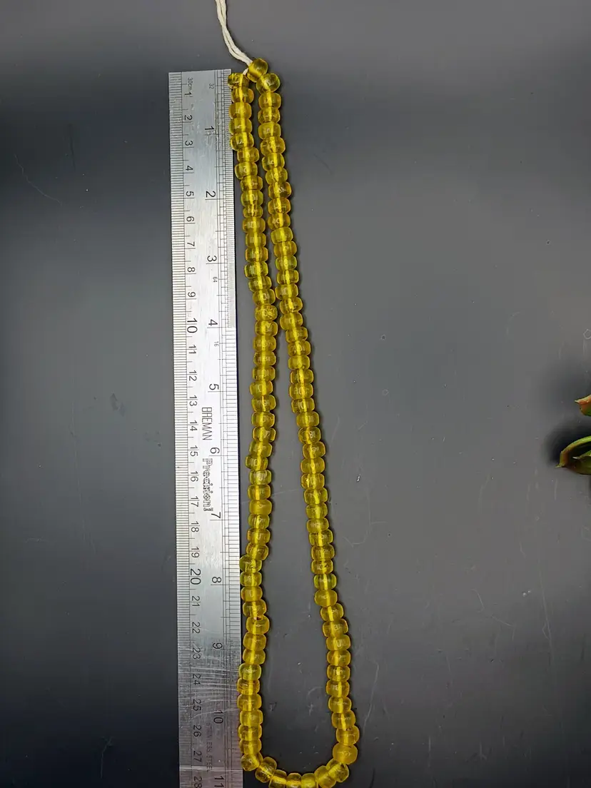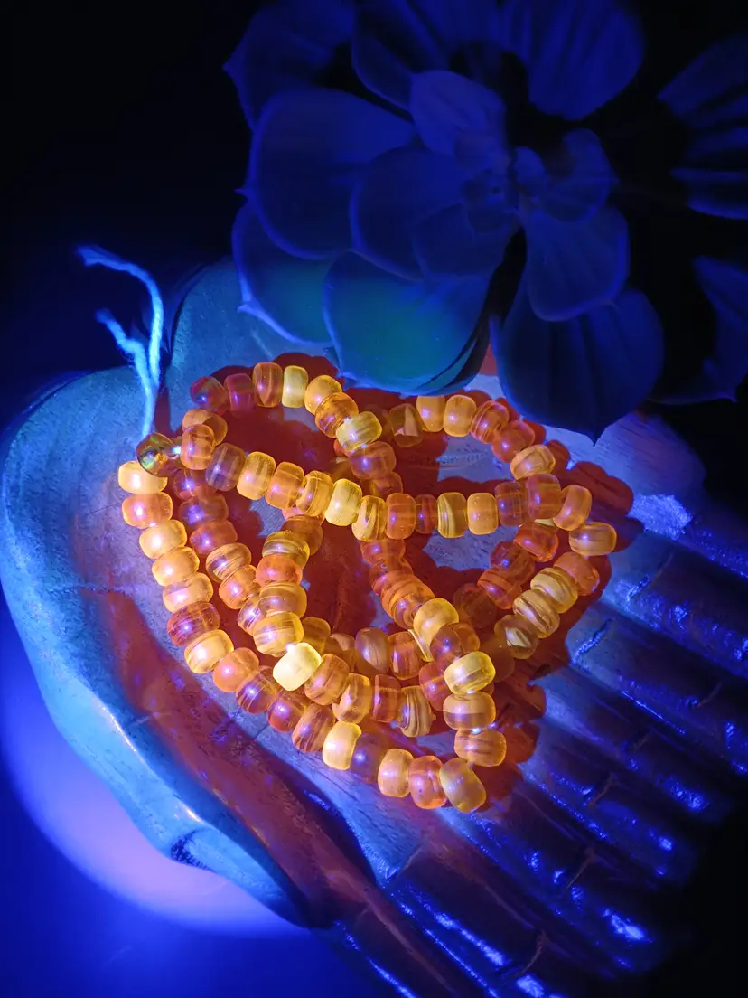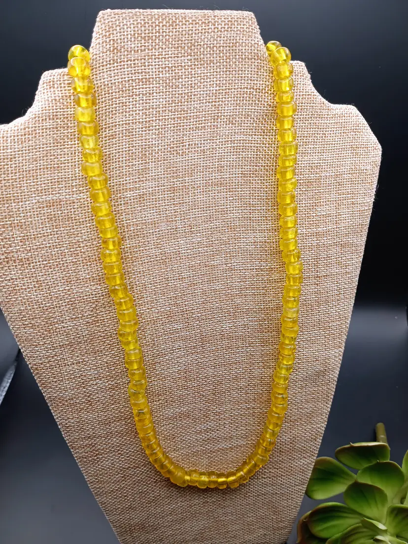 HI, in this lot you will receive a yellow glass Crow bead necklace. This necklace is approximately 23 inches in circumference. The beads are about 7-8mm. They GLOW a beautiful fire orange under UV light.