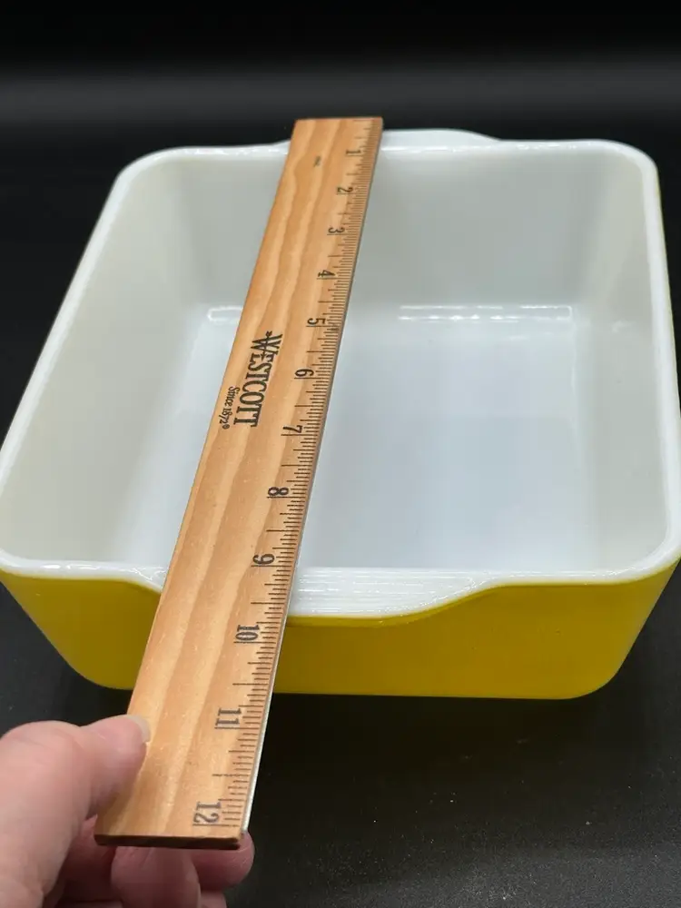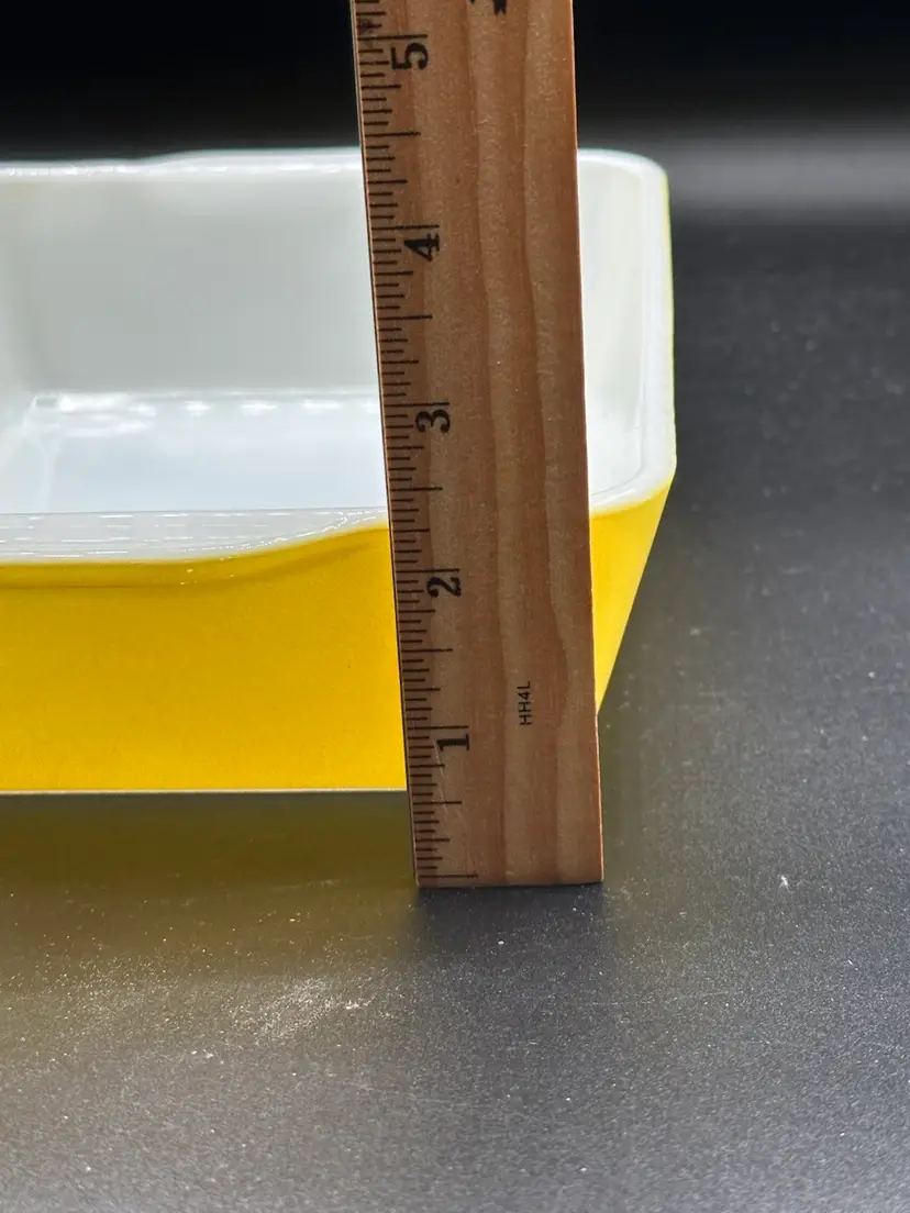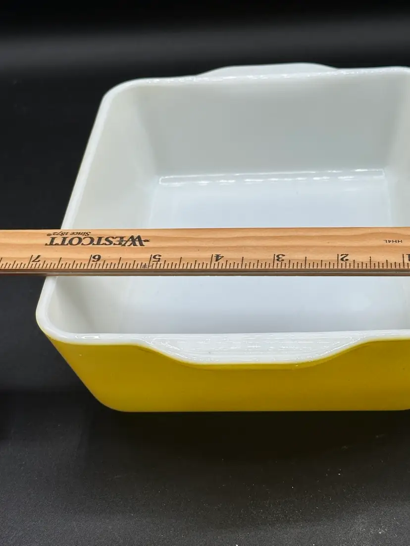 The product is a vintage 1950s yellow Pyrex 0503 C refrigerator casserole dish with lid. It is a nostalgic piece of decorative cookware, perfect for those who appreciate mid-century American kitchenwa