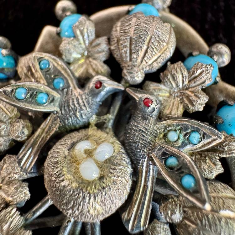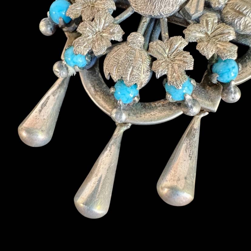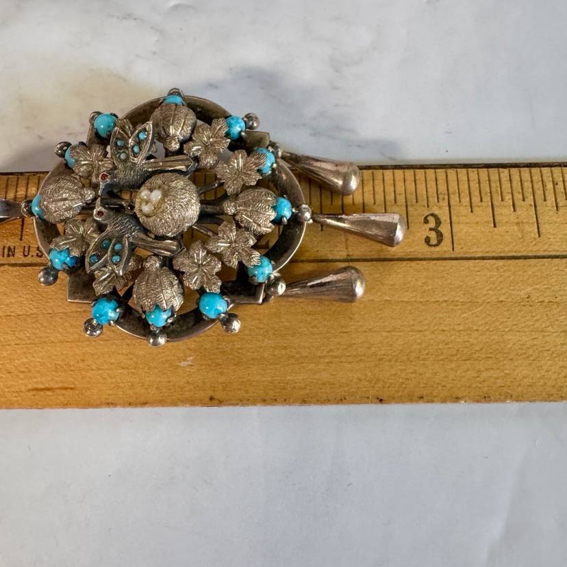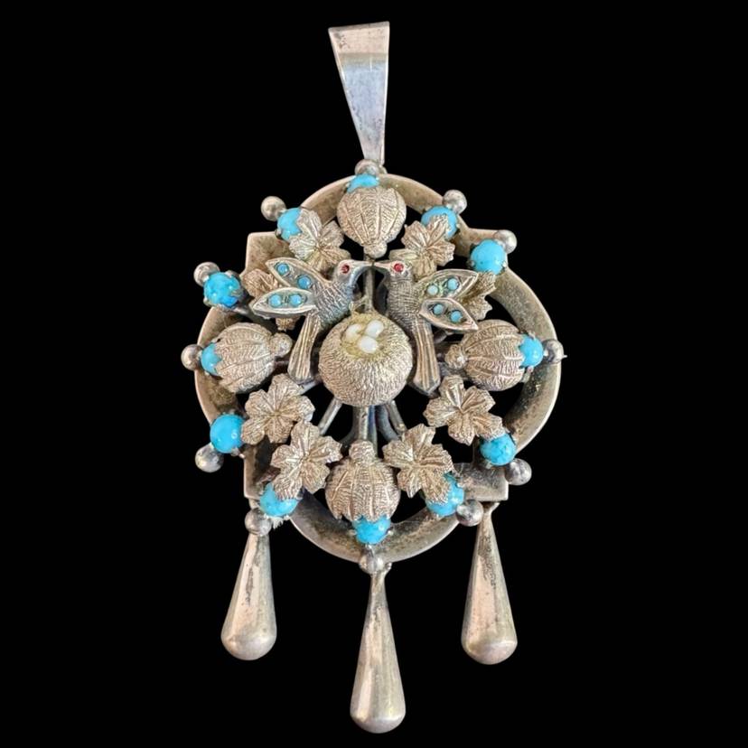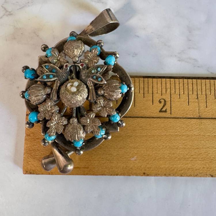 Exquisite vintage Zuni Native American sterling silver pendant/brooch combo depicting a pair of hummingbirds guarding a nest with eggs, featuring turquoise stones, red stones (possibly coral or glass), and white beads. Marked 925 and tested sterling. Measures 2-3/4” long x 1-1/2” wide, weighs 16g. Good vintage condition with signs of wear and patina due to age. A stunning, symbolic piece ready for your collection!