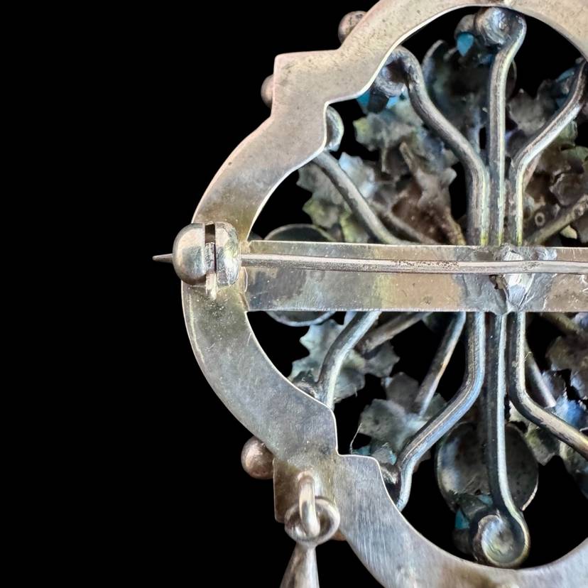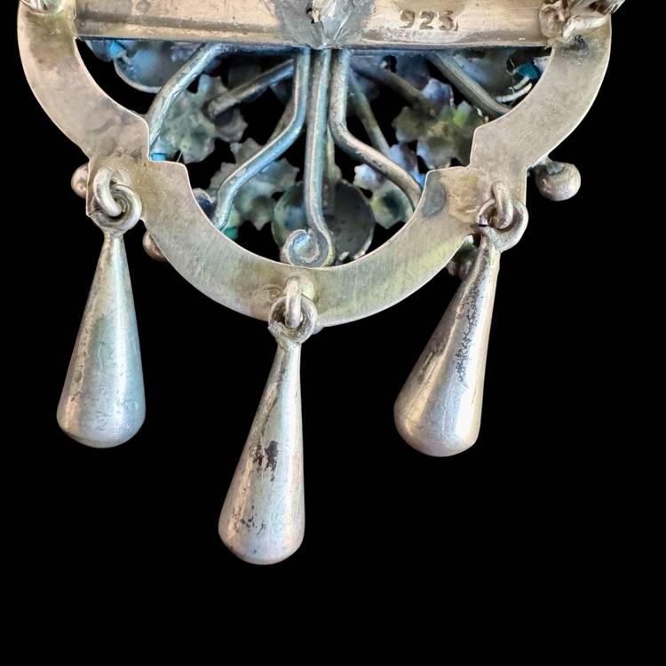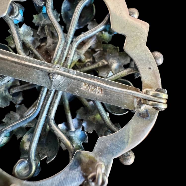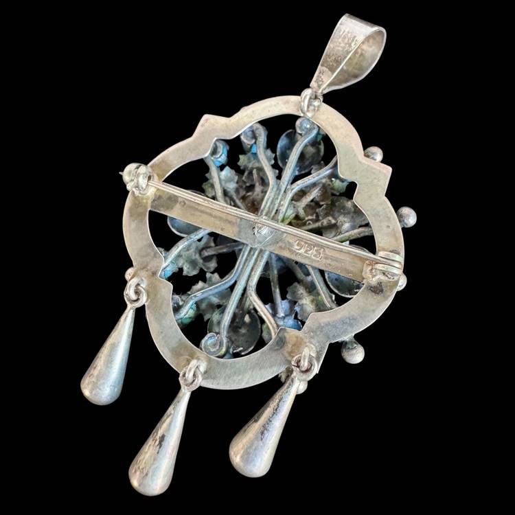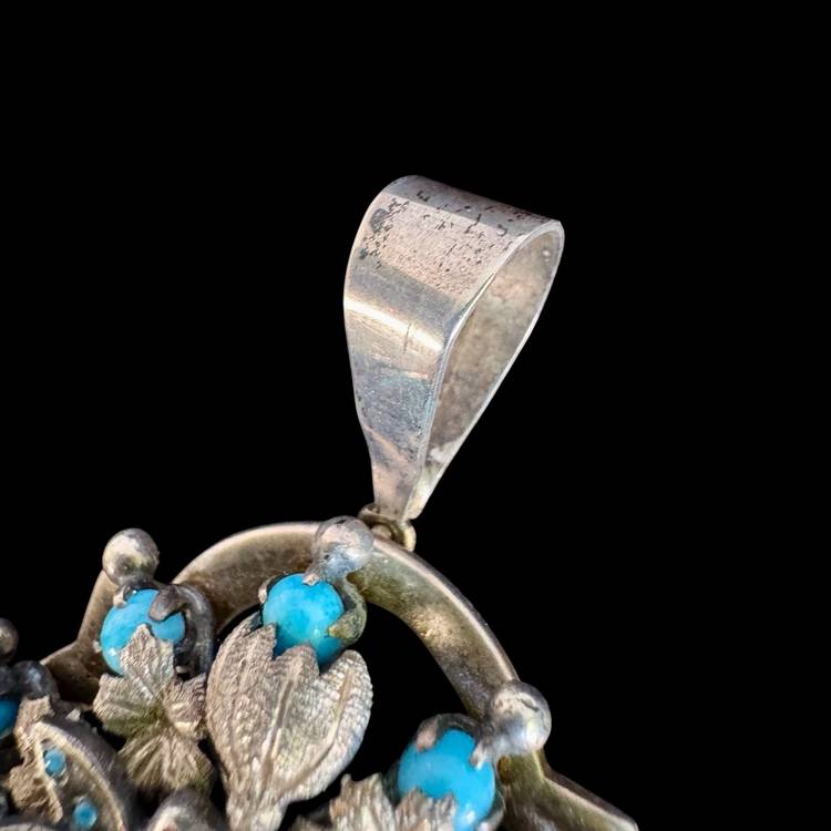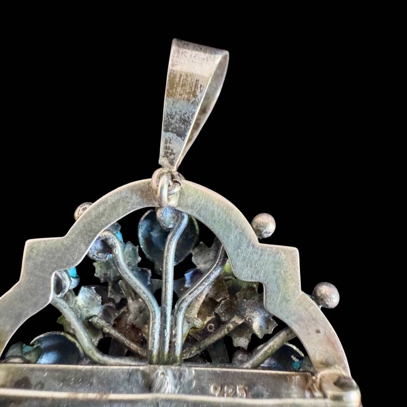 Exquisite vintage Zuni Native American sterling silver pendant/brooch combo depicting a pair of hummingbirds guarding a nest with eggs, featuring turquoise stones, red stones (possibly coral or glass), and white beads. Marked 925 and tested sterling. Measures 2-3/4” long x 1-1/2” wide, weighs 16g. Good vintage condition with signs of wear and patina due to age. A stunning, symbolic piece ready for your collection!