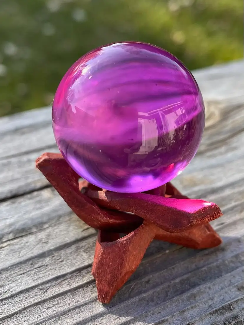 A violet colored glass sphere. 40 mm. 75 Grams. Wood stand pictured is included.