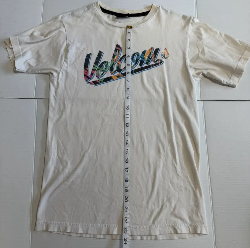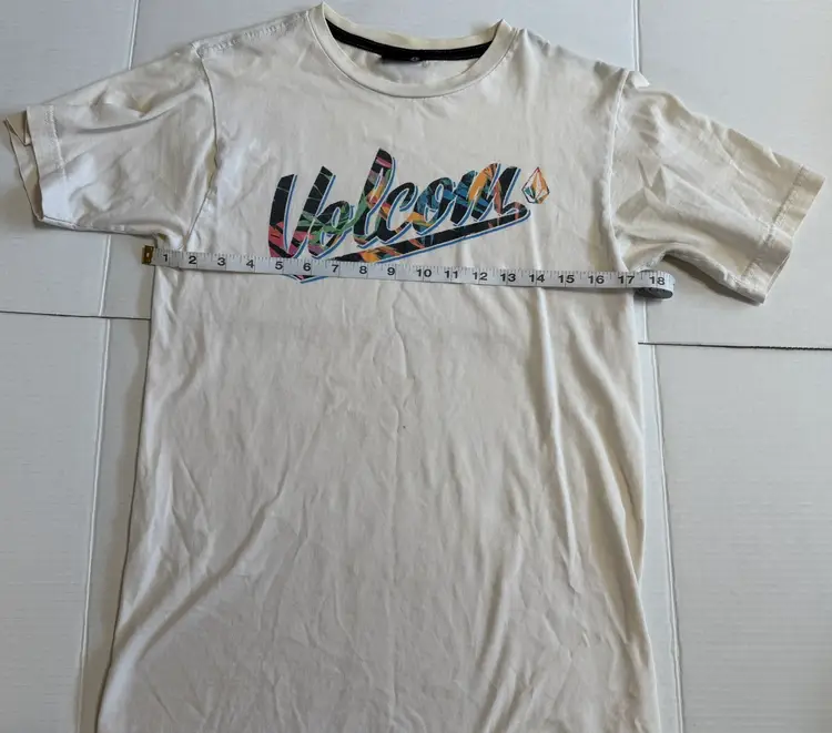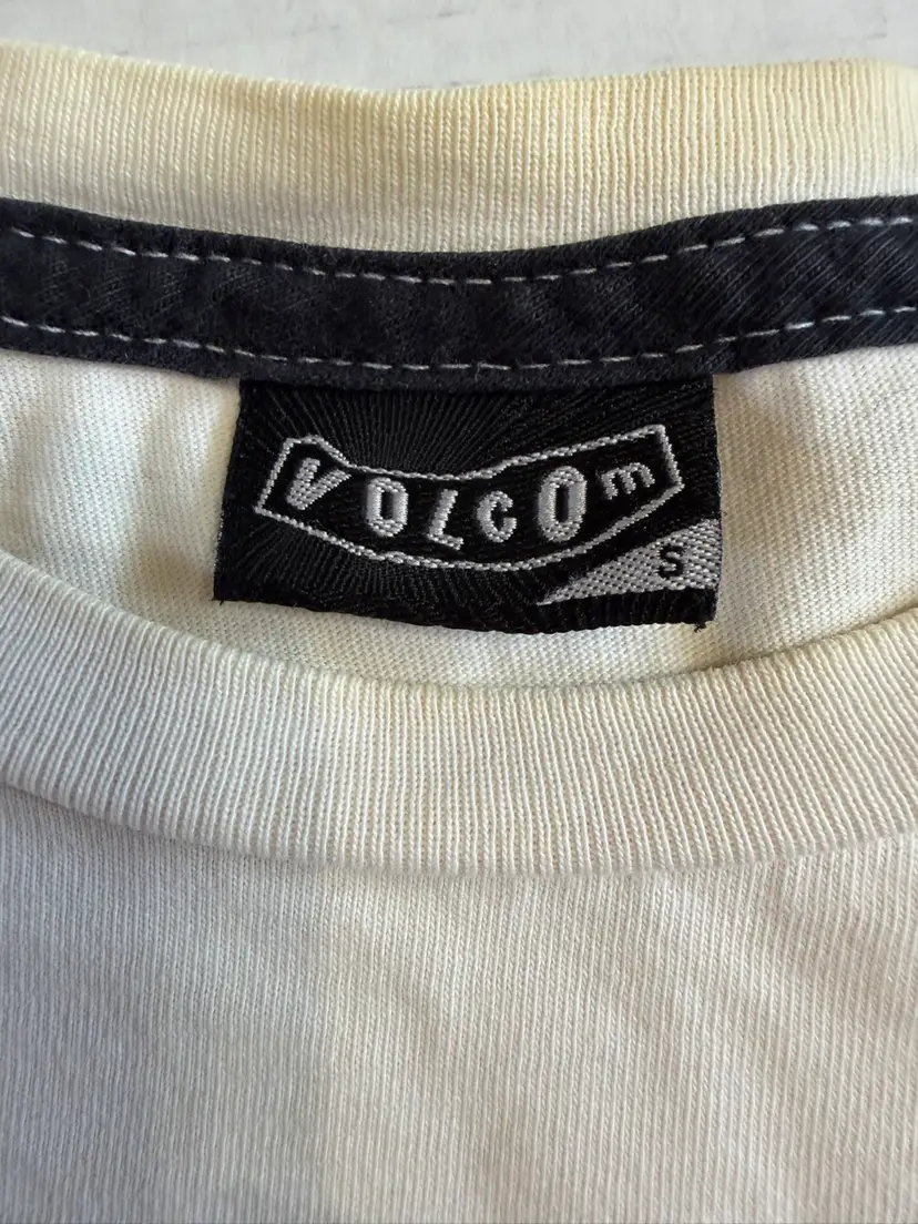 The Volcom Vintage Y2K Floral Logo Classic Print White T-Shirt in size small is a classic vintage piece perfect for any fan of grunge and 90s style. Made from breathable cotton knit fabric, this regular fit tee features a solid white color with the iconic Volcom logo as accents. With short sleeves and a crew neckline, this unisex shirt is easy to care for and suitable for all seasons, making it a versatile and comfortable addition to any wardrobe.