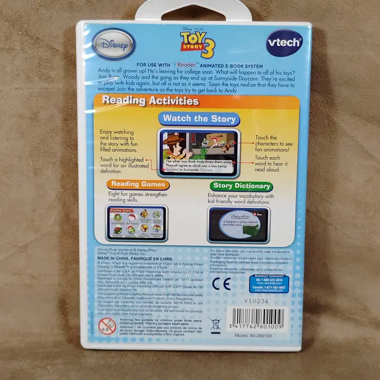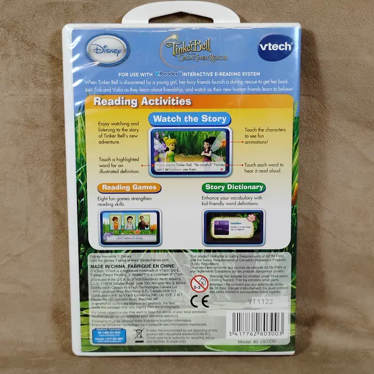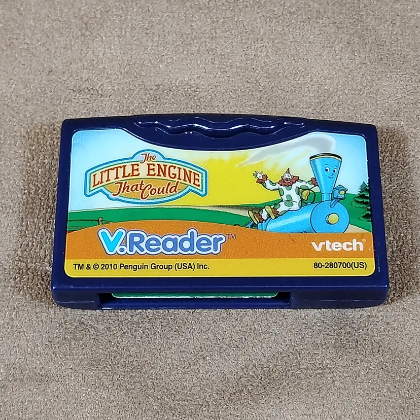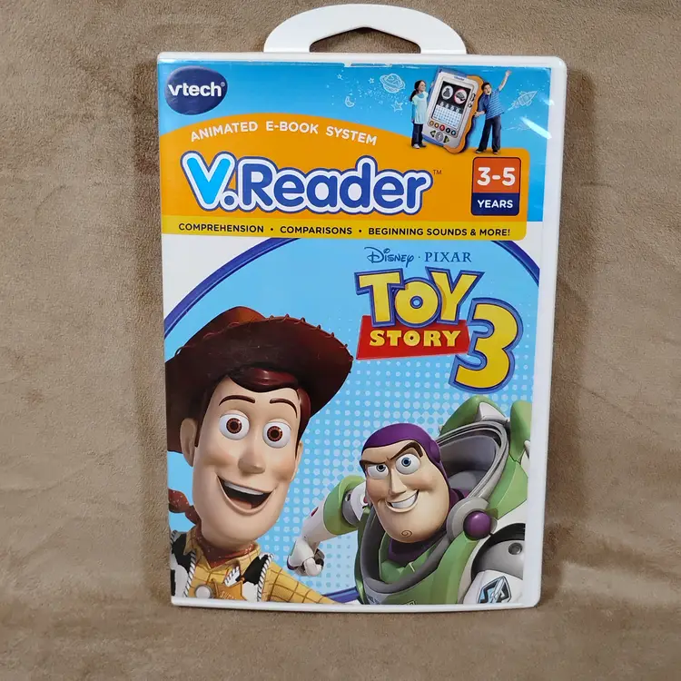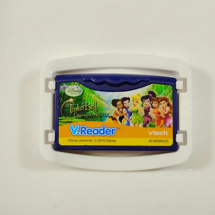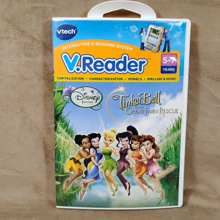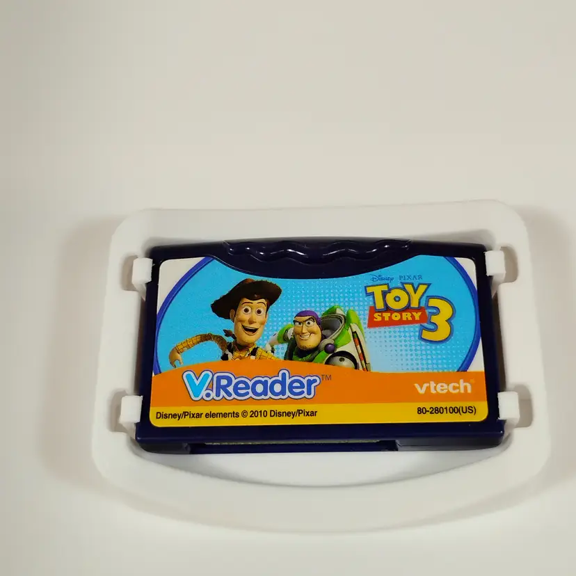 Lot of three VTech V.Reader interactive e-book cartridges with two original cases: Disney Pixar Toy Story 3, Disney Fairies TinkerBell Great Fairy Rescue, and Little Engine that Could (cartridge only). All show normal light wear and are untested, sold as pictured—great for adding to your child’s V.Reader library or replacing missing favorites.