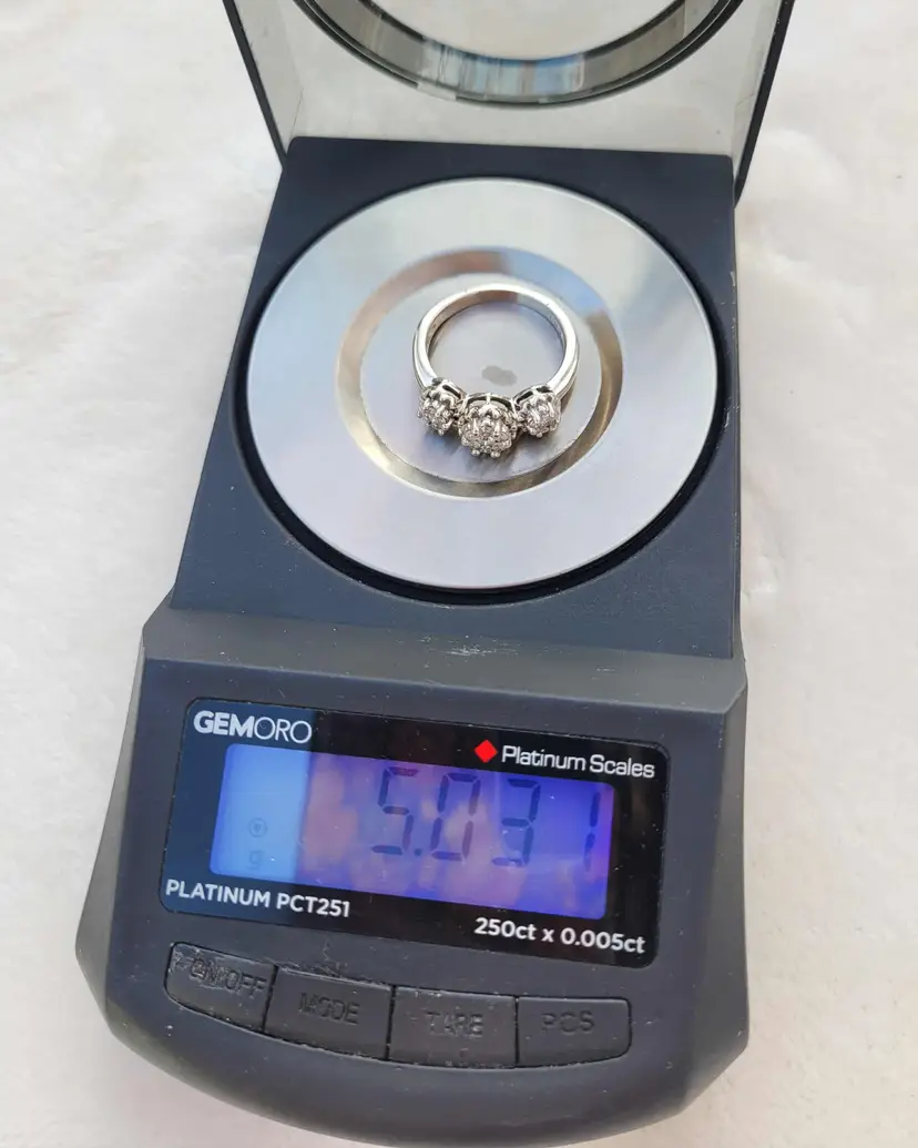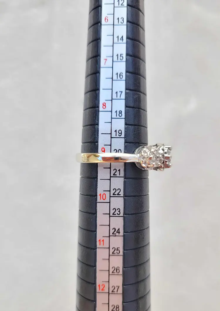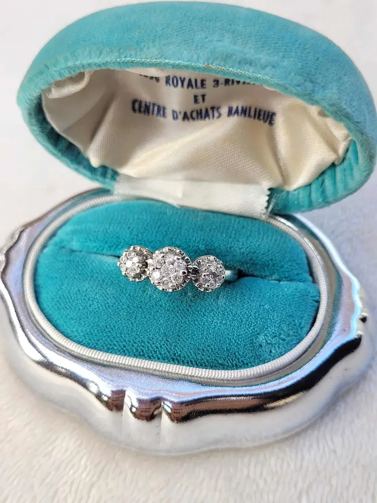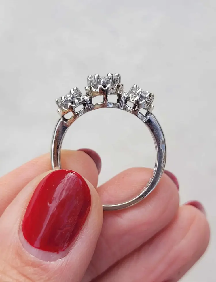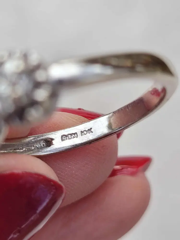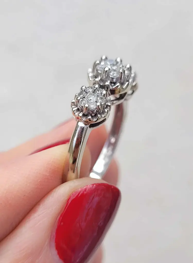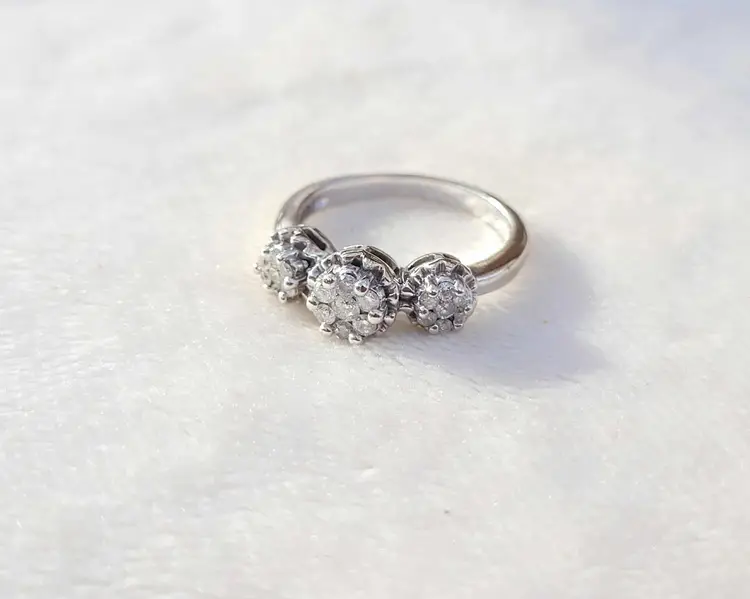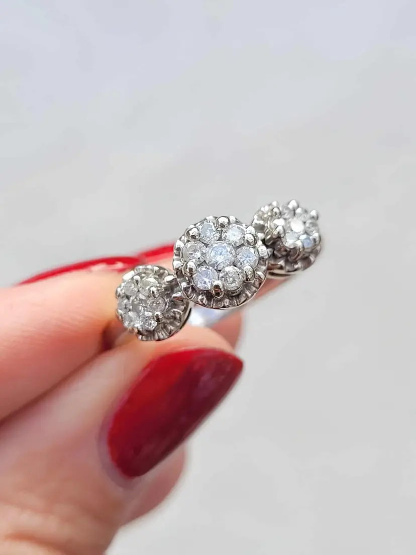 Stunning solid 10k white gold ring with 21 sparkling genuine diamonds in three feminine floral-shaped clusters! This would make a wonderful wedding ring or Christmas gift. The diamonds are natural and are verified via Presidium tester and microscopy. There is variance in UV-reaction as would be expected for natural diamonds as well. It is marked 10k with the gold content verified via Auracle tester and acid testing. Due to the setting we're unable to get a depth measurement on them and therefore cannot get an accurate carat measurement, but the measurements are as follows, approximately- (Center cluster) Center diamond- 2.5mm Halo diamonds- 2mm each