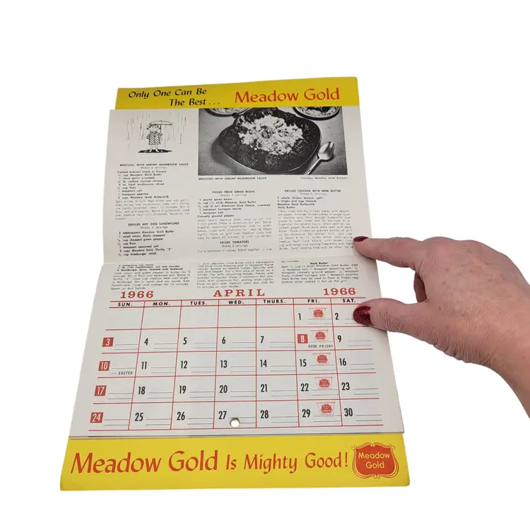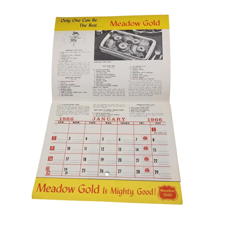 Step back into 1966 with this charming Meadow Gold calendar, blending festive cheer and culinary delights. Adorned with seasonal recipes and tips, it evokes nostalgic warmth.
