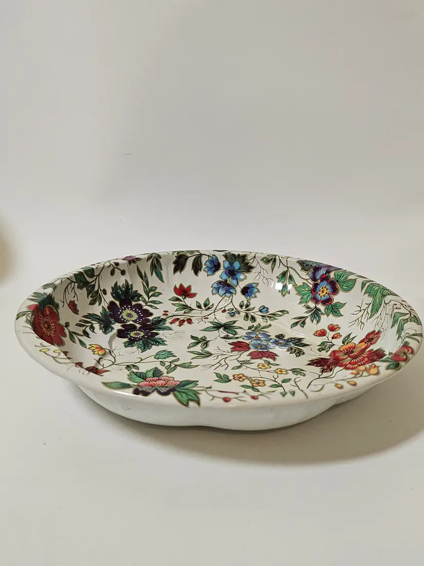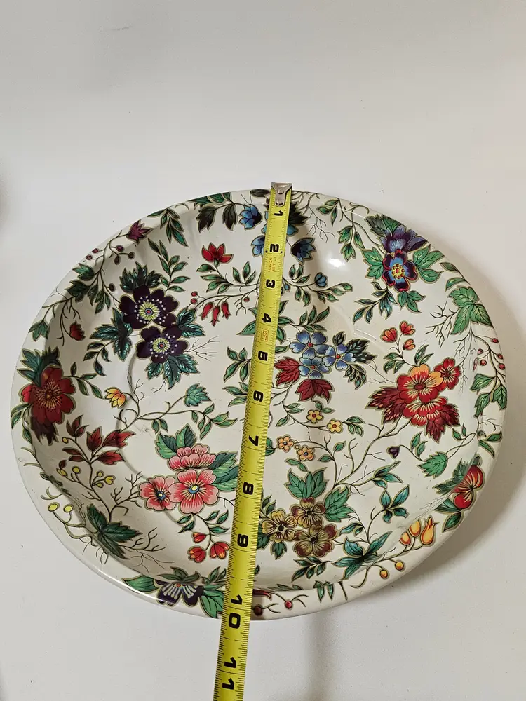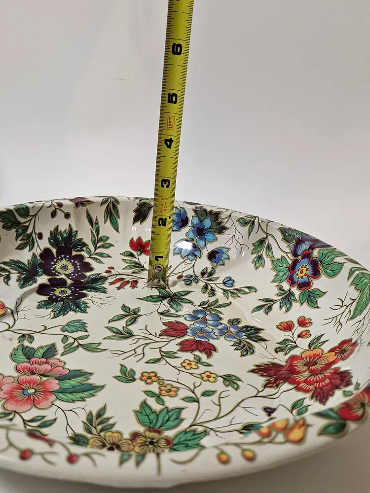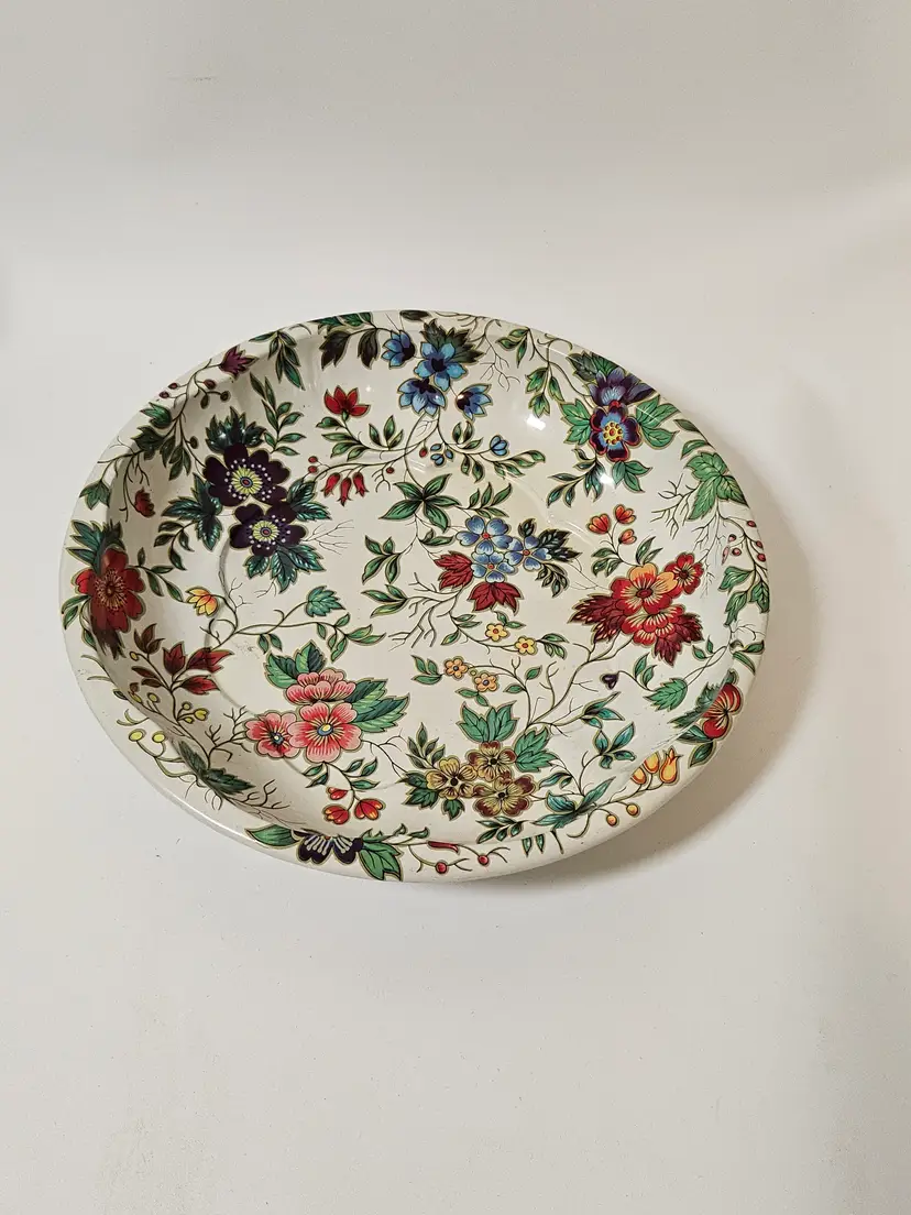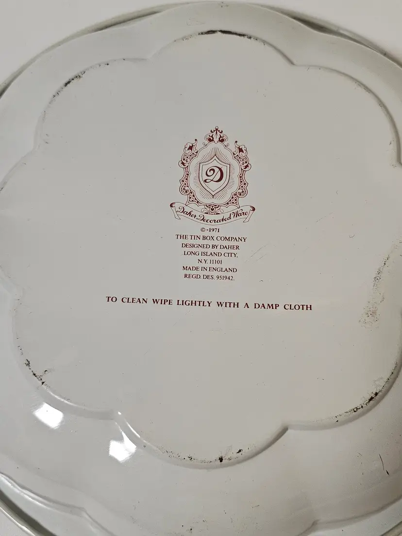 This vintage 1971 Daher Tin Box Co metal tin bowl, made in England, features a vibrant and colorful floral design. With a diameter of 10 inches, this unique piece of metalware is a collectible item that adds a touch of nostalgia to any space. Perfect for storing small items or as a decorative piece, this tin bowl is a charming addition to any collection of vintage tins or British memorabilia.