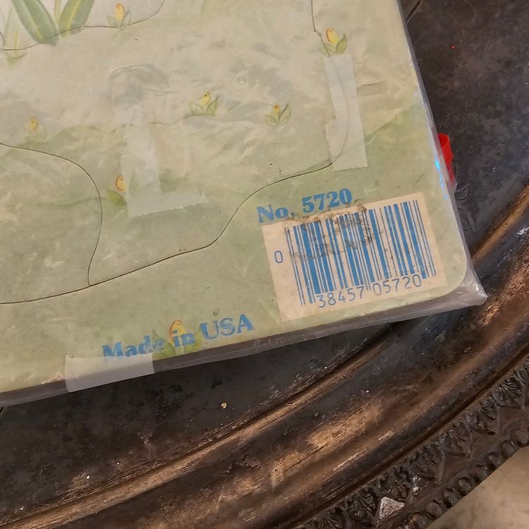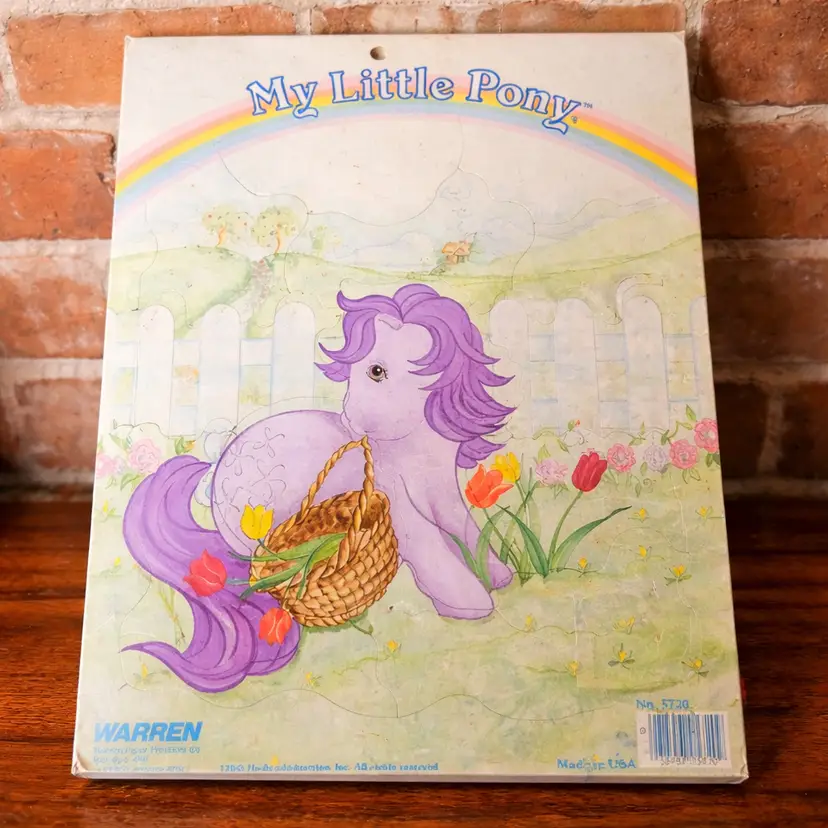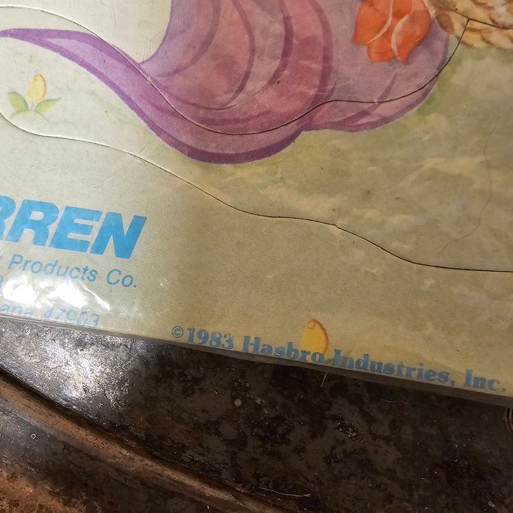 Condition: Good vintage condition. Puzzle is complete with all pieces intact. Shows light age wear, minor edge wear, and gentle surface discoloration from storage (see photos). Still bright and charming — displays beautifully!