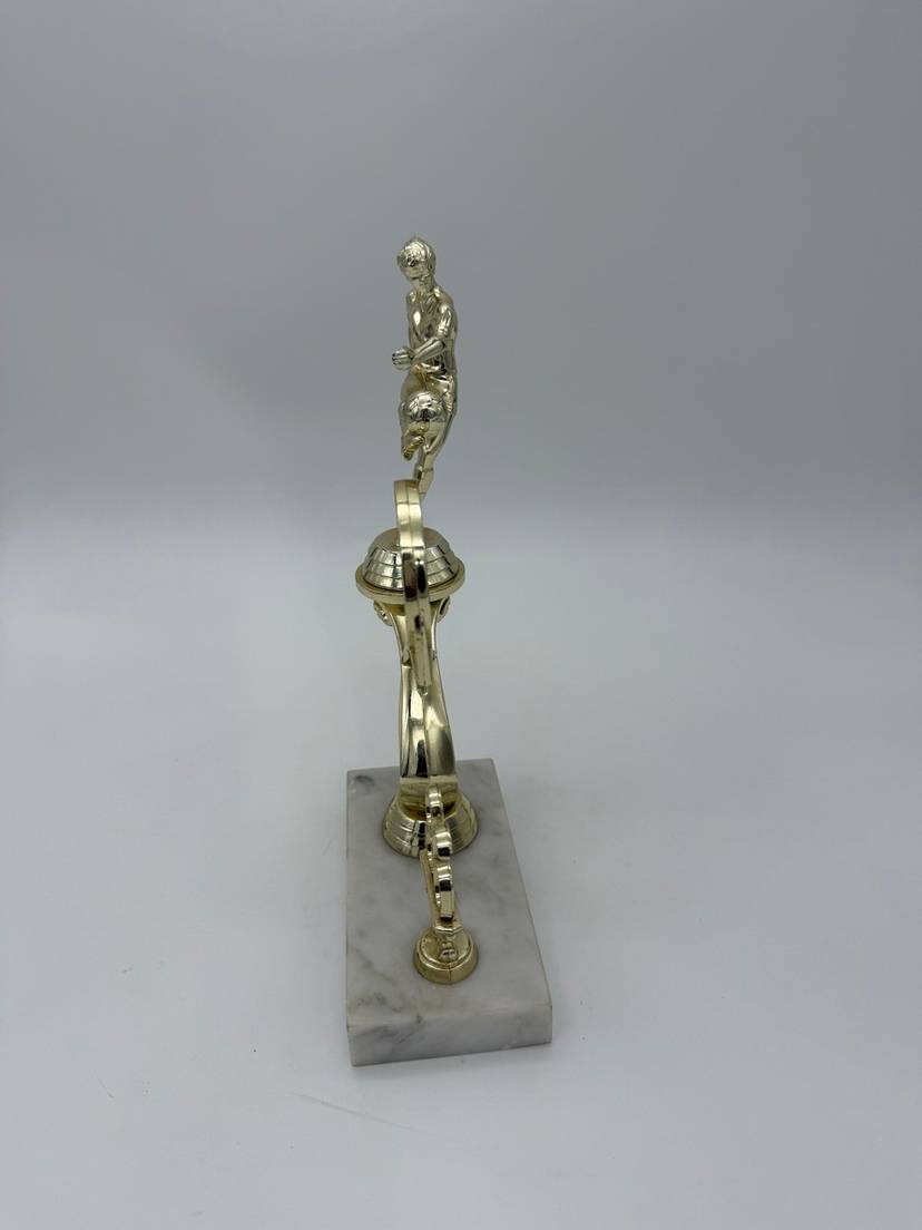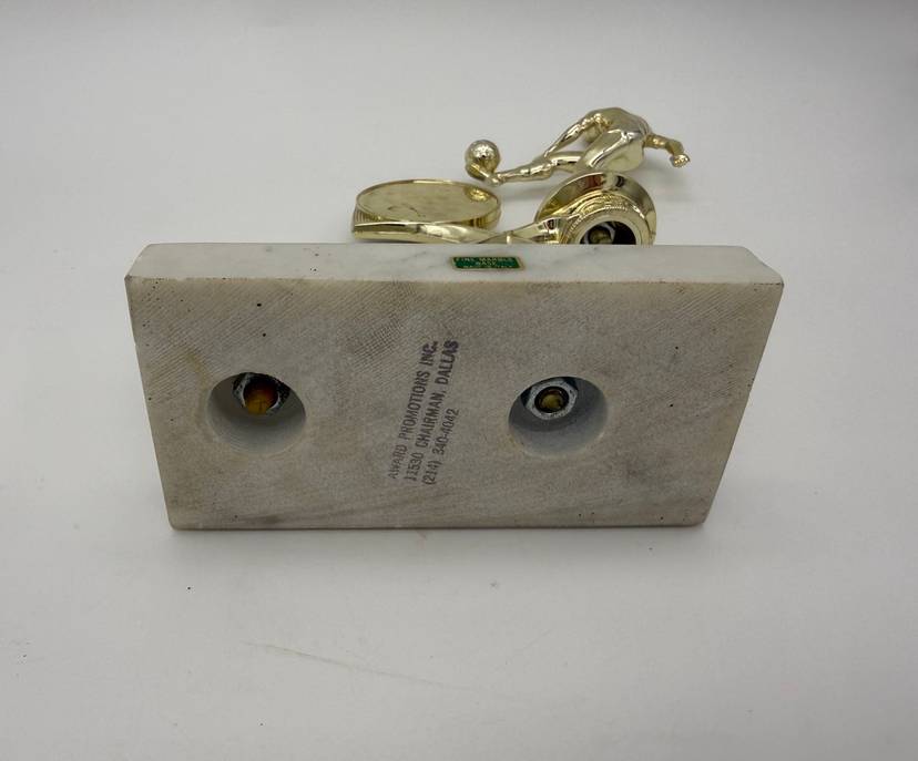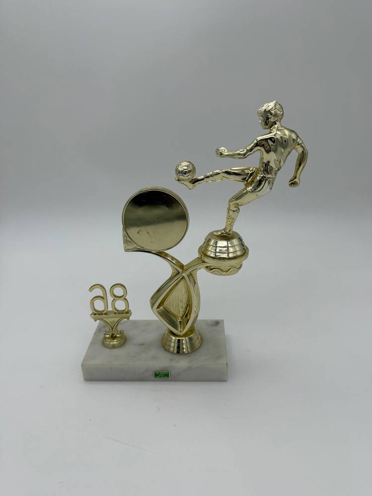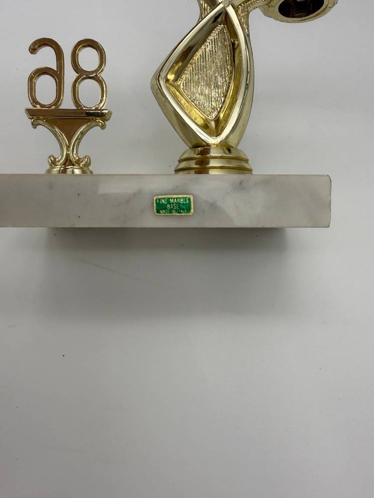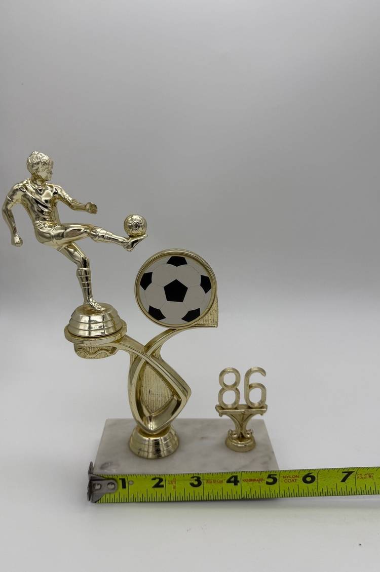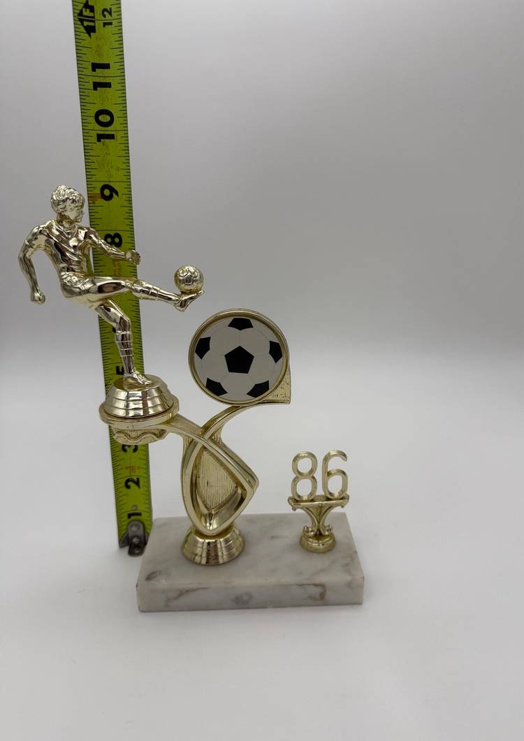 This vintage 1986 plastic male soccer ball trophy mounted on a marble base stands at 9 inches tall. The silver and gold mix column and topper colors complement the gray stand, creating a unique and elegant design. Made by Award Promotions Inc, the trophy is a representation of excellence in soccer, featuring a plastic topper and a sturdy marble stand. This Italian-made trophy weighs 2 pounds and 2 ounces, making it a substantial and meaningful award for any soccer player or team.