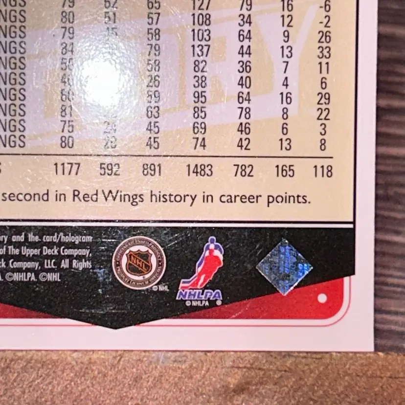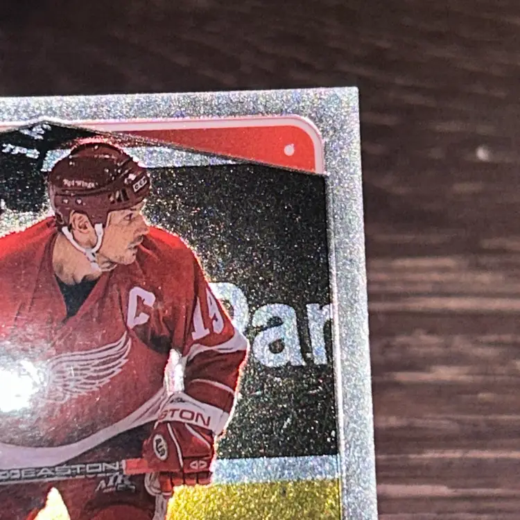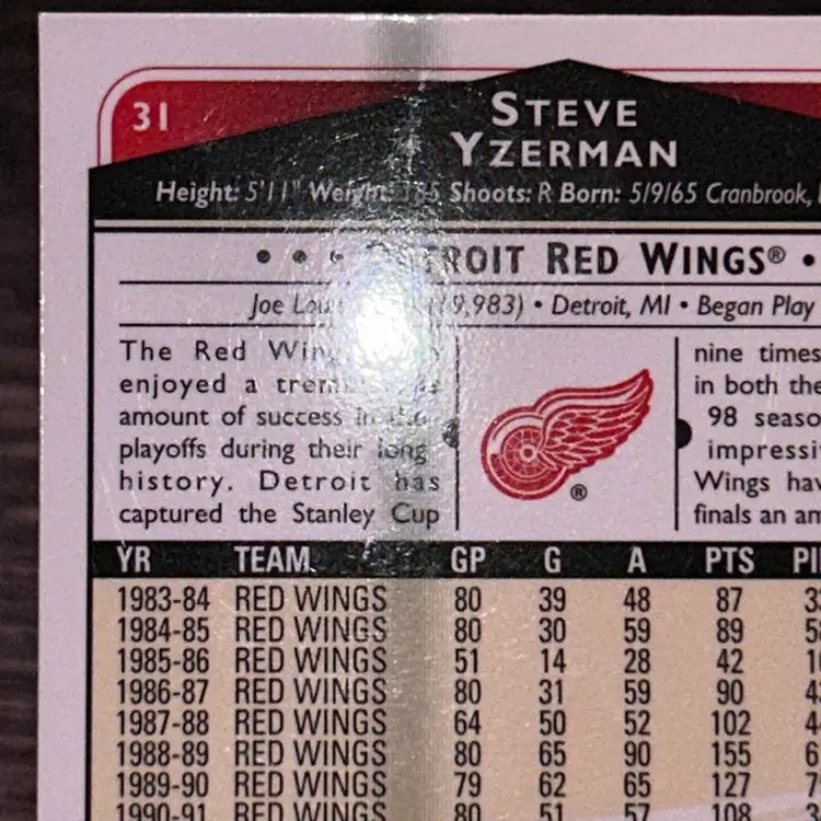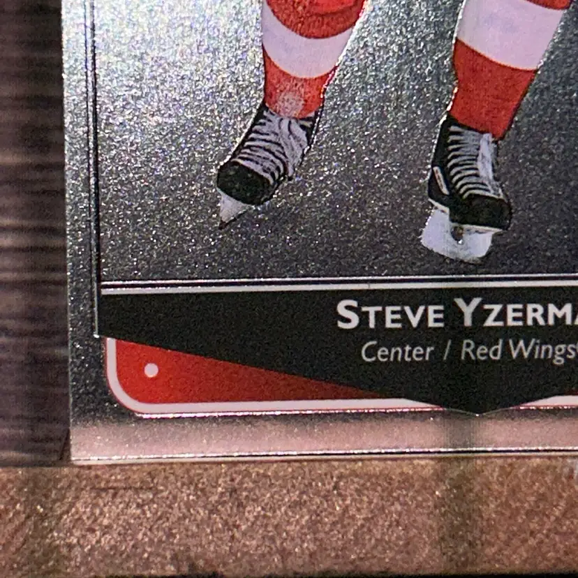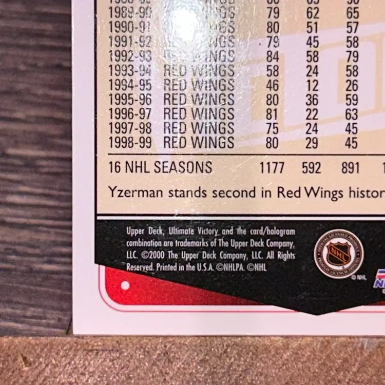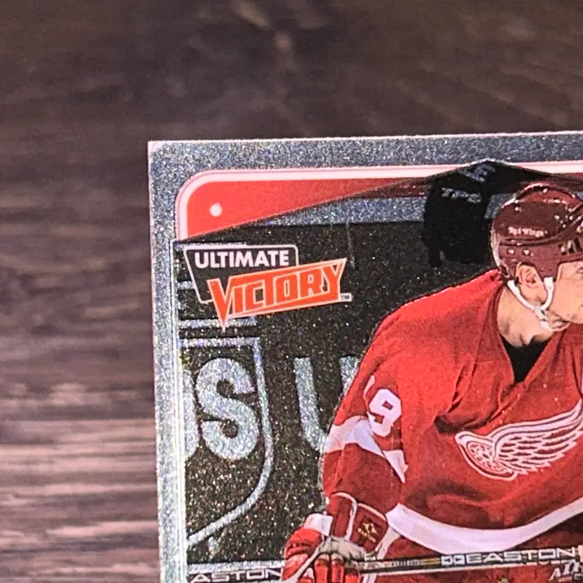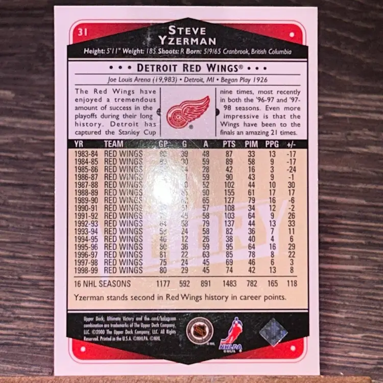 The product is a vintage 1999-00 Upper Deck Ultimate Victory trading card featuring Steve Yzerman of the Detroit Red Wings, a Hall of Famer in the NHL. This original card is made of aluminum, card stock, and metal with a hologram chrome foil variety, adding a unique touch to the collectible. The card is in English and showcases Yzerman in his Detroit Red Wings uniform from the 1999-00 season, making it a valuable addition to any sports trading card collection for fans of ice hockey and vintage memorabilia.