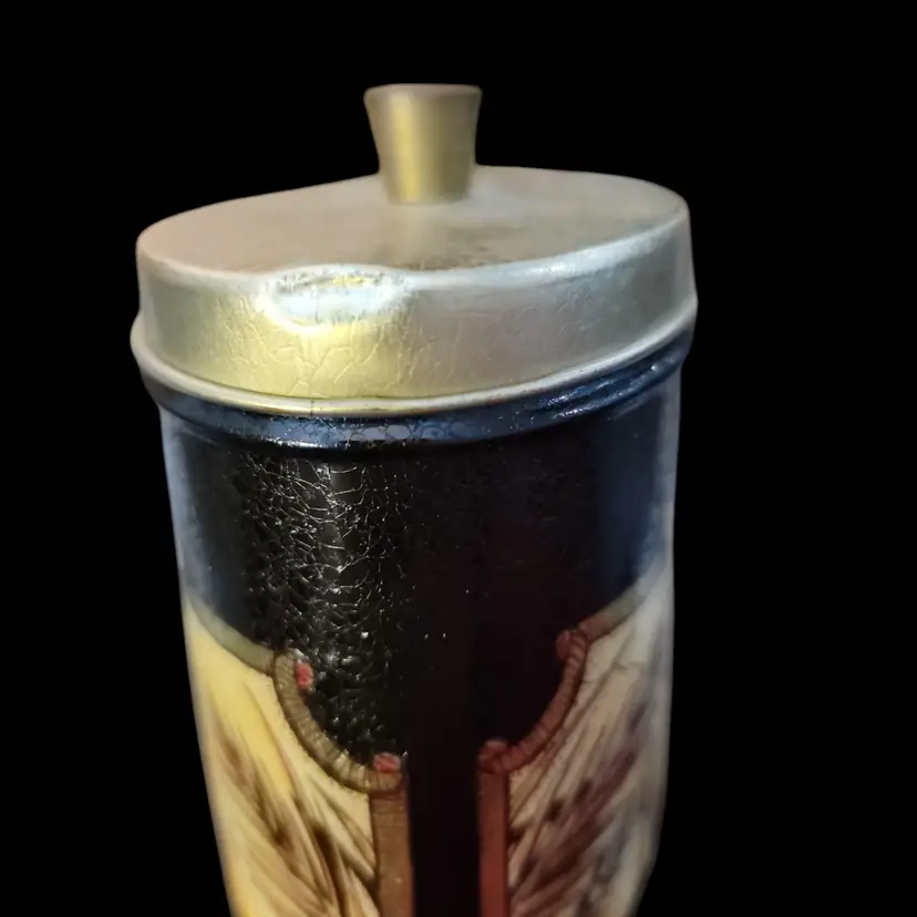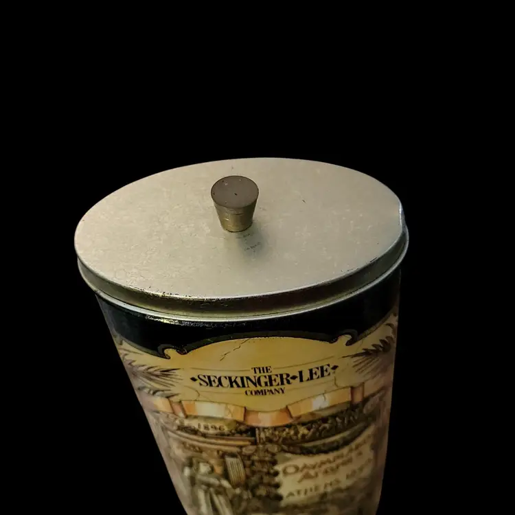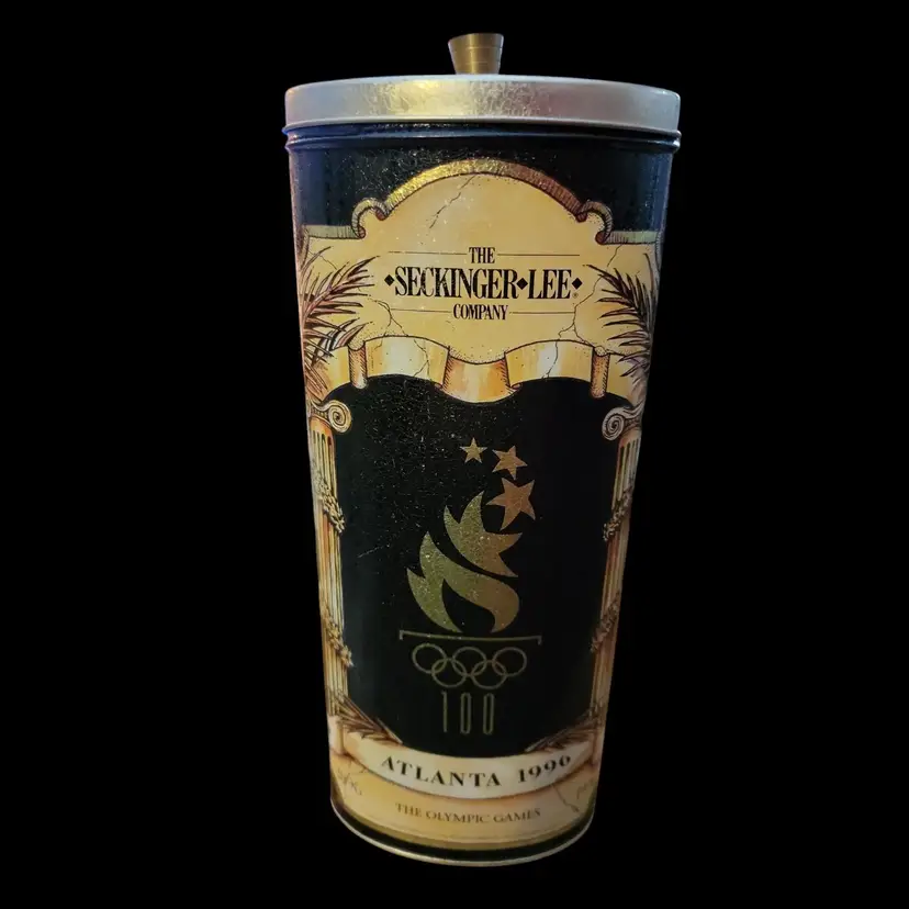 This is a 100th Olympic Games Atlanta 1996 collectible bisquit tin by Seckinger Lee Co, with a size of 10 1/2". The lid has a small dent on the far side. See photos.