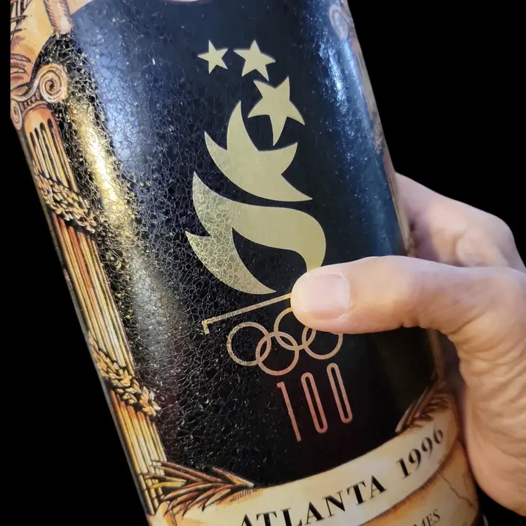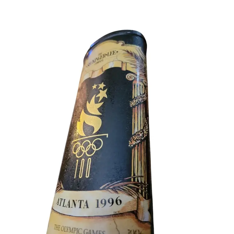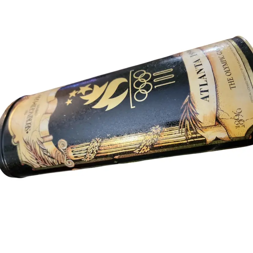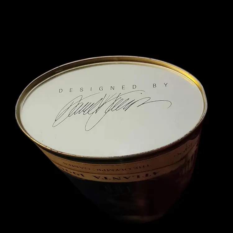 The tin features a multi-color design and is officially licensed. The tin is signed by the designer under Seckinger Lee and has a depth of 10 1/2". The inside is pristine. It is a unisex adult item related to the 100th Olympic Games Atlanta 1996 event and sport.
