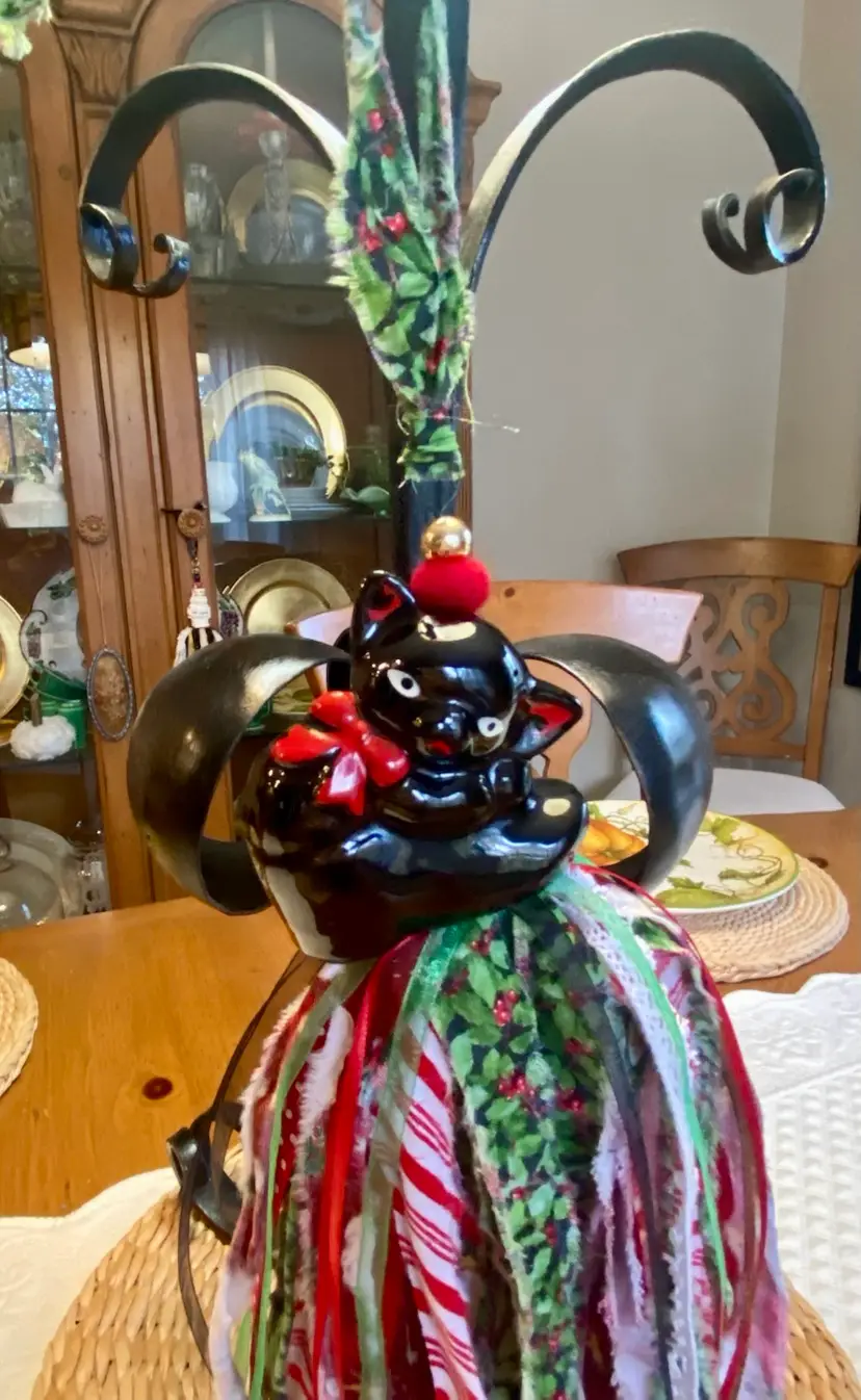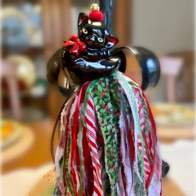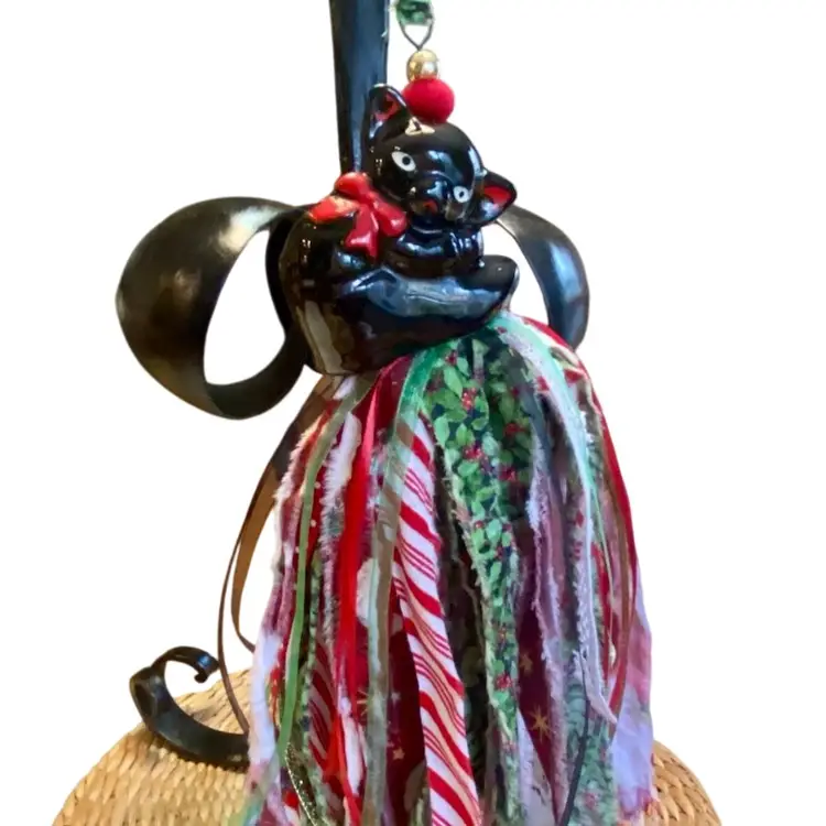 Upcycled vintage ceramic salt shaker using fabric strips, ribbon, crochet trim and beads. Approx 16 inches