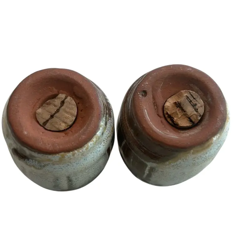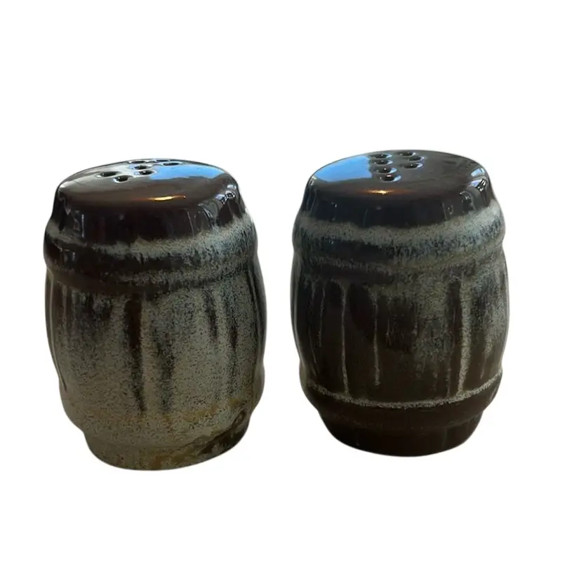 They feature a rustic, barrel-shaped design with a distinctive two-tone drip glaze effect, dark brown on top fading into a lighter, speckled beige or off-white base. The shakers are made of ceramic pottery and typically have removable stoppers at the bottom for filling. They measure approximately 2 inches tall.