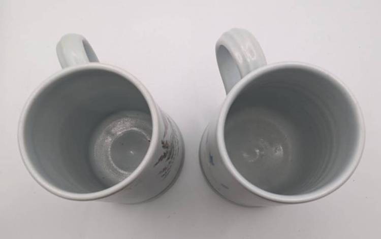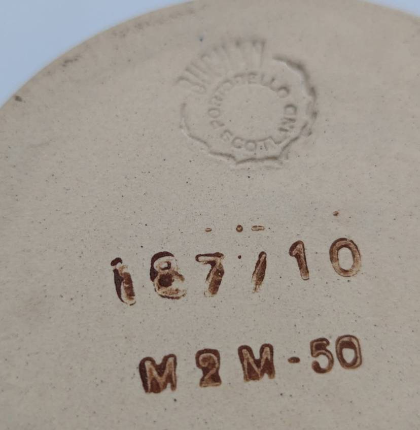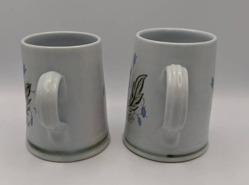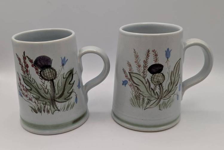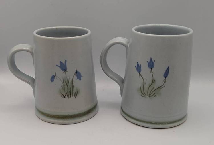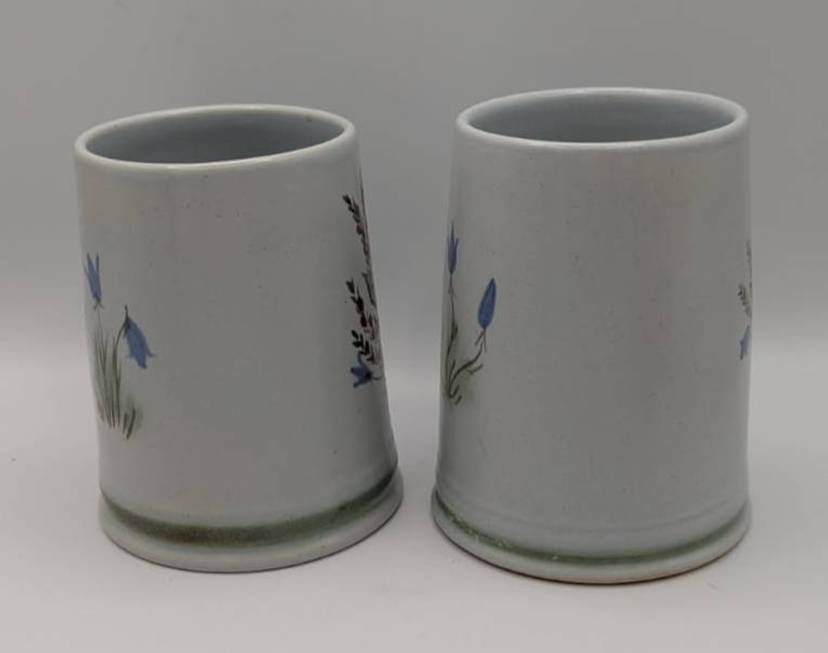 These are vintage Buchan Thistle with Blue Bells- part of the Thistleware collection. These mugs are also referred to as Tankards, due to shape. They are imprinted on bottom with the Buchan Portobello Scotland markings. 187/10 M2M-50 Measures:4.25 inches tall, Diameter of mouth 2.5 inches, base diameter 3.25 inches.