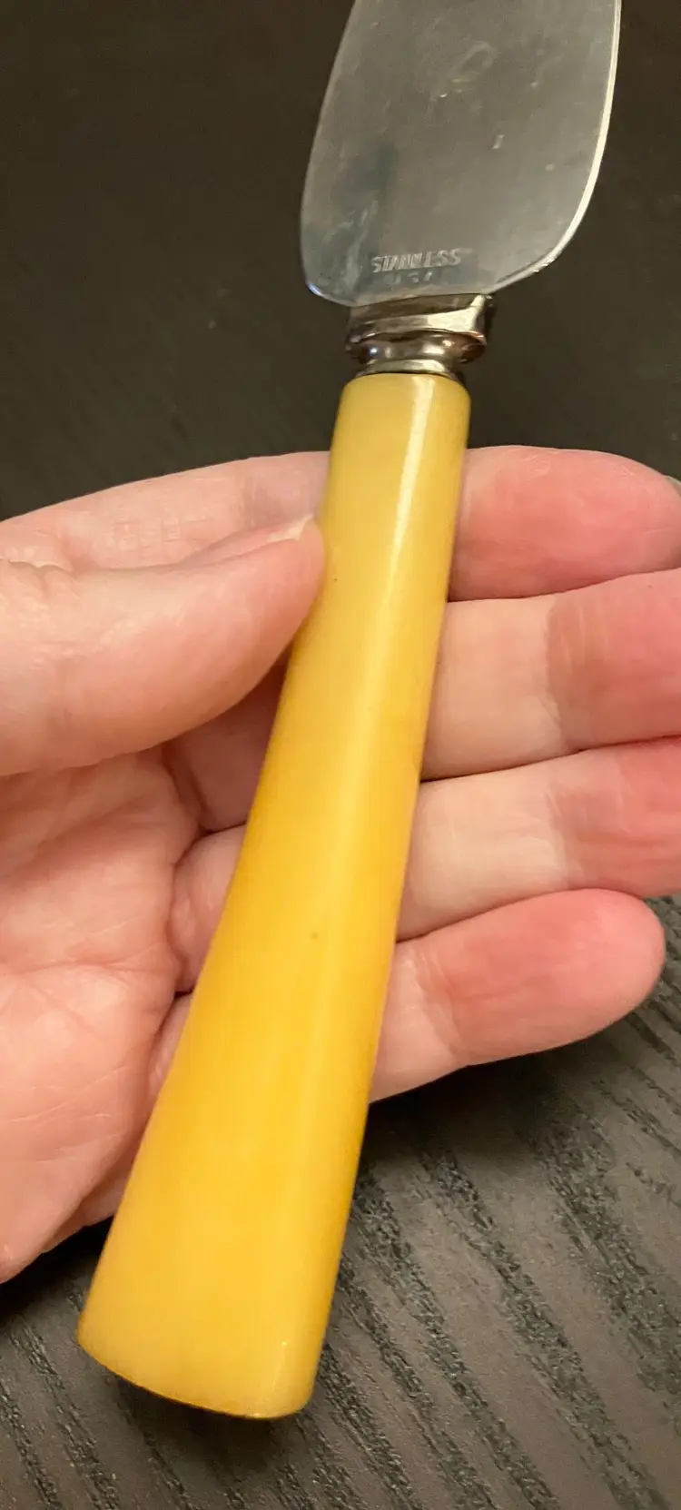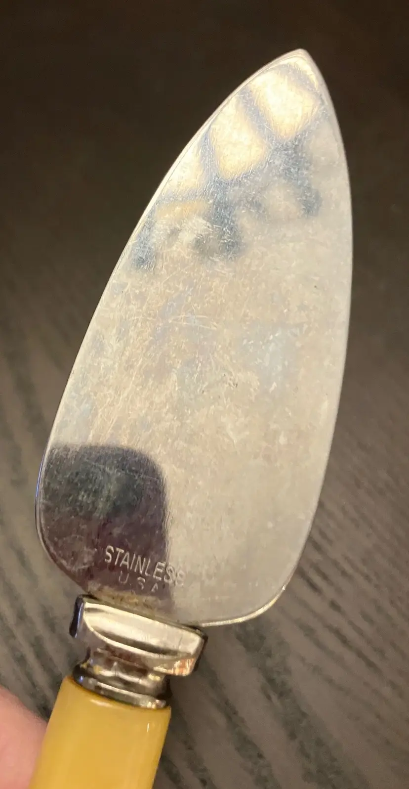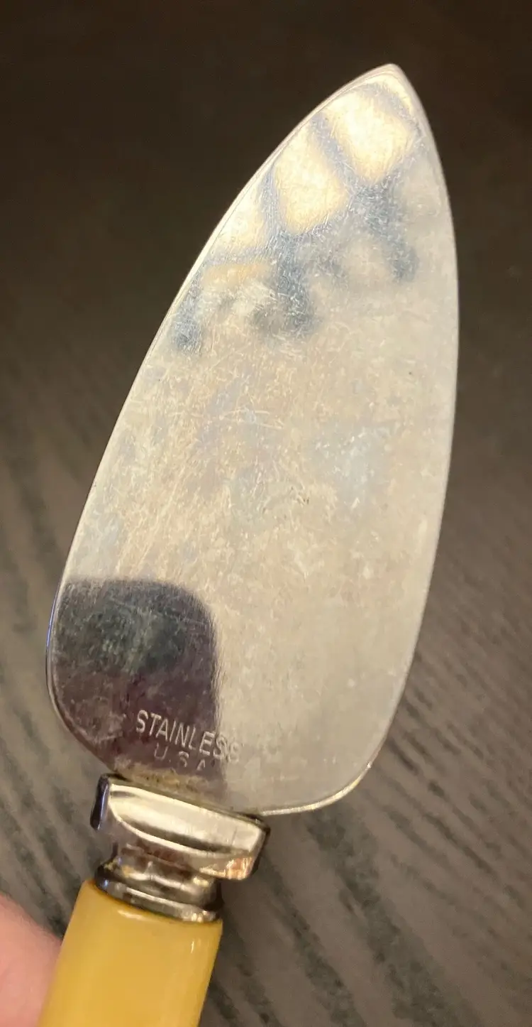 Blade is stainless steel. No chips or cracks. Wear and tear as seen in the photos. No chips or cracks. Not serrated. 7" long, 1 1/4" widest part of the blade.