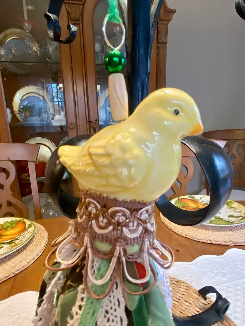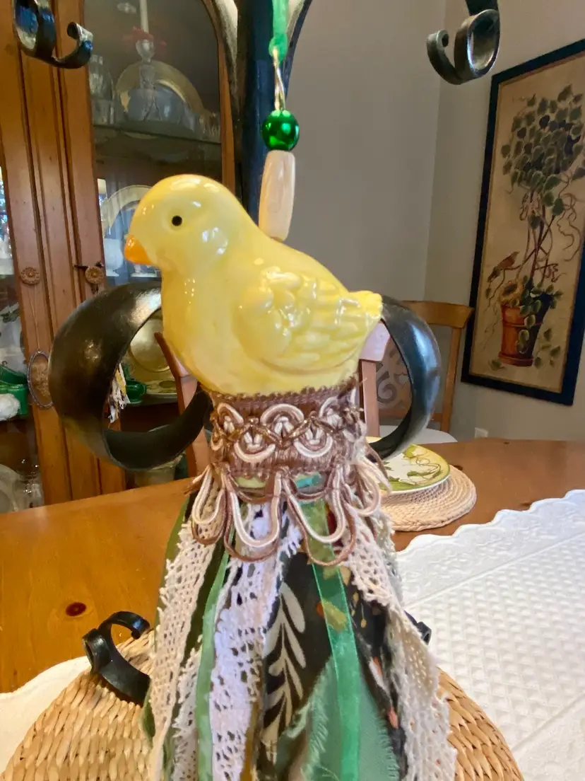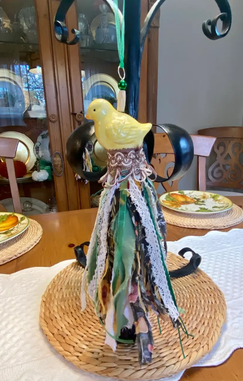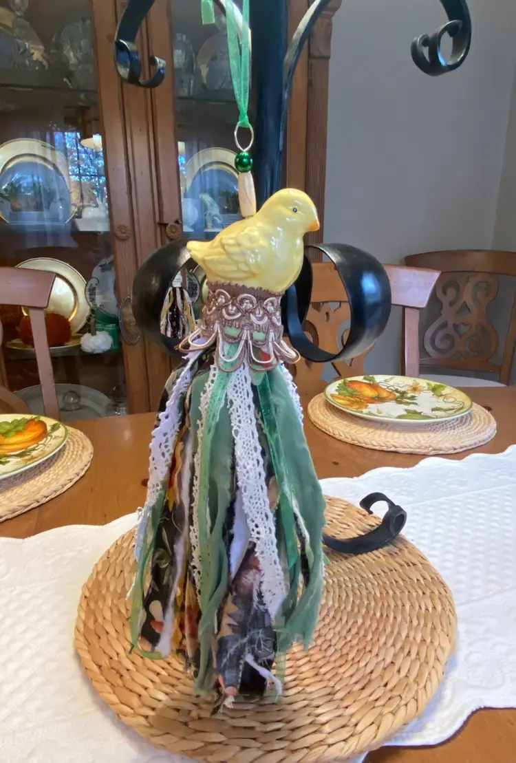 Upcycled vintage ceramic salt shaker using fabric strips, ribbon, crochet, trim and beads. Approx 16 inches