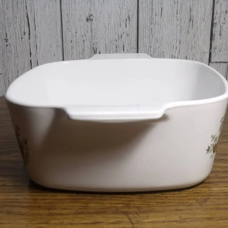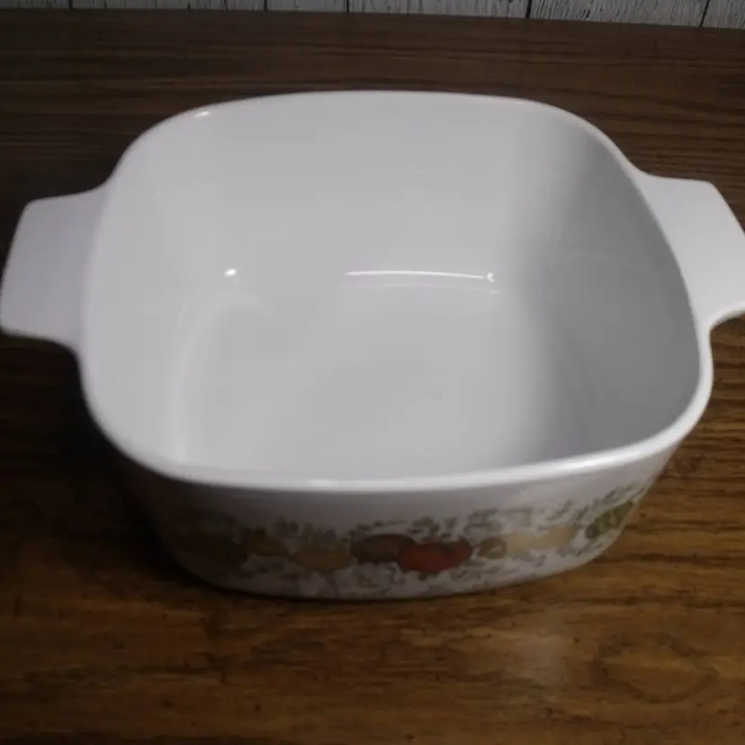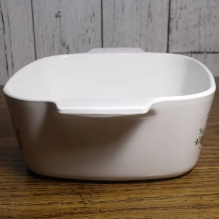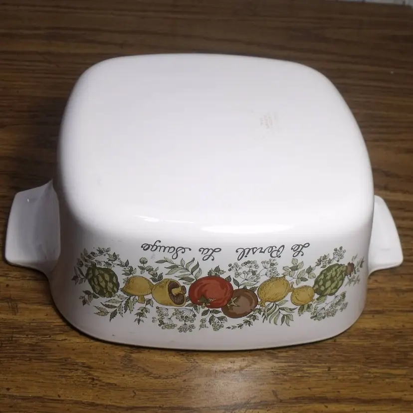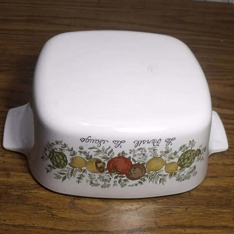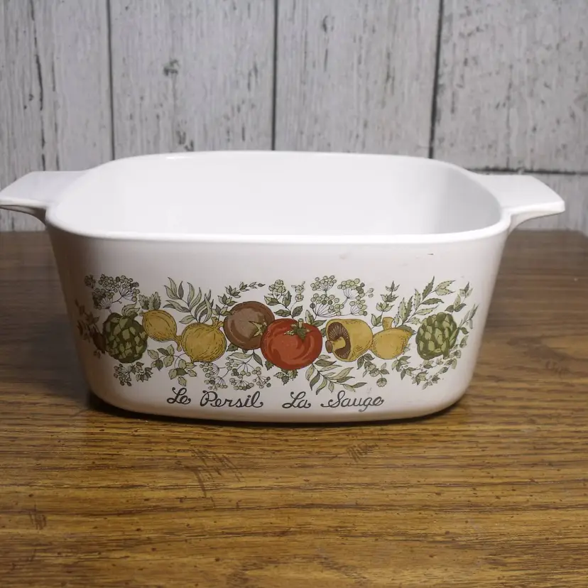 The Vtg Corning Ware Spice of Life Le Persil La Sauge Casserole Dish is a vintage square casserole with a 1.5 quarts capacity. Made of ceramic with a glossy finish, this mid-century modern piece features a unique Spice of Life pattern in multicolor. It is suitable for electric, gas, and microwave ovens, and is easy to clean with its flat-bottomed design. The casserole was manufactured in the United States during the 1980s and bears the embossed CorningWare backstamp, making it a collectible item for those interested in decorative cookware.
