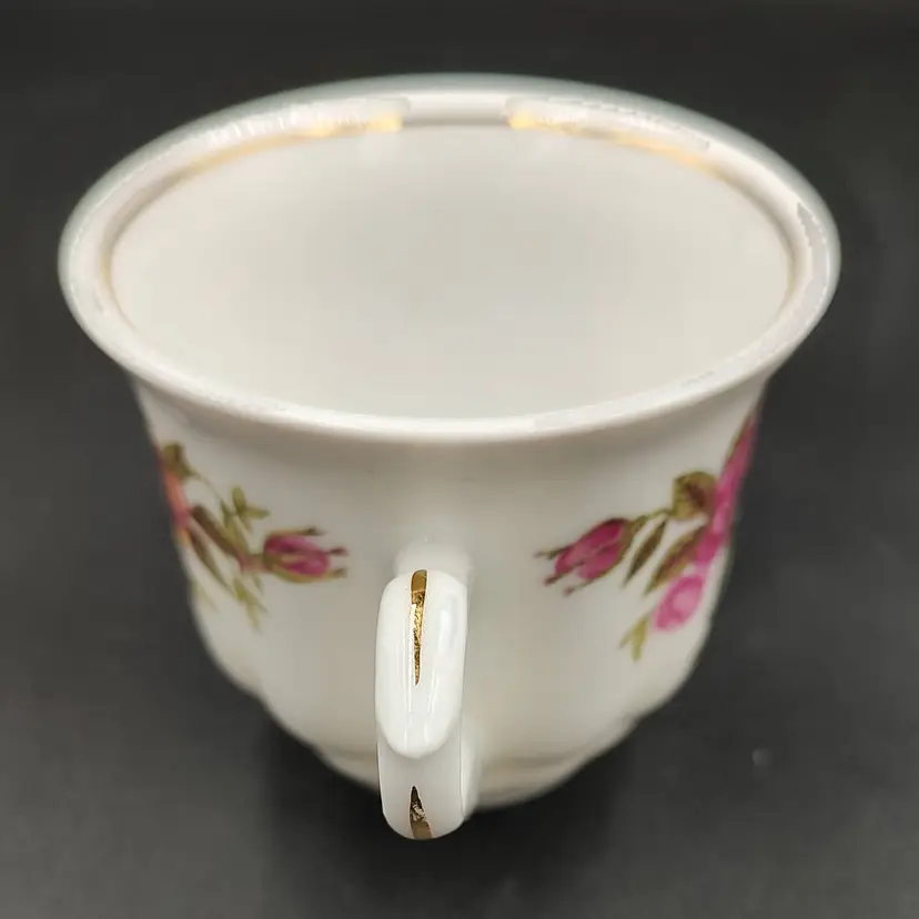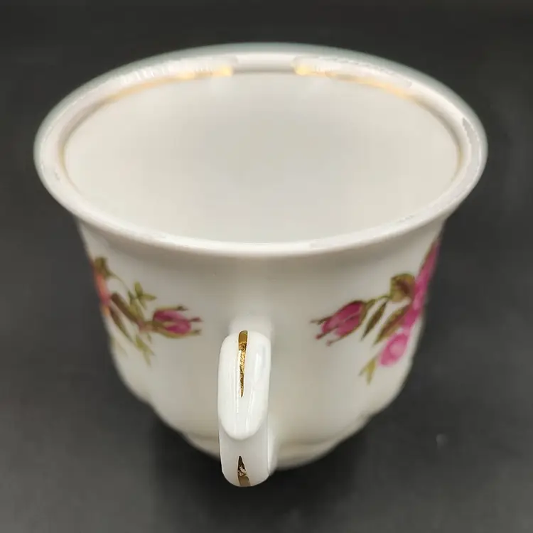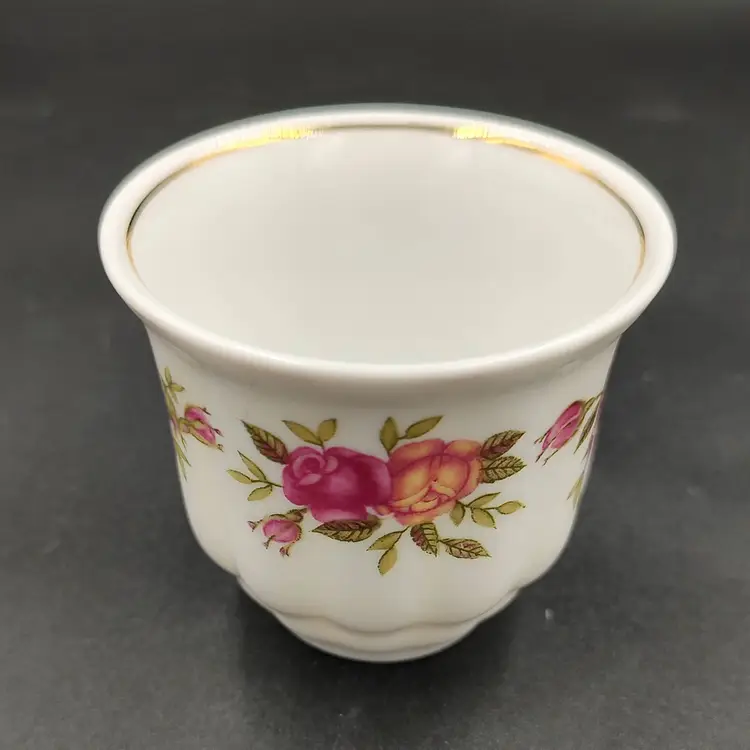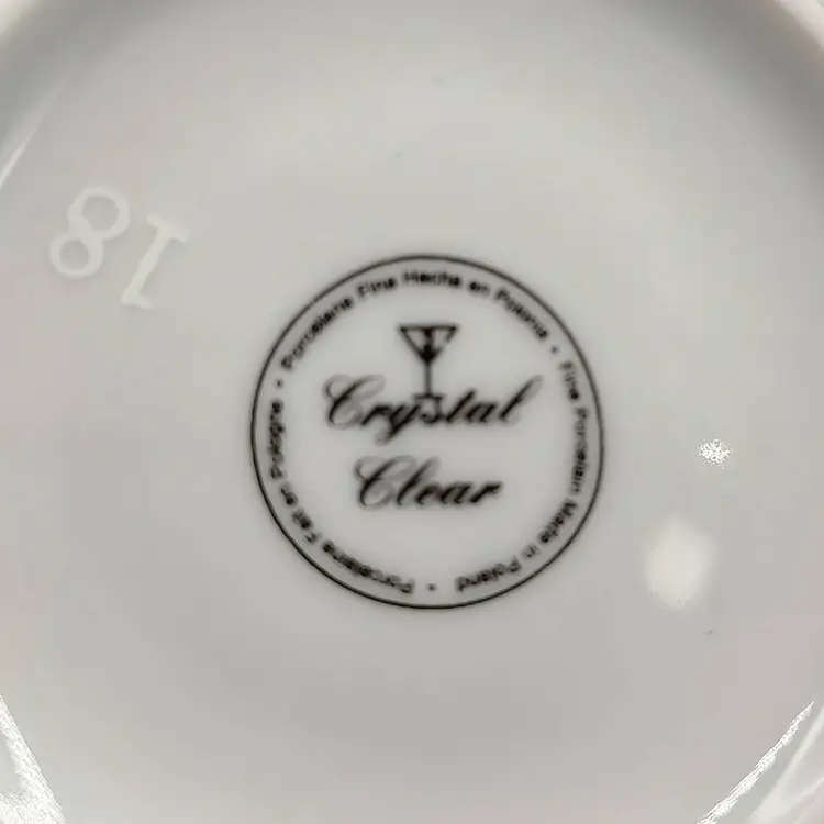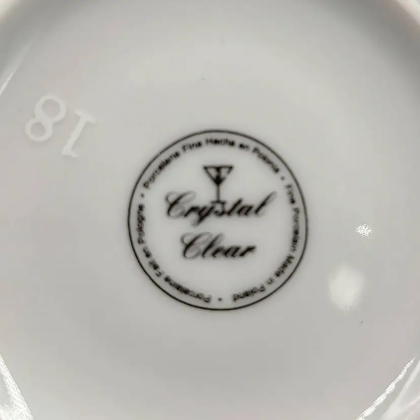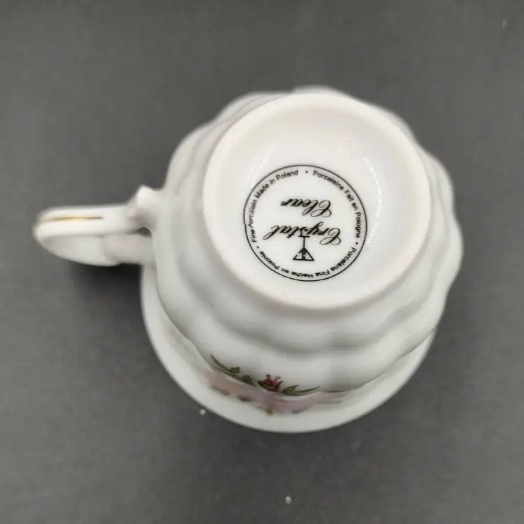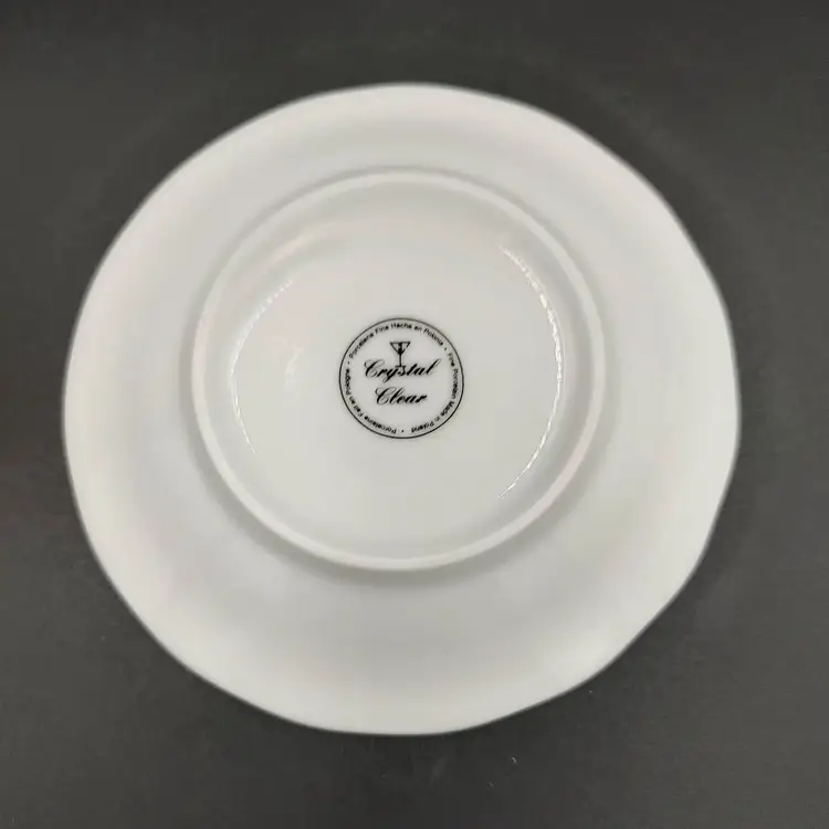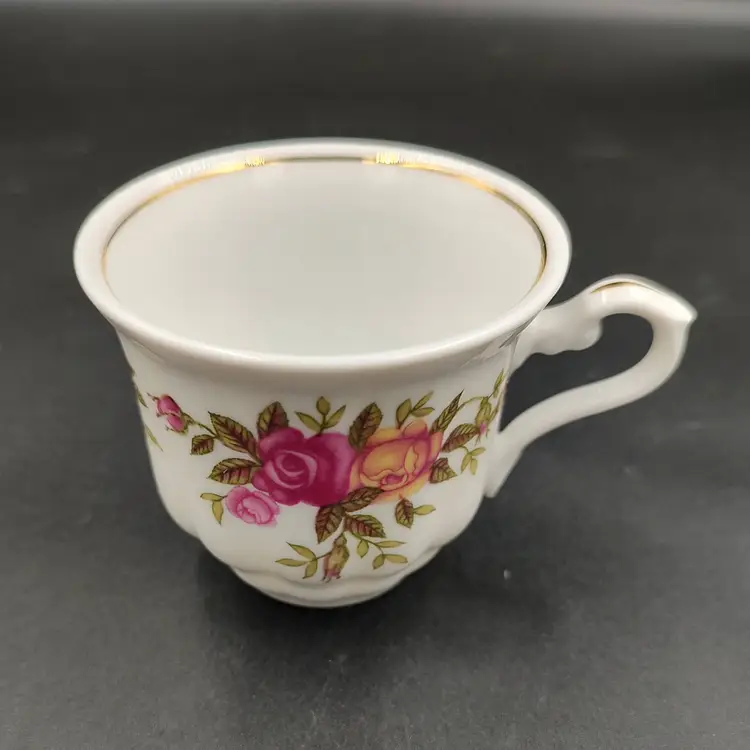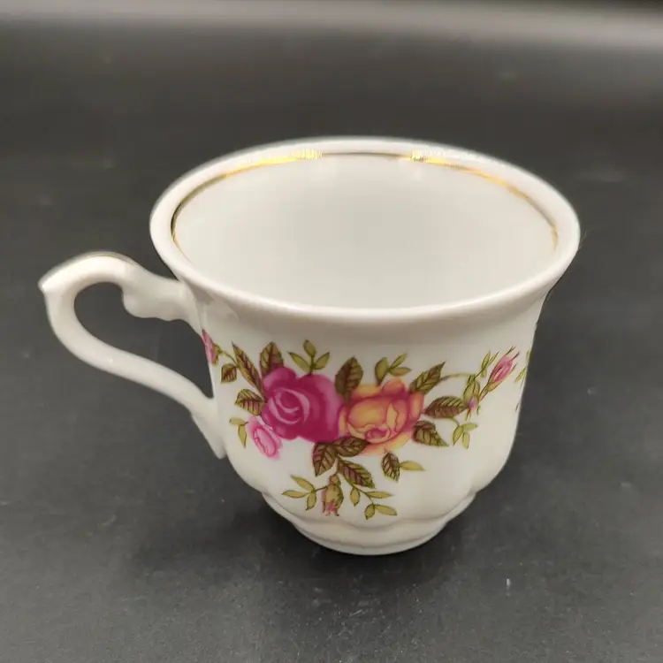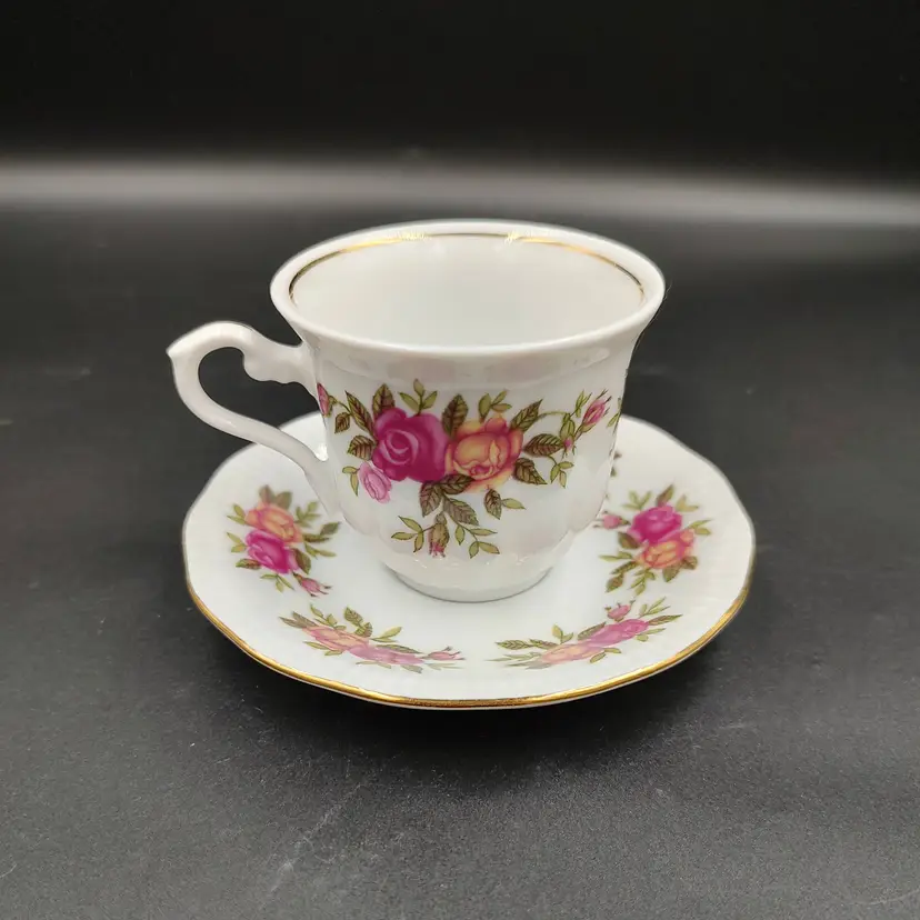 Vintage 2000 Crystal Clear Demitasse Teacup and Saucer Set With Rose Motif and Gold Trim. Height 2.5" x diameter 2.5" holds 4oz Saucer diameter 4.5".Made in Poland