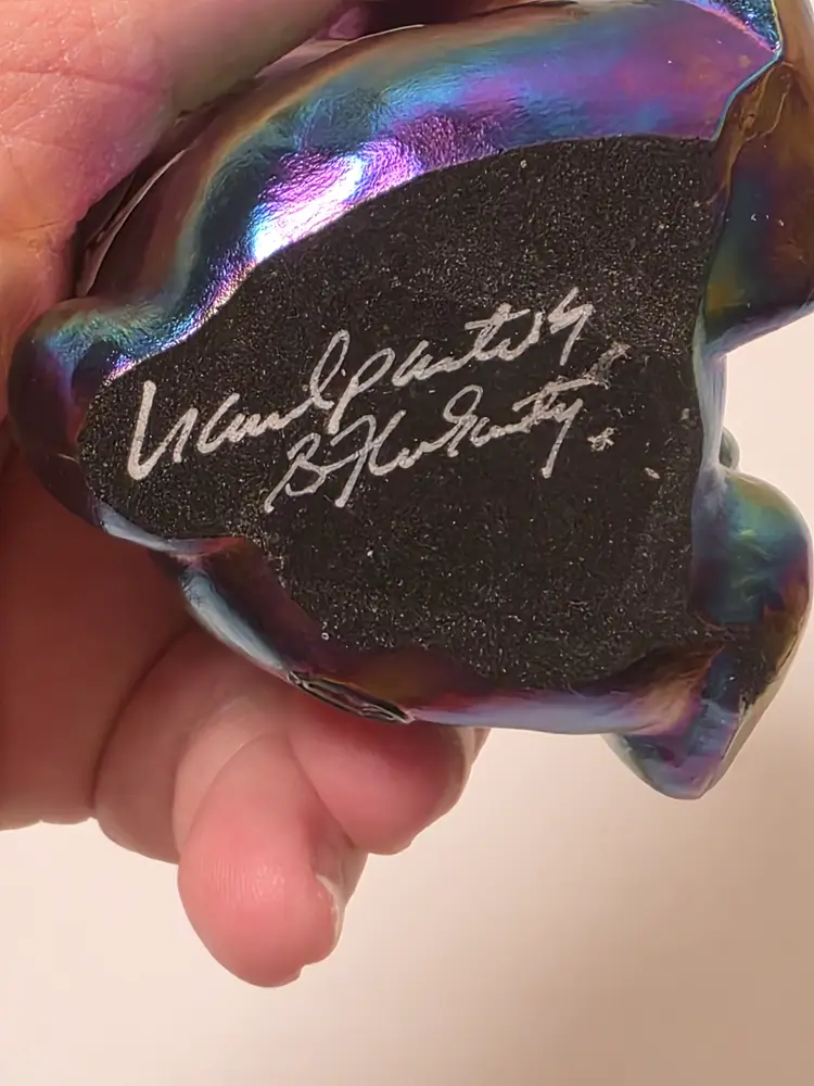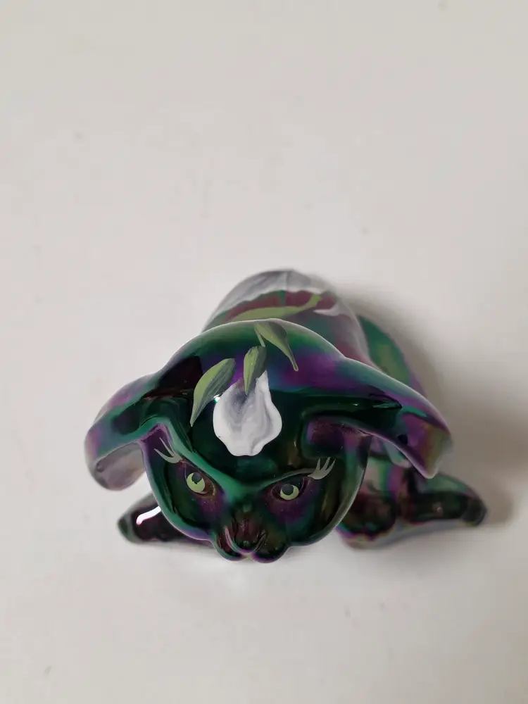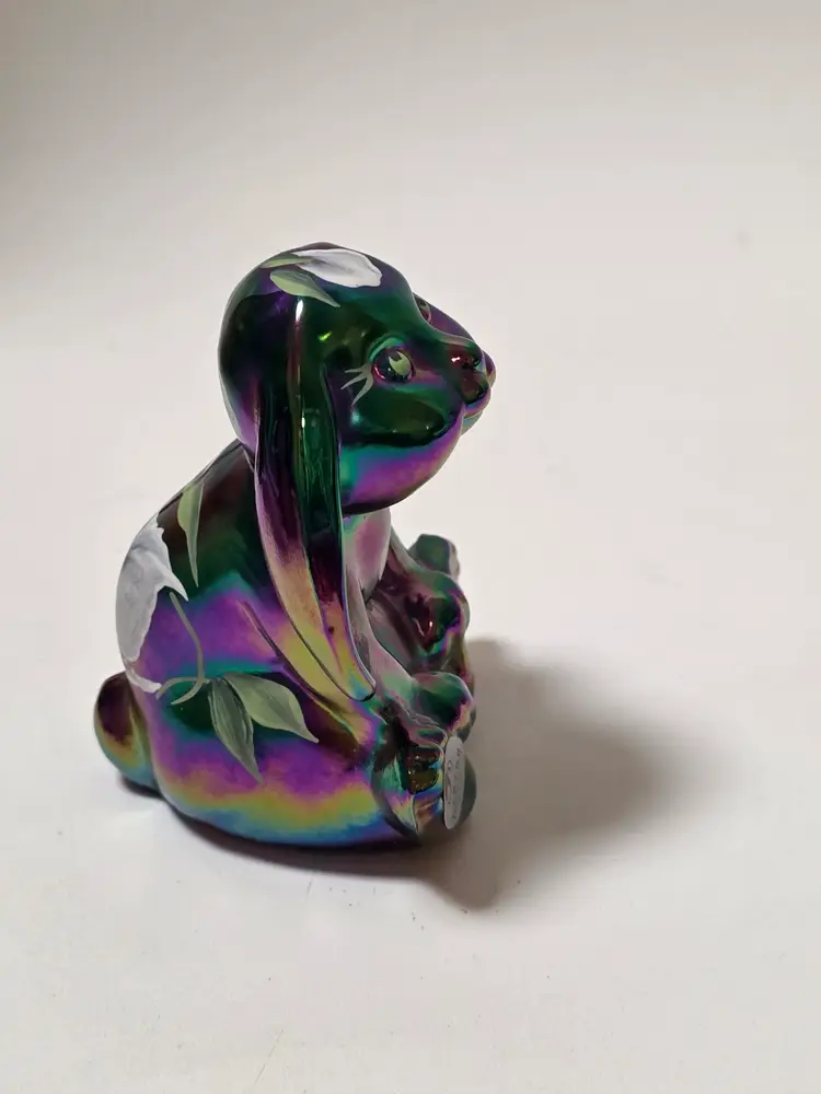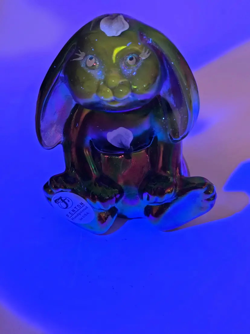 The product is a vintage Fenton carnival glass figurine of a bunny rabbit, hand-painted with a glossy finish. This original studio-crafted piece is themed around Easter and spring time, and features a floppy eared bunny rabbit that glows Manganese green under 365 black light. This is a decorative collectible originating from North America, specifically the United States, showcasing the unique craftsmanship and artistic style of Fenton glassware. Perfect for adding a touch of whimsy and charm to any space, this piece is a lovely addition to any collection of decorative pottery and glassware.