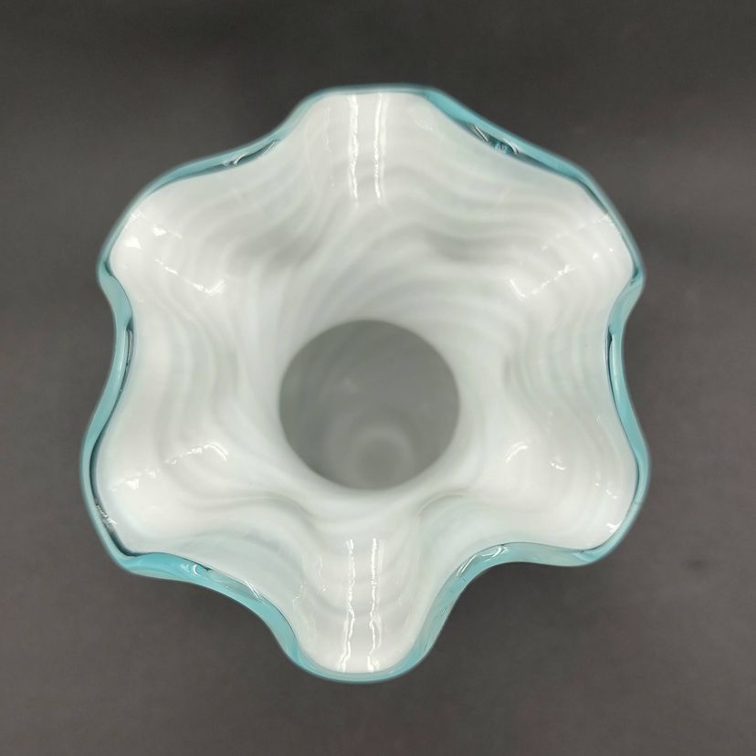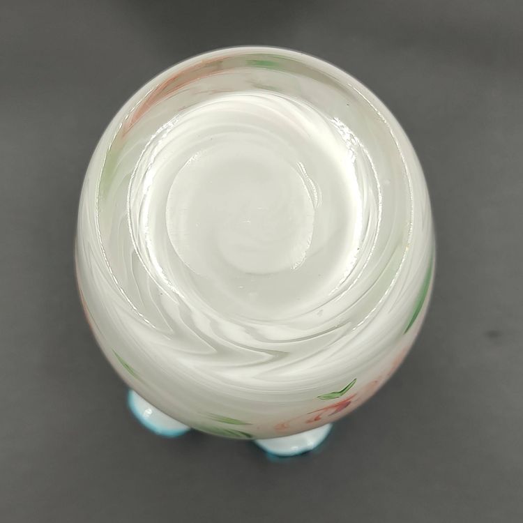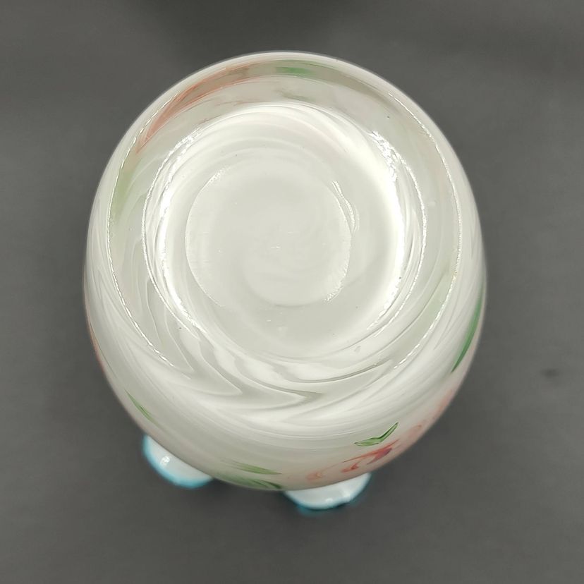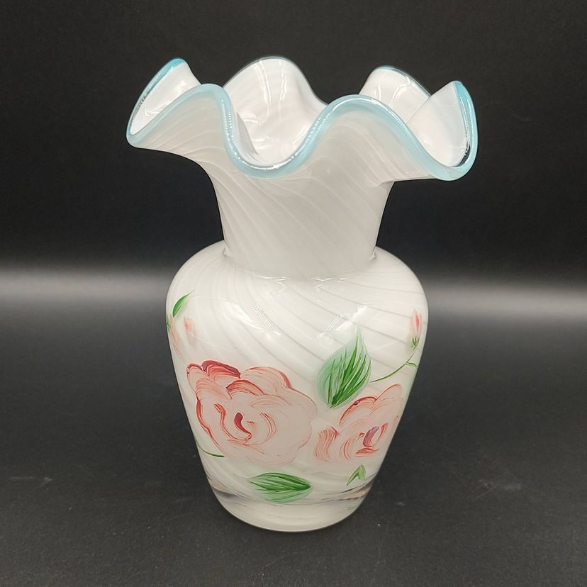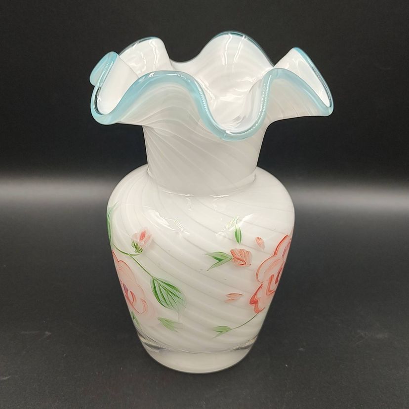 Vintage 1970's Fenton Hand Blown Optic Swirl Blue Crest Hand Painted Floral Motif Vase. Height 6" x diameter 4". Made in the USA