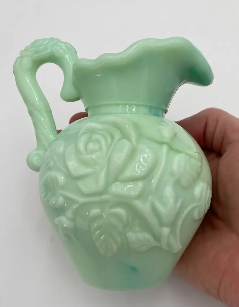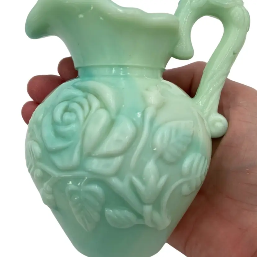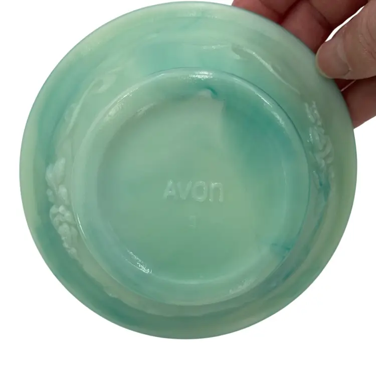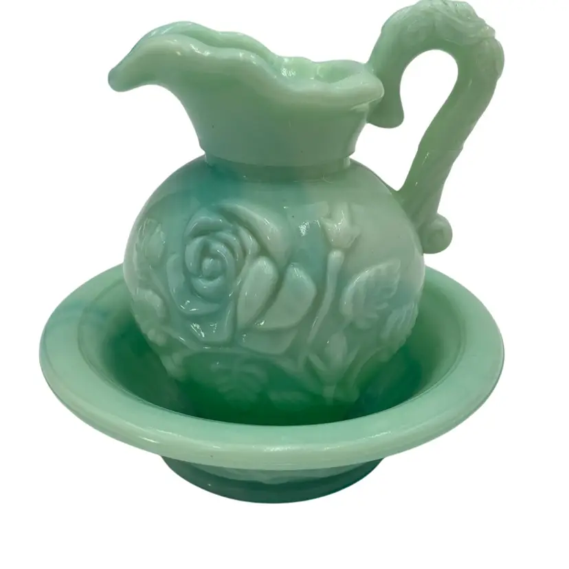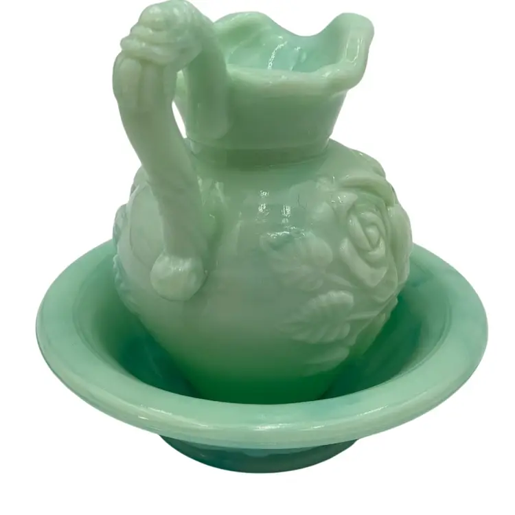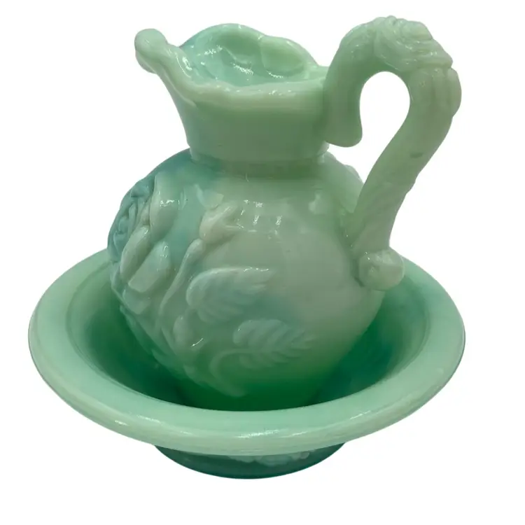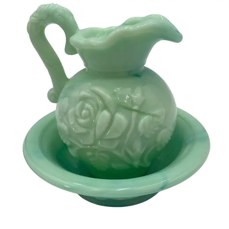 This vintage Fostoria Glass Green/Blue Slag Glass Pitcher & Basin set, featuring the "Victoriana" Roses design, is a beautiful miniature glass jug and basin set. Produced in Moundsville, West Virginia in the 1970s for Avon, this pressed glass jug and basin have a glossy finish and are adorned with embossed roses. This set was for Avon's Skin So Soft line, holding bath oil or cologne. This particular set is heavy on the min green, with a light touch of aqua running through both the pitcher and the basin.