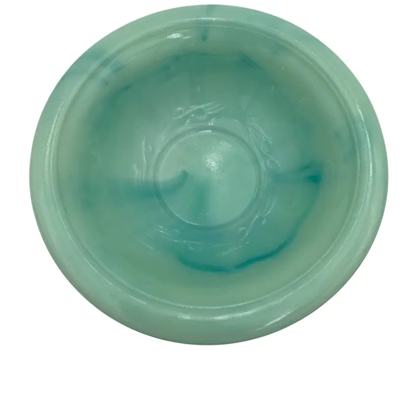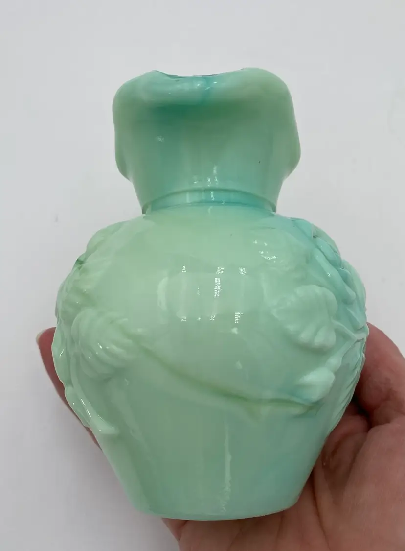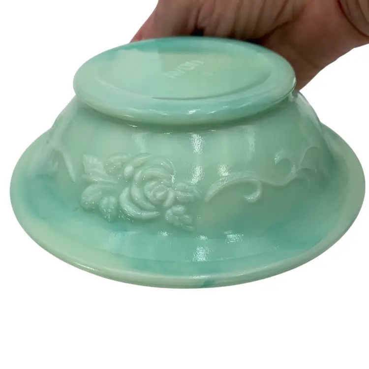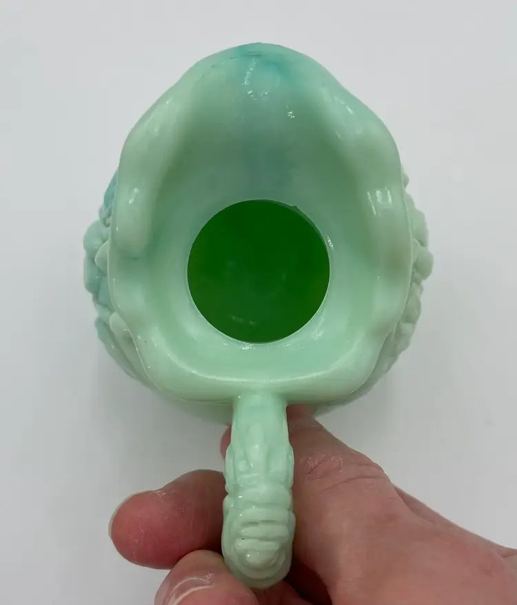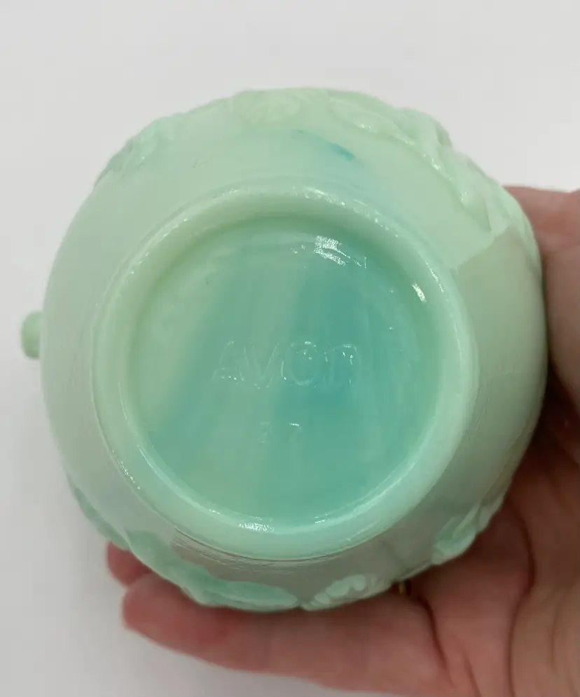 This vintage Fostoria Glass Green/Blue Slag Glass Pitcher & Basin set, featuring the "Victoriana" Roses design, is a beautiful miniature glass jug and basin set. Produced in Moundsville, West Virginia in the 1970s for Avon, this pressed glass jug and basin have a glossy finish and are adorned with embossed roses. This set was for Avon's Skin So Soft line, holding bath oil or cologne. This particular set is heavy on the min green, with a light touch of aqua running through both the pitcher and the basin.