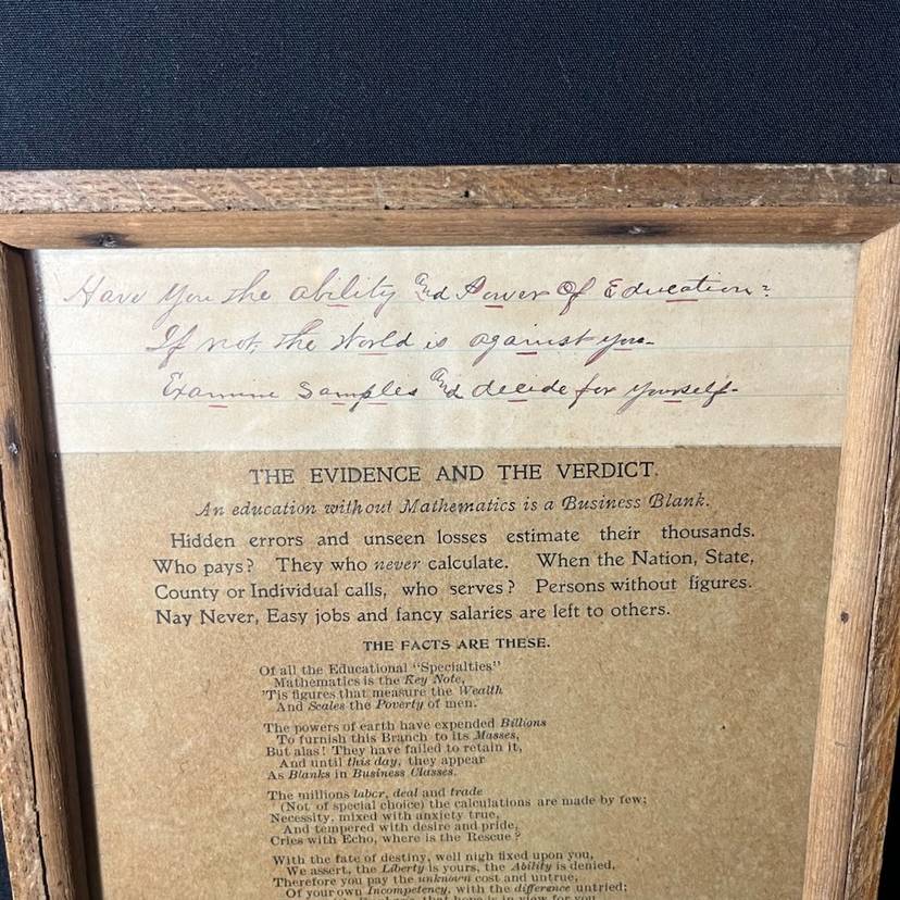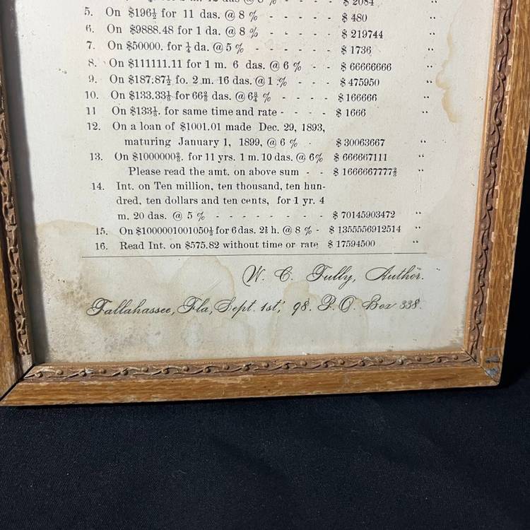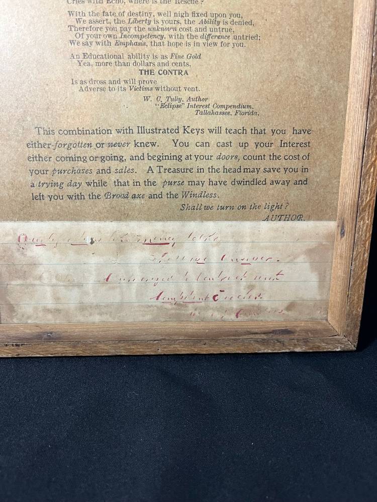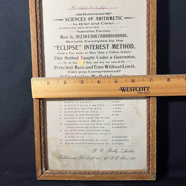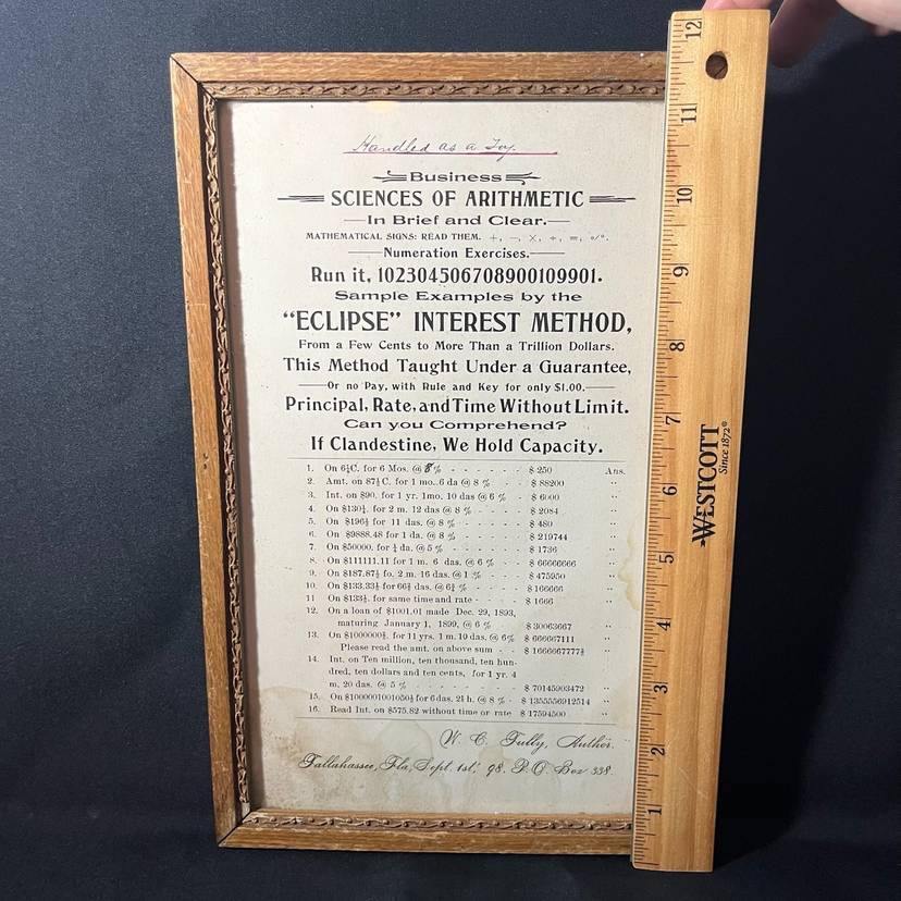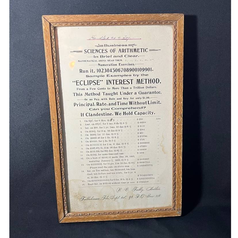 #1045 Unique VTG Framed Business Sciences of Arithmetic “Eclipse” Interest Method by Tully, Author. Measures 11.75” x 7.5”. Does have some staining and wear.