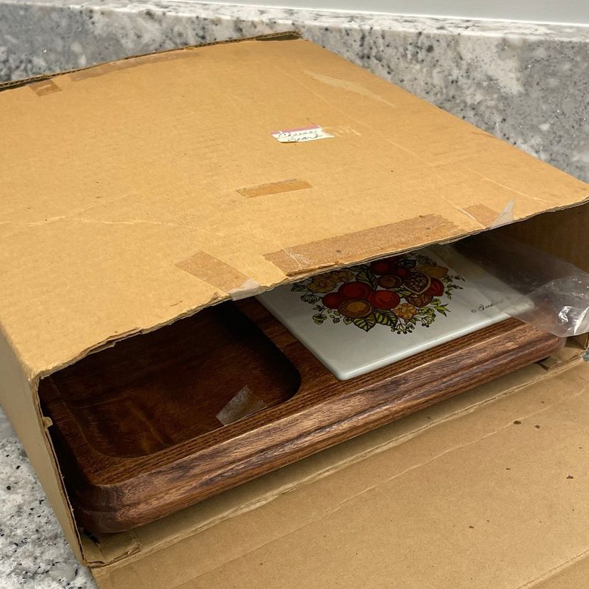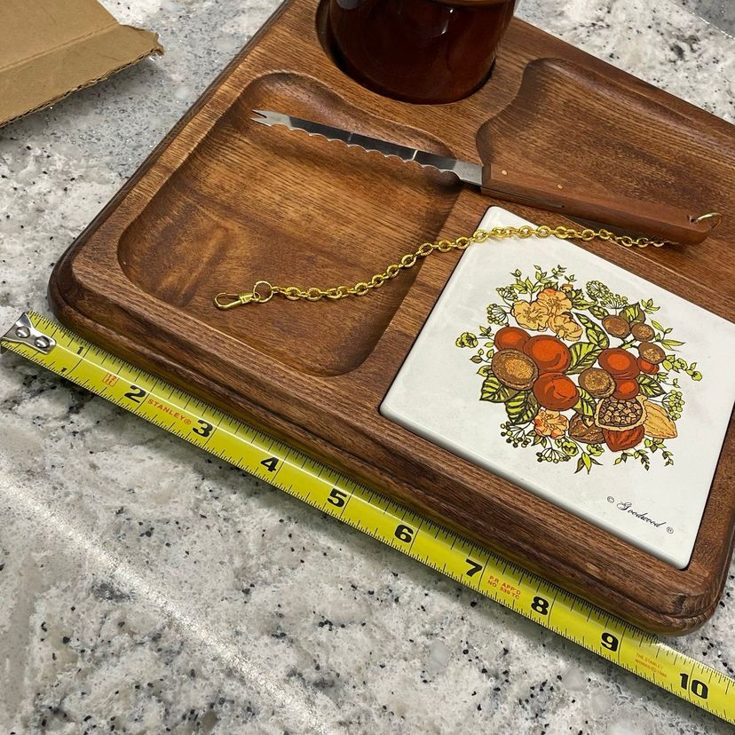 Wow- this 70's era cheese board is in excellent preowned condition and still in its original box. Comes with the original cheese knife and the pottery dip cup is in its original box as well. Nice mid-century themes piece for entertaining. See all images for full details. Bin 9
