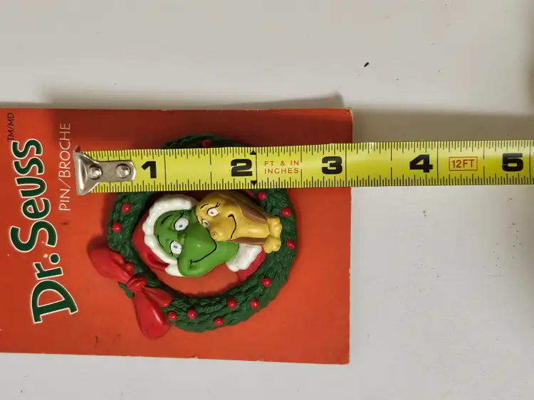 The product is a vintage Hallmark Dr. Seuss Grinch Who Stole Christmas holiday pin brooch featuring the characters of the Grinch and Max from the classic animated TV movie. Made of plastic and metal, this colorful green and red brooch captures the essence of Christmas and the beloved Dr. Seuss franchise. Perfect for collectors of cartoon and TV character memorabilia, this piece originates from China and is a nostalgic addition to any holiday decor collection.