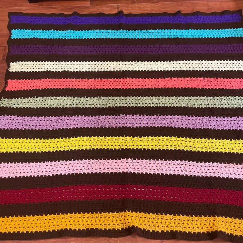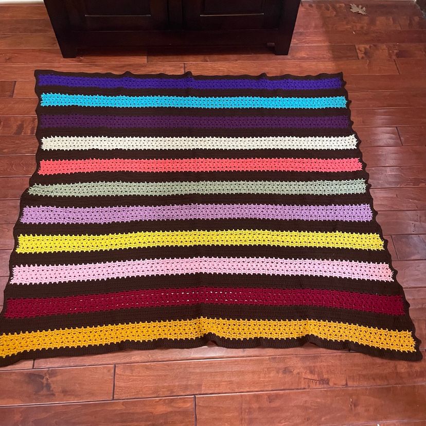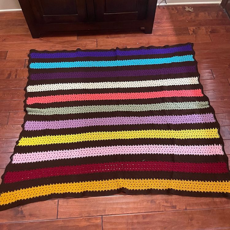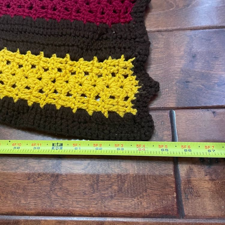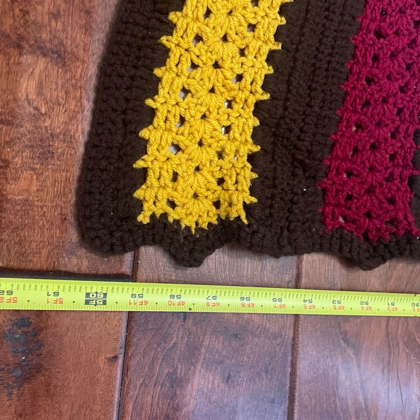 This vintage hand-crochet reversible Afghan blanket features a geometric pattern with multicolored stripes, measuring 64”x 60”. The large size makes it ideal for use as a sofa throw in various rooms such as the bedroom, study, or basement. The handmade craftsmanship adds a unique touch to the vintage/retro style of the blanket, which is perfect for adding a cozy and decorative element to any space. Additionally, the fringed details add a playful and novelty aspect to this charming piece.