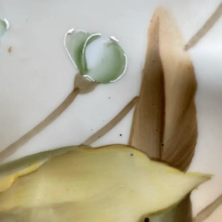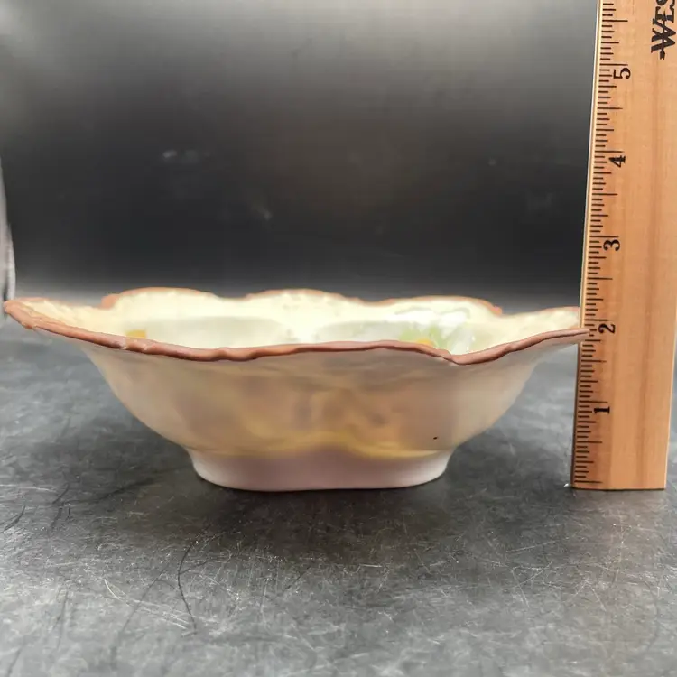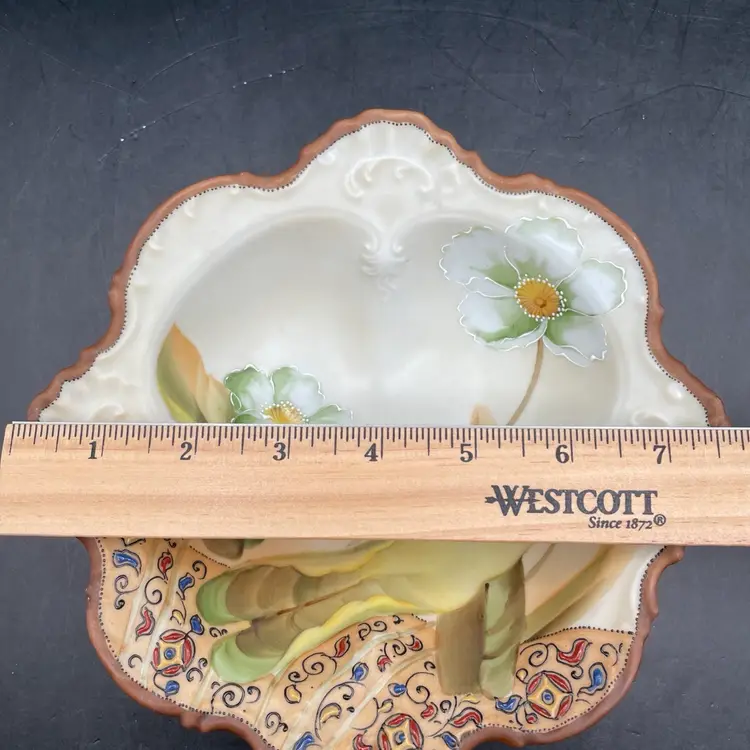 Approximately 7.75” wide x 2” tall. No chips or cracks. There are a few paint splatter spots inside the dish. Please see pictures.