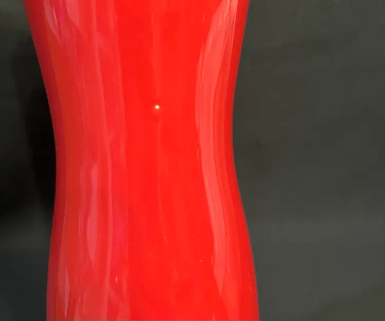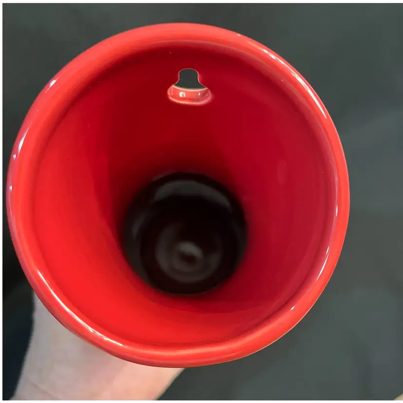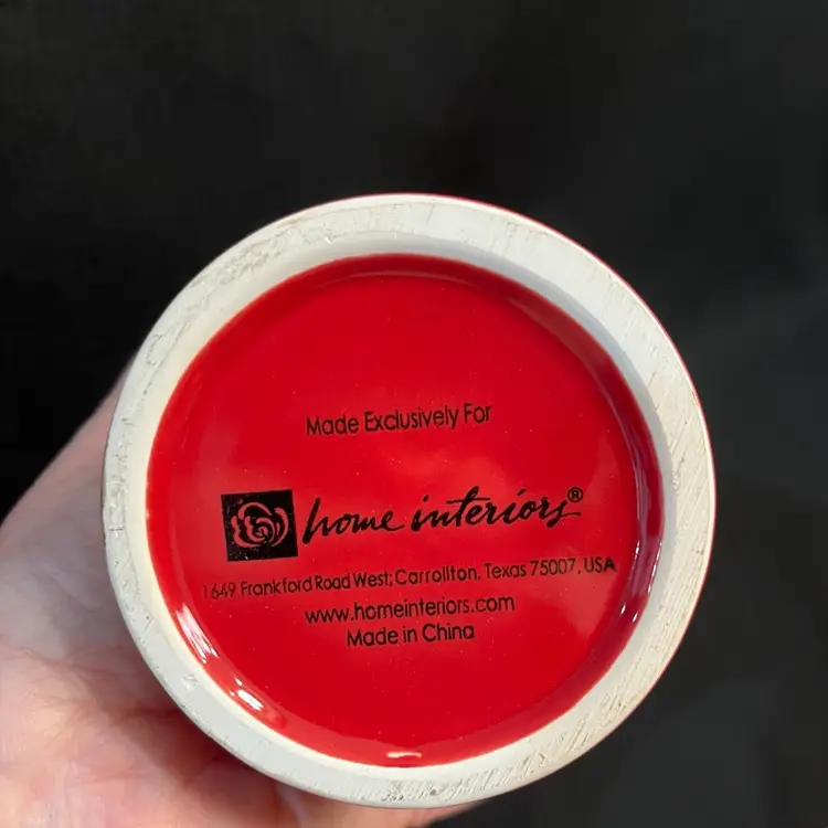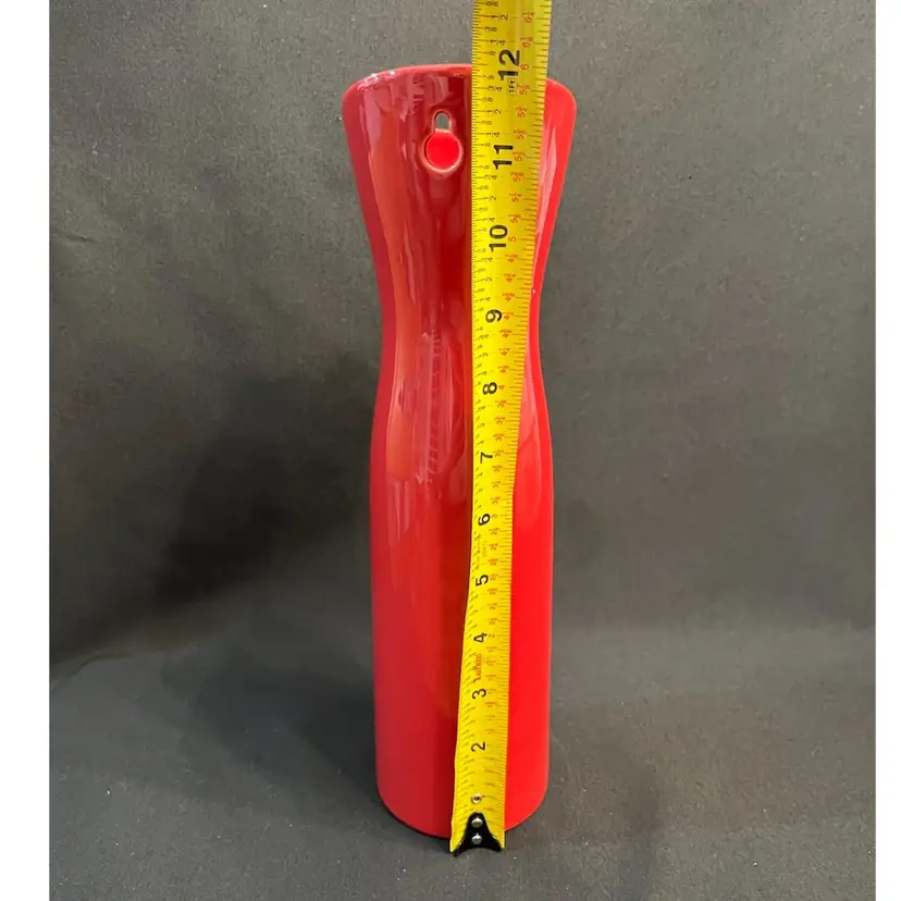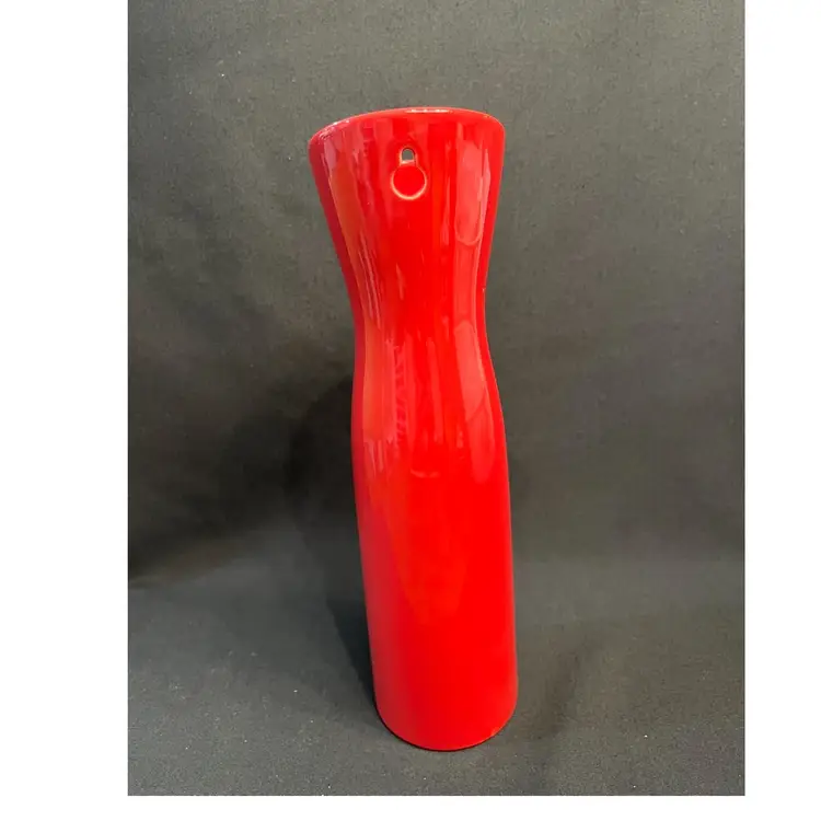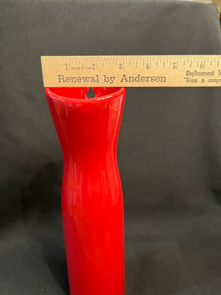 #876 VTG Home Interiors Red 12” tall x 3” opening Ceramic Wall Pocket/Vase. The pictures are showing a brighter red than it really is, it’s more of a darker red. The tiny white spot in last picture is under the glaze not a chip. In wonderful condition.