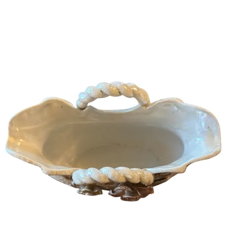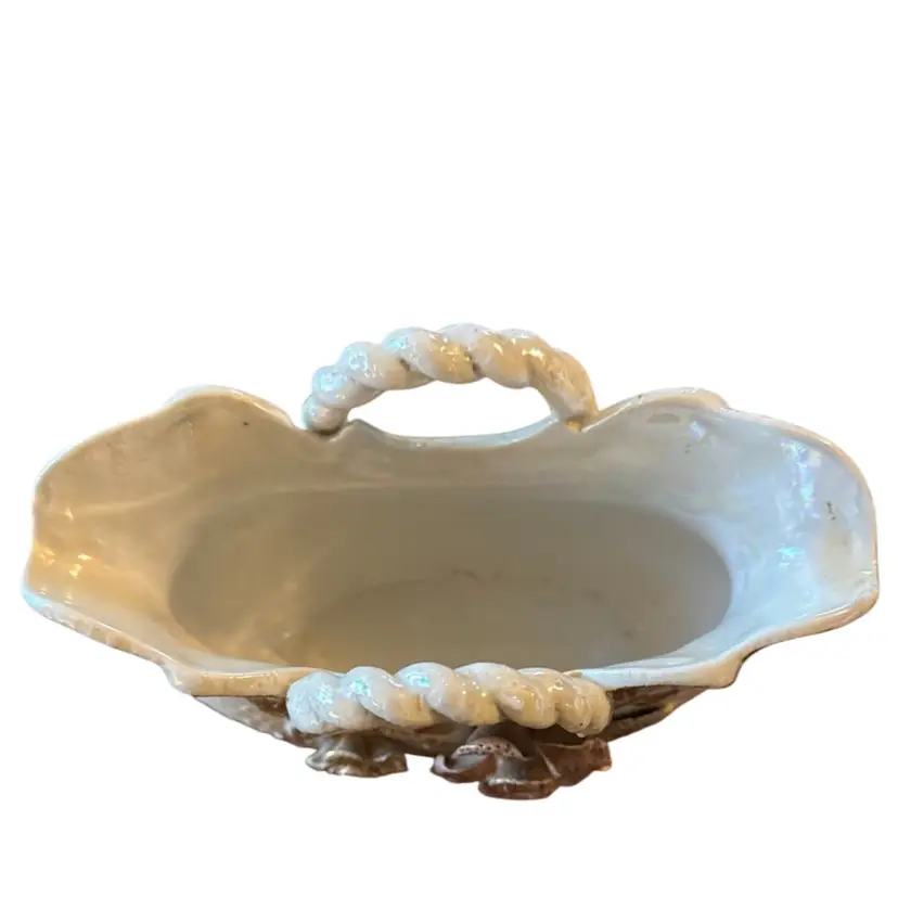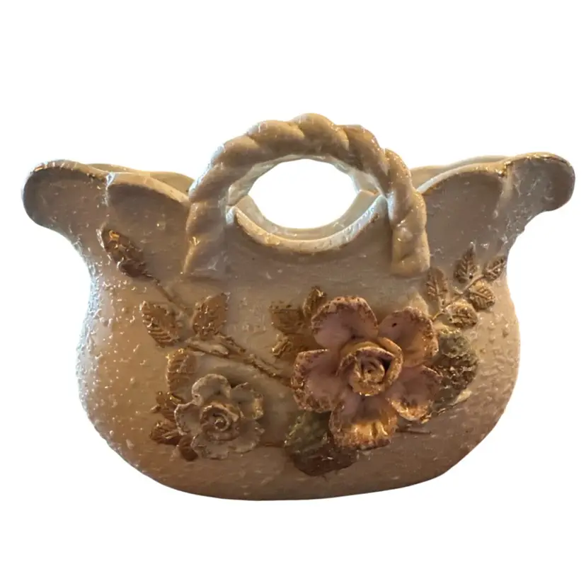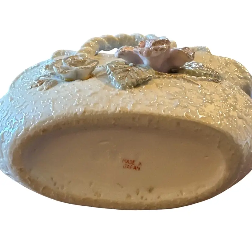 This one of a kind, elegant vintage porcelain planter is marked “Made in Japan” and features exquisite craftsmanship. The footed design is finished with a textured iridescent glaze, and it is adorned with beautifully sculpted pink and white roses and mint green leaves and accented with hand-applied gold leaf detailing. The ornate handle and scalloped rim add a romantic Victorian flair. In excellent condition with no chips or cracks. Measures approximately 8” long x 3” wide. Ideal as a floral display, vanity decor, or collector’s accent.A lovely gift for vintage lovers or shabby chic decorator. Excellent condition, no chips, cracks, crazing or wear. Absolutely perfect.