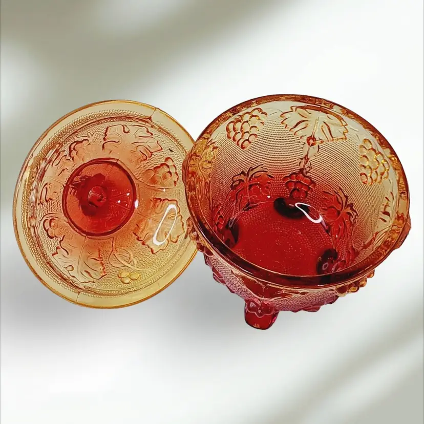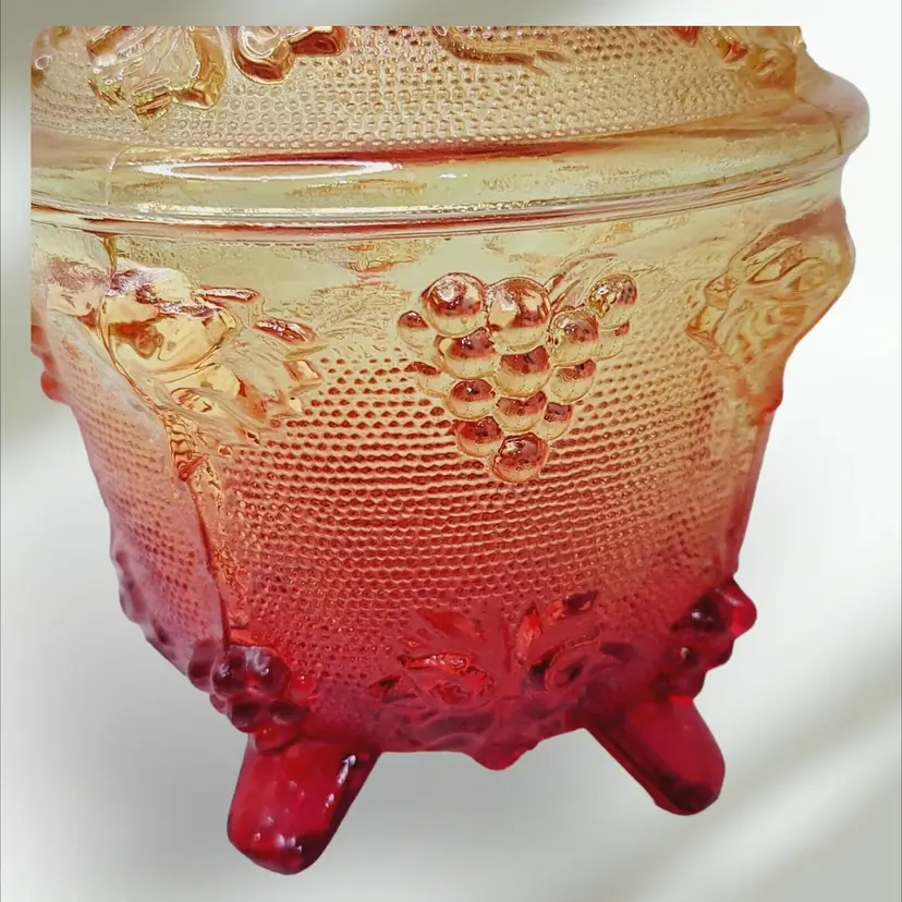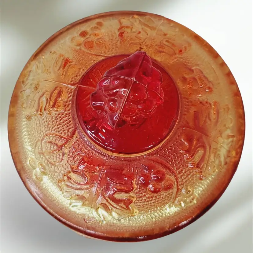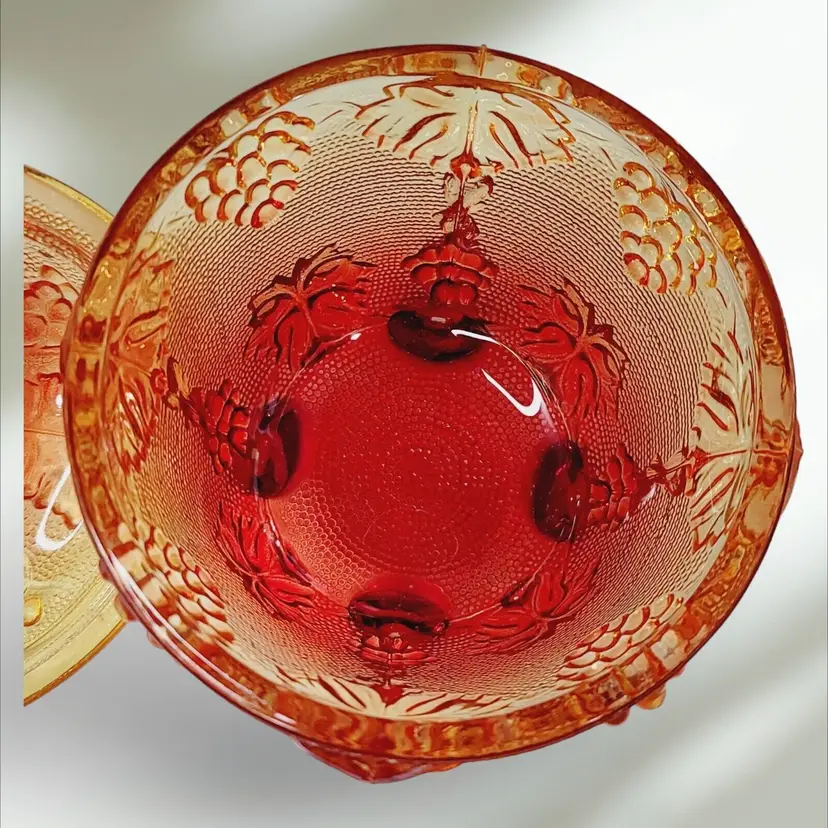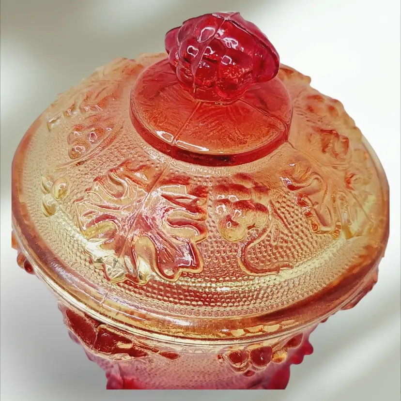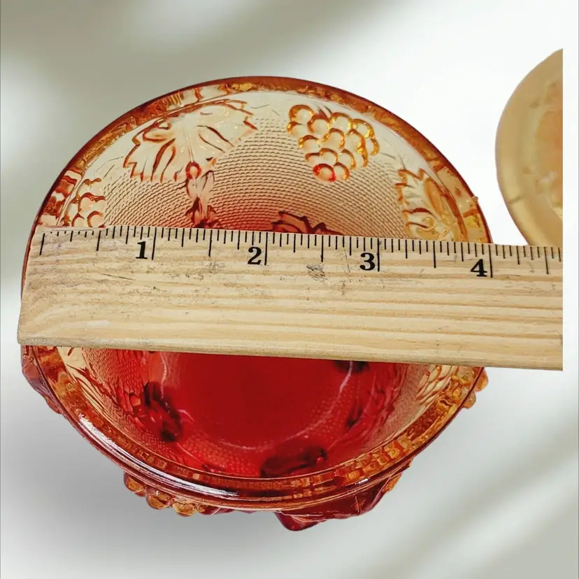 – Number of Items in Set: 2 – Antique: No – Number of Compartments: 1 – Shape: Round – Type of Glass: Carnival – MPN: na – Vintage: Yes – Original/Licensed Reproduction: Original – Capacity: na – Manufacturer Warranty: NA – Production Style: Carnival Glass – Finish: Glossy – Handmade: No – Item Width: 4 1/4" – Pattern: Grapes – Color: Amberina – Material: Glass – California Prop 65 Warning: NA – Brand: Jeannette – Type: Candy Dish – Theme: American – Original/Reproduction: Vintage Original – Time Period Manufactured: 1950-1959 – Production Technique: Fused Glass – Country/Region of Manufacture: United States – Product Line: Design Naif