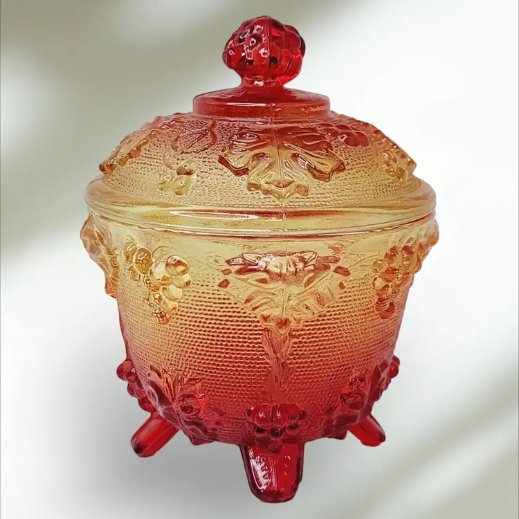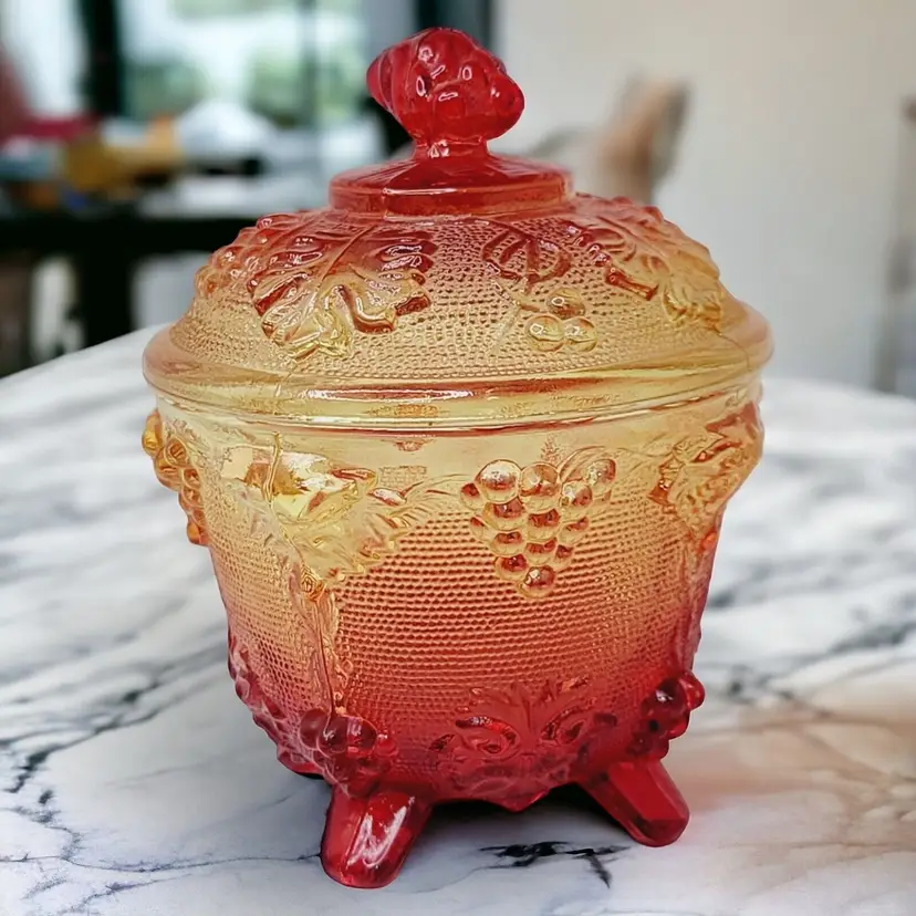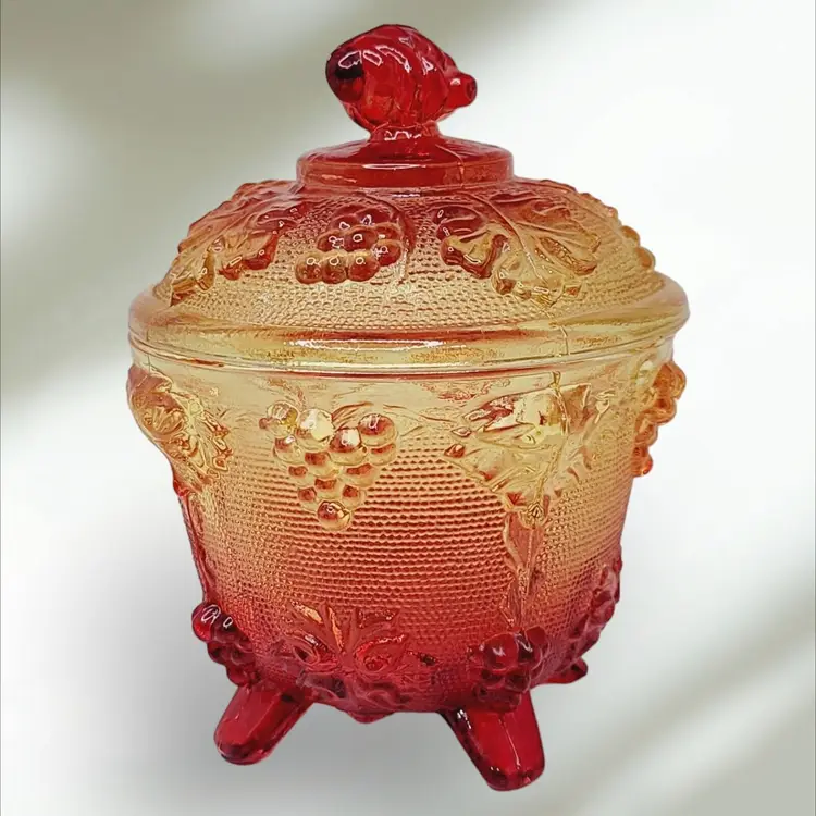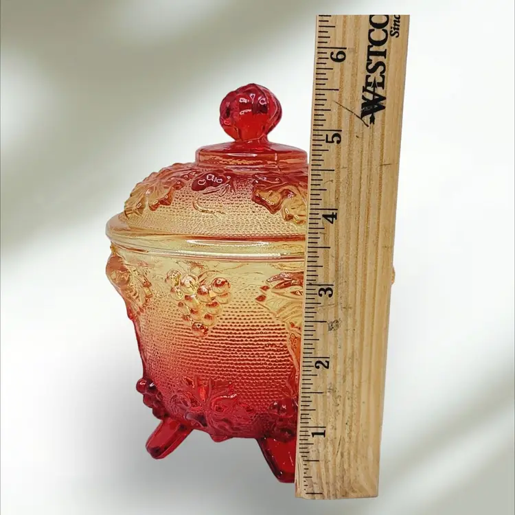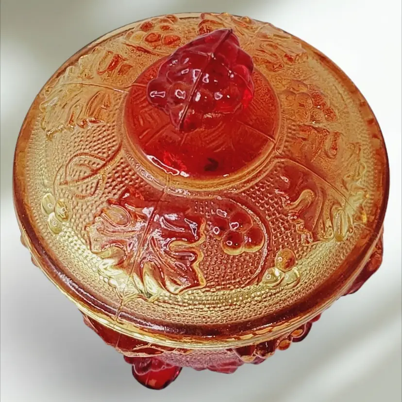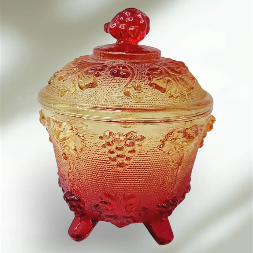 – Number of Items in Set: 2 – Antique: No – Number of Compartments: 1 – Shape: Round – Type of Glass: Carnival – MPN: na – Vintage: Yes – Original/Licensed Reproduction: Original – Capacity: na – Manufacturer Warranty: NA – Production Style: Carnival Glass – Finish: Glossy – Handmade: No – Item Width: 4 1/4" – Pattern: Grapes – Color: Amberina – Material: Glass – California Prop 65 Warning: NA – Brand: Jeannette – Type: Candy Dish – Theme: American – Original/Reproduction: Vintage Original – Time Period Manufactured: 1950-1959 – Production Technique: Fused Glass – Country/Region of Manufacture: United States – Product Line: Design Naif
