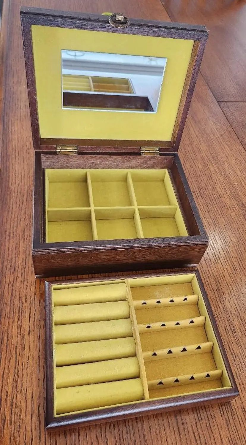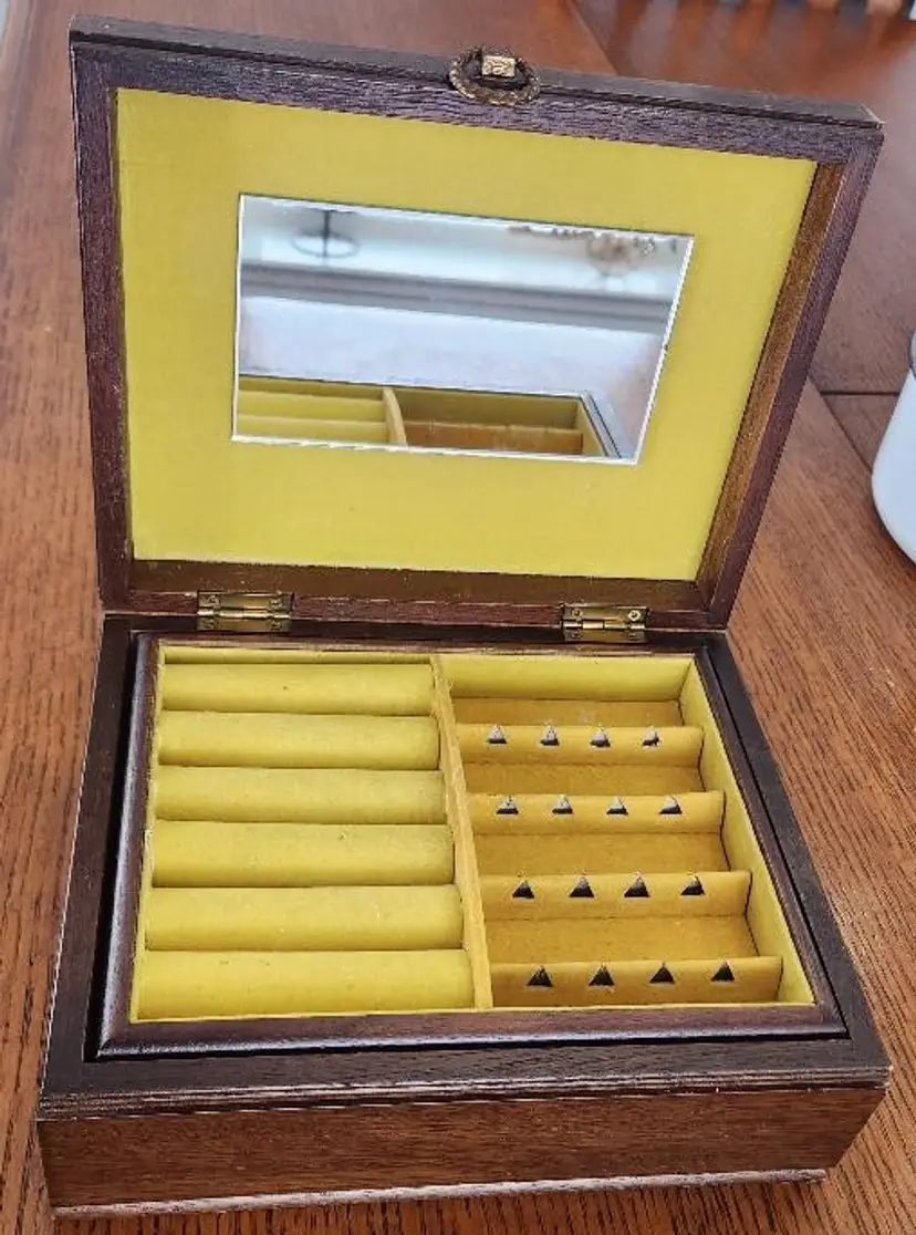 The VTG Jewelry Box with an embroidered tapestry top is a unique and stylish accessory for storing jewelry at home. Made from wood, this jewelry box is durable and adds a touch of elegance to any room. The intricate tapestry design on top, Harvest scene, makes it a standout piece, perfect for organizing and displaying your favorite pieces of jewelry.