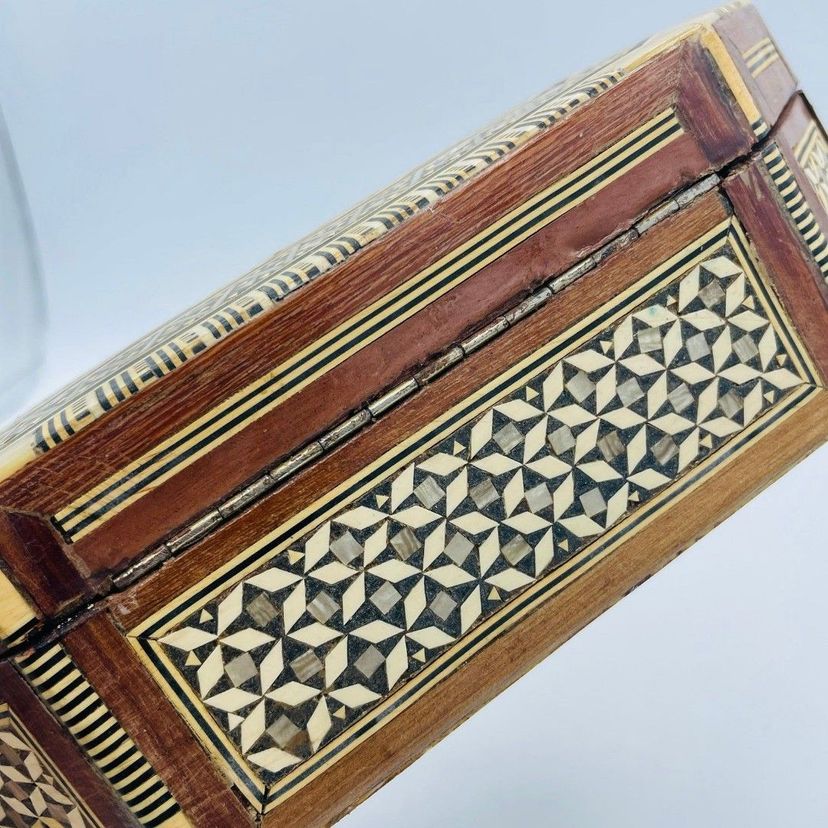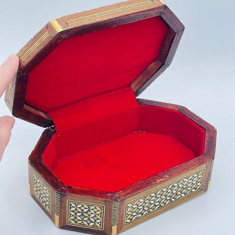 Gorgeous and unique box...handmade in Egypt. Nice octagonal shape and intricate deign. Hinged lid with red velvet lining inside. Lid a bit stiff and doesn't stay open wide...didn't want to push it too much. See all images for more info and details. Other boxes also listed separately. Bin 70