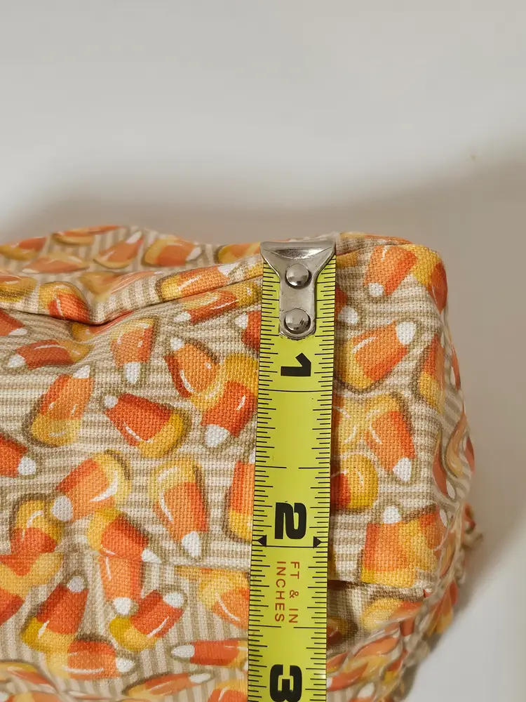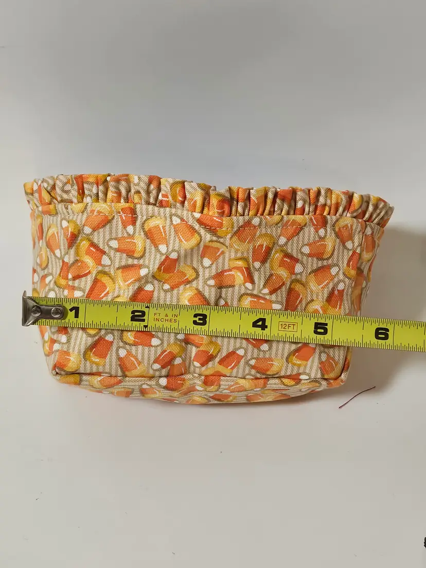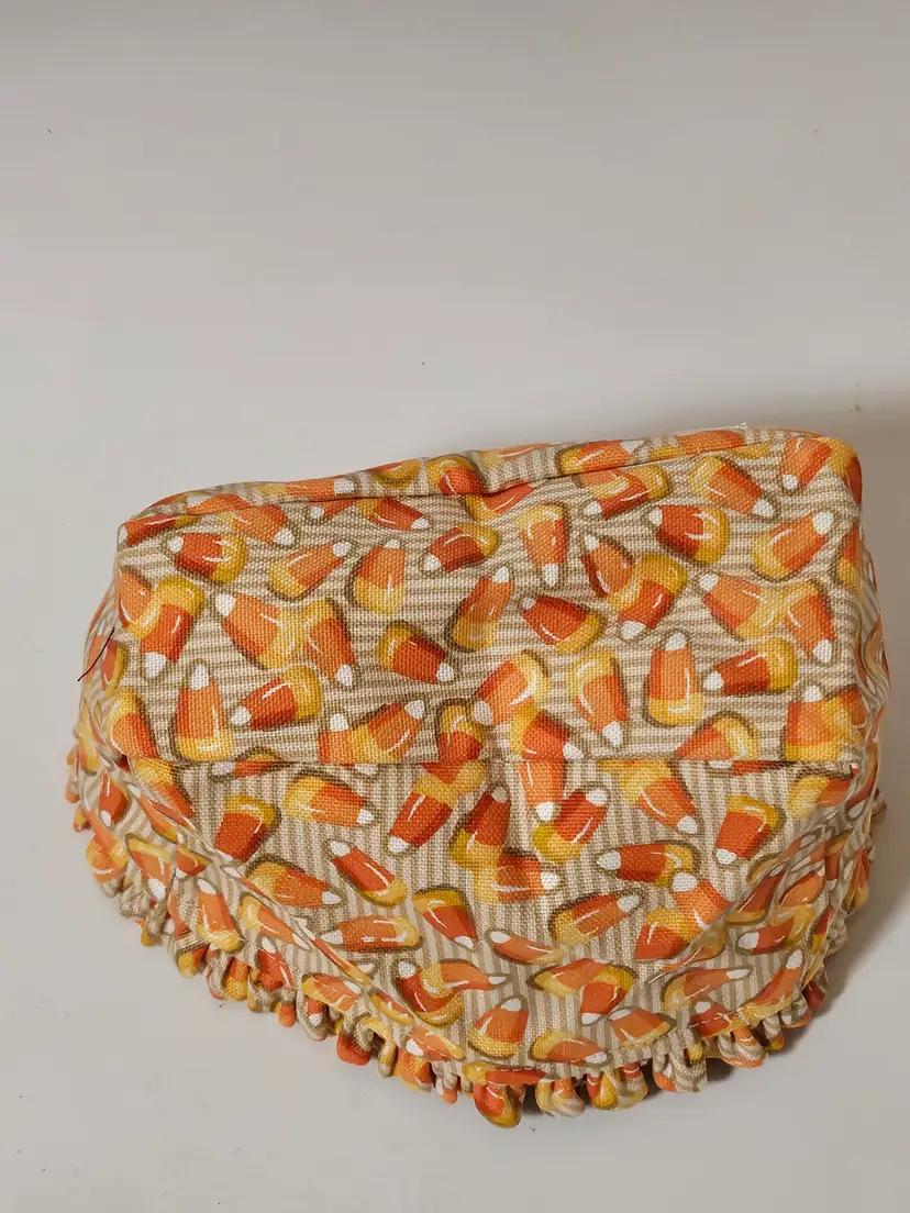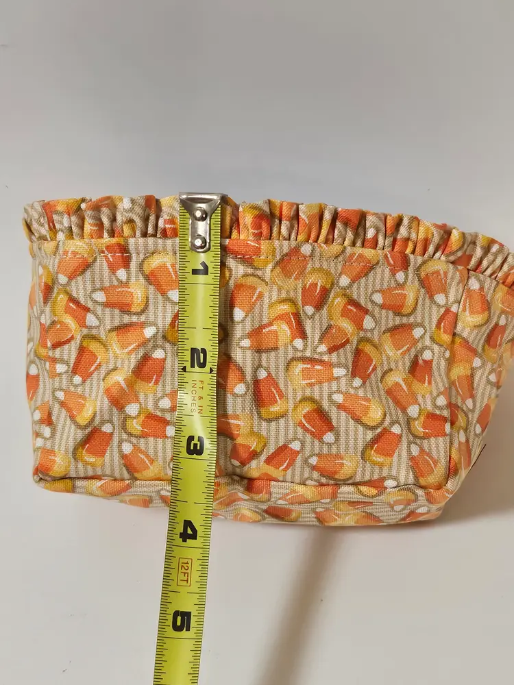 The product is a vintage Longaberger small basket liner designed with a festive fall theme, featuring candy corn decor in orange and white colors. Made of fabric with an all-over pattern, this original seasonal decor piece is perfect for various rooms in your home, such as the bedroom, living room, kitchen, or office. The novelty basket liner adds a touch of whimsy to any space, making it a delightful addition for adults looking to bring a touch of fall cheer into their home.