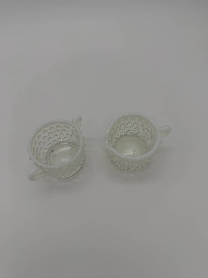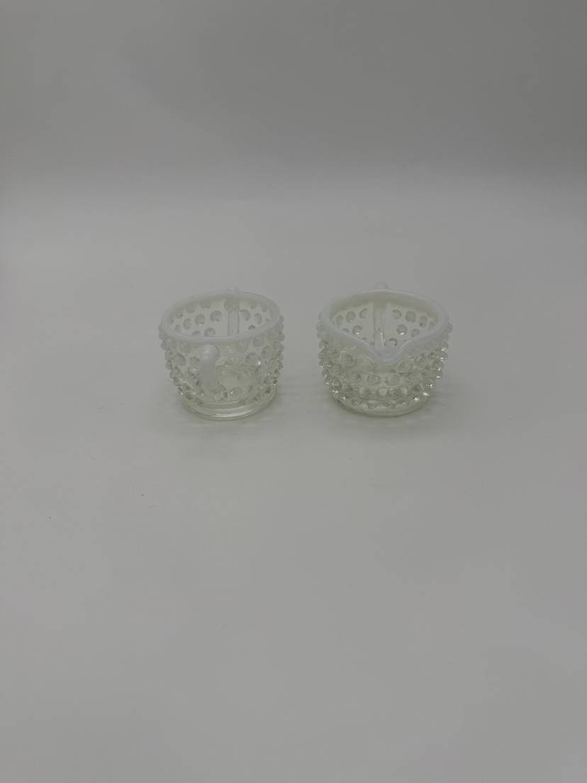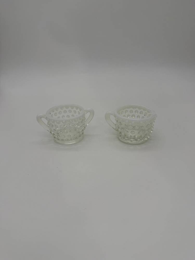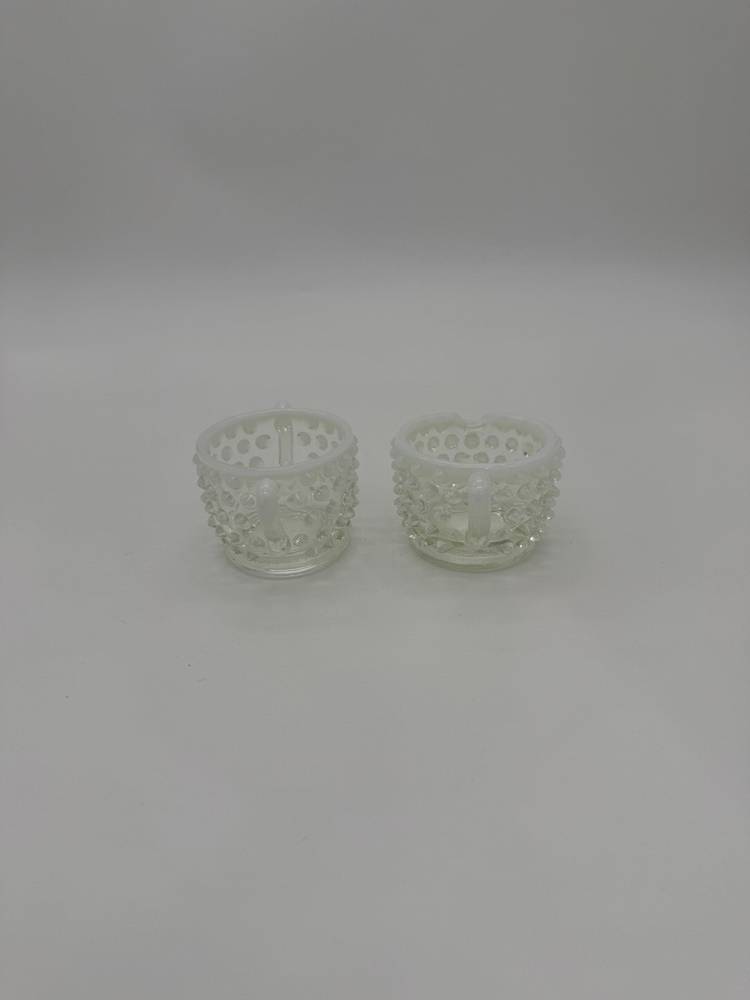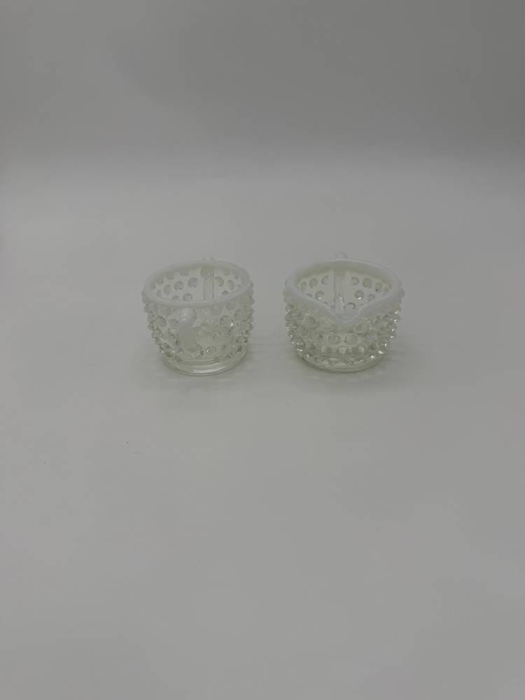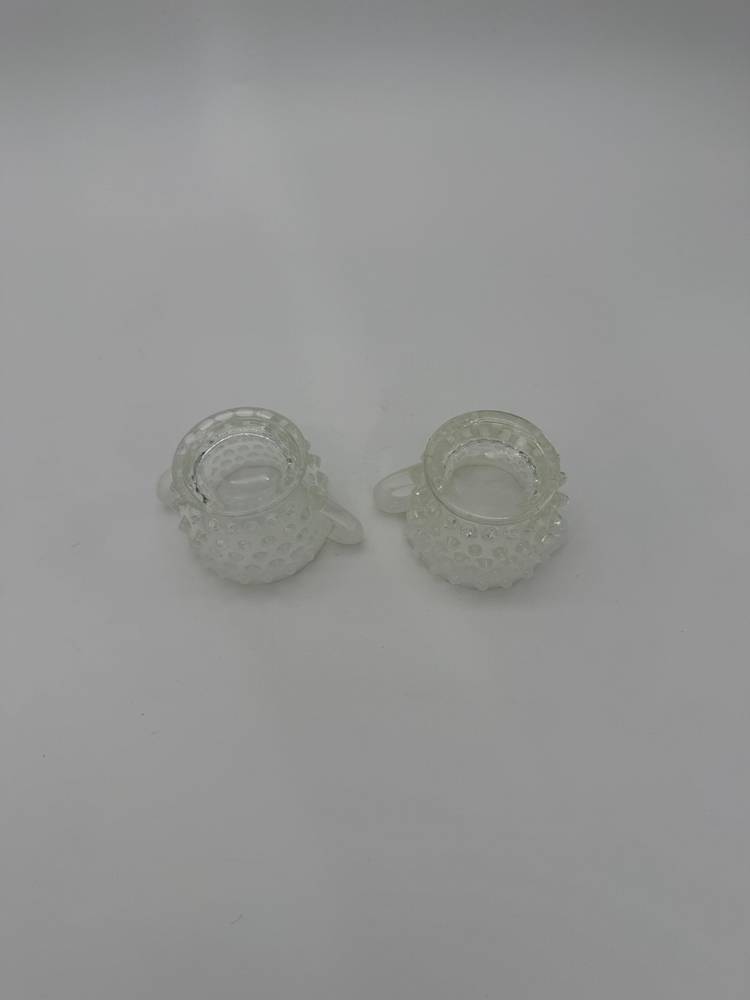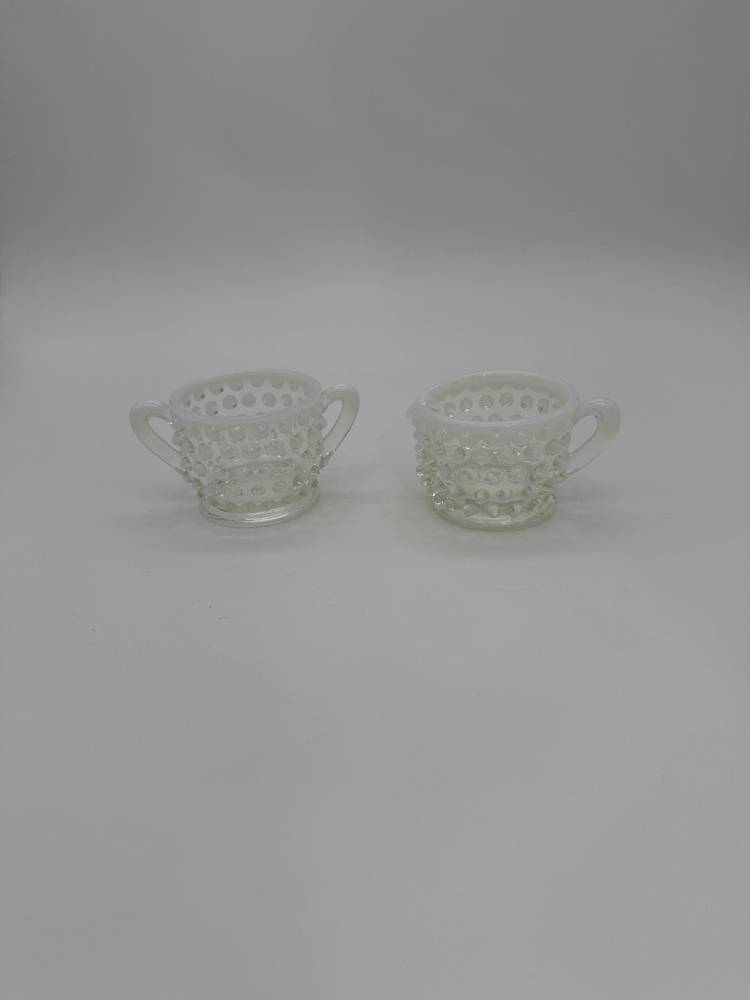 This vintage Mid Century Moonstone Fenton Glass Hobnail Sugar & Creamer Set with Handles is a beautiful and unique addition to any kitchen or dining room. The clear glass with bluish milky white accents gives it a distinctive and elegant look, perfect for collectors of Victorian or Mid Century style decor. Made in the United States with a pressed glass production style, this set of two has a capacity of 3 oz and weighs together 9.7 oz. The round shape, glossy finish, and intricate hobnail/moonstone pattern make this set a charming and functional piece for serving sugar and creamer in style. Excellent Condition!