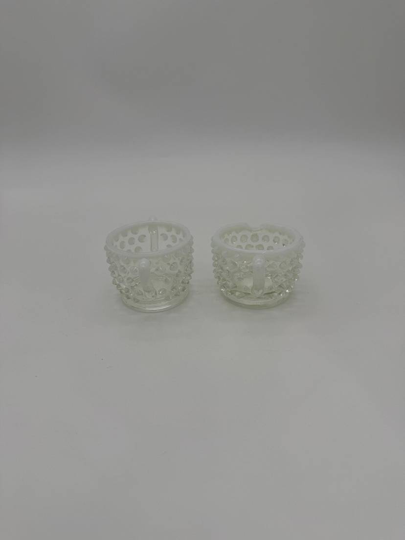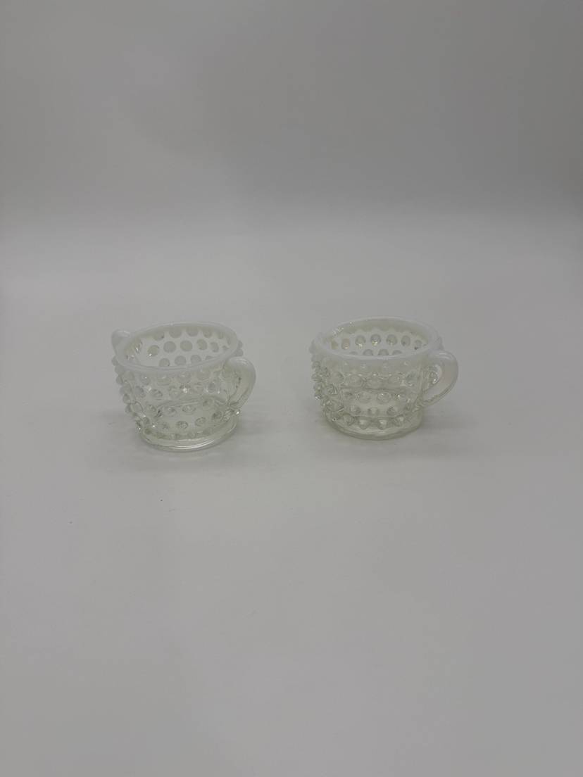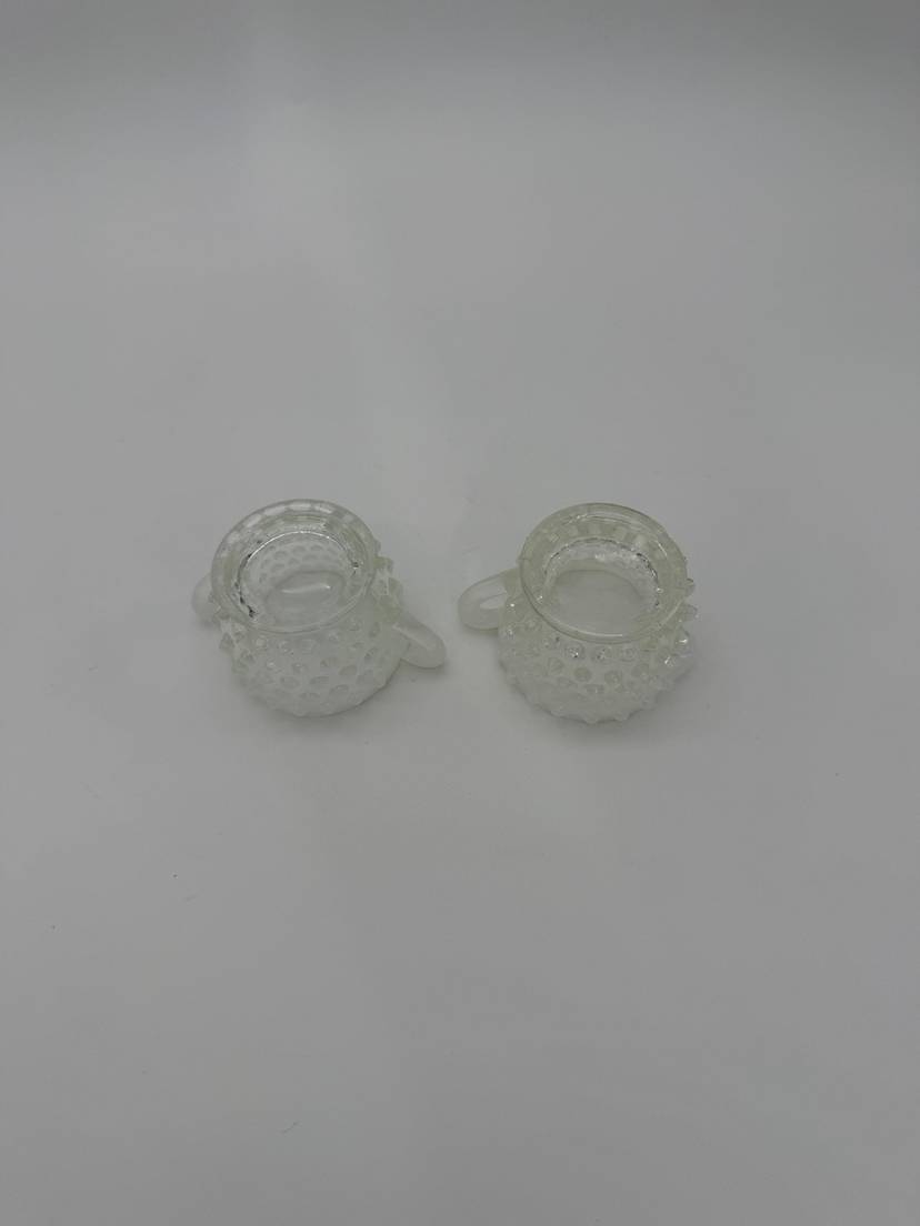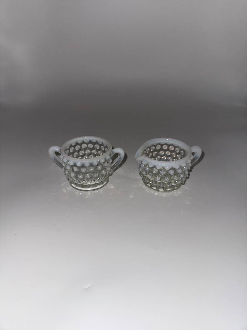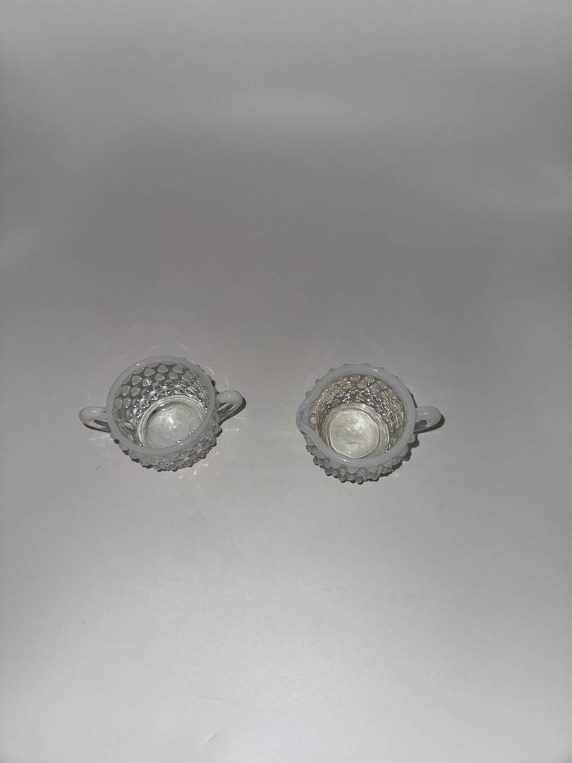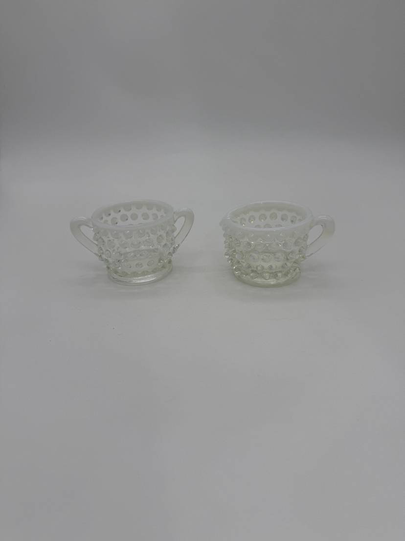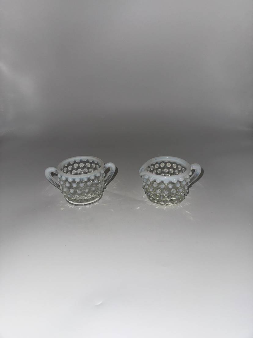 This vintage Mid Century Moonstone Fenton Glass Hobnail Sugar & Creamer Set with Handles is a beautiful and unique addition to any kitchen or dining room. The clear glass with bluish milky white accents gives it a distinctive and elegant look, perfect for collectors of Victorian or Mid Century style decor. Made in the United States with a pressed glass production style, this set of two has a capacity of 3 oz and weighs together 9.7 oz. The round shape, glossy finish, and intricate hobnail/moonstone pattern make this set a charming and functional piece for serving sugar and creamer in style. Excellent Condition!