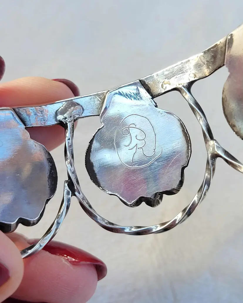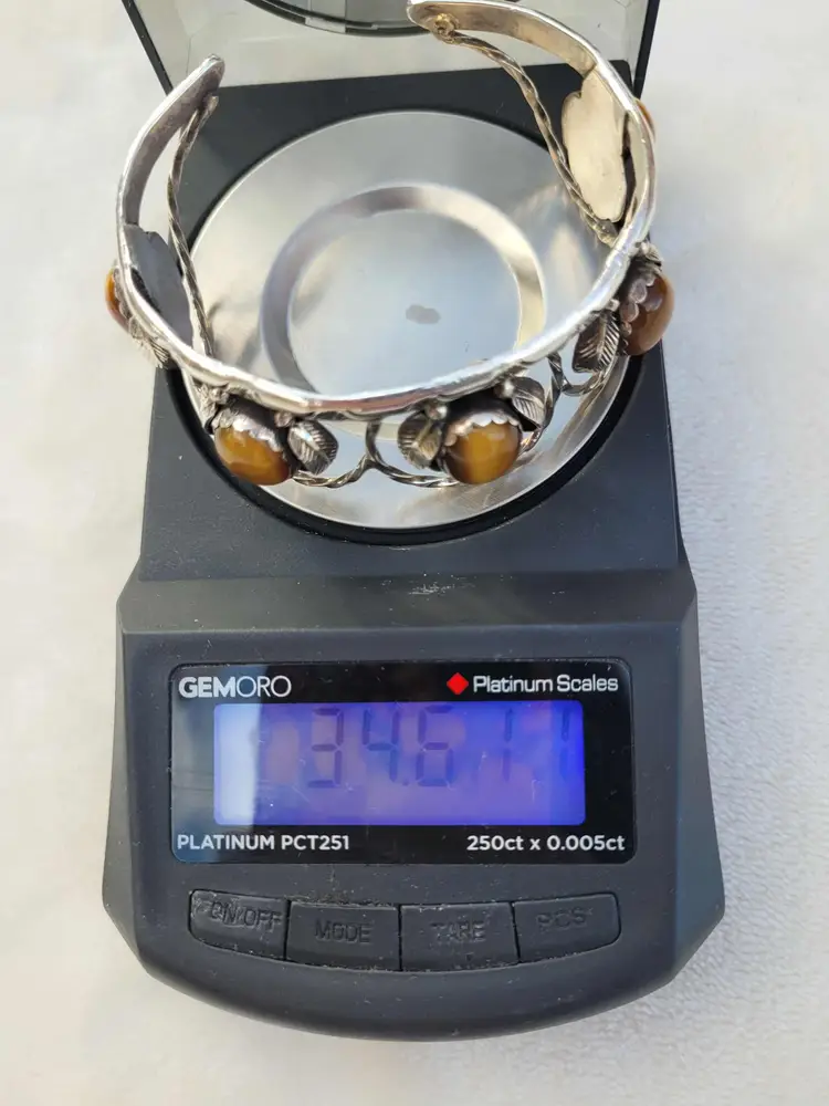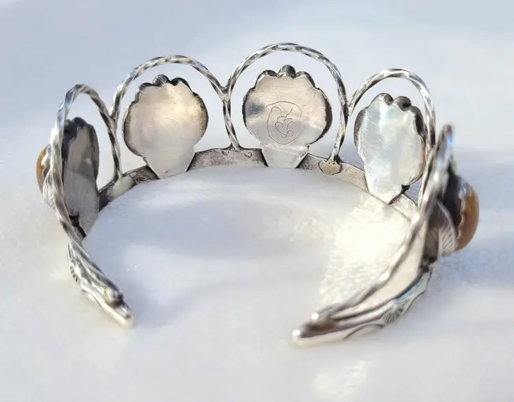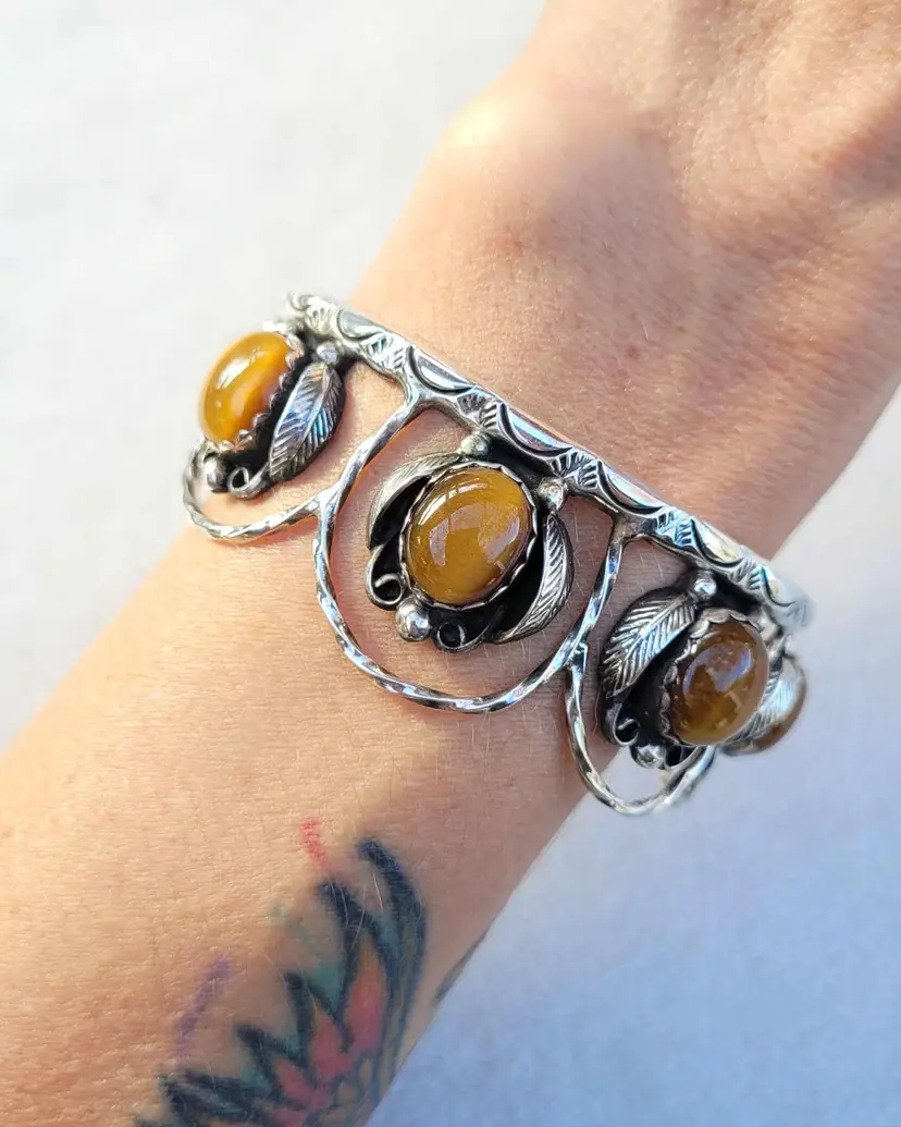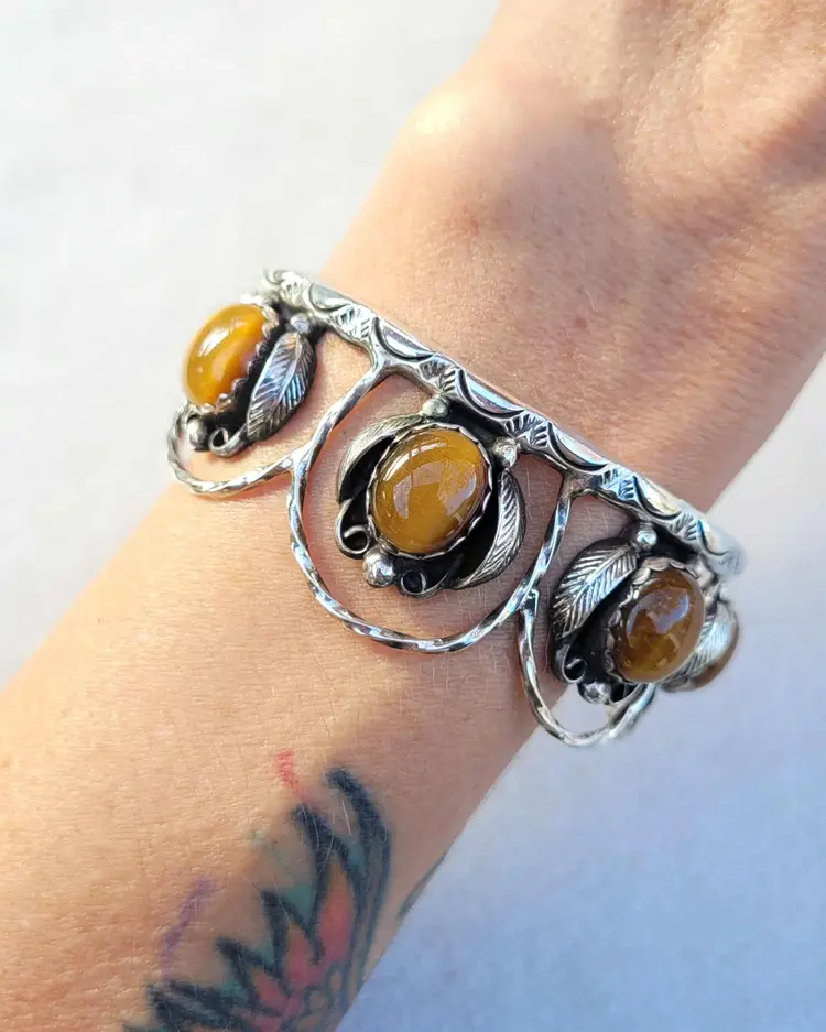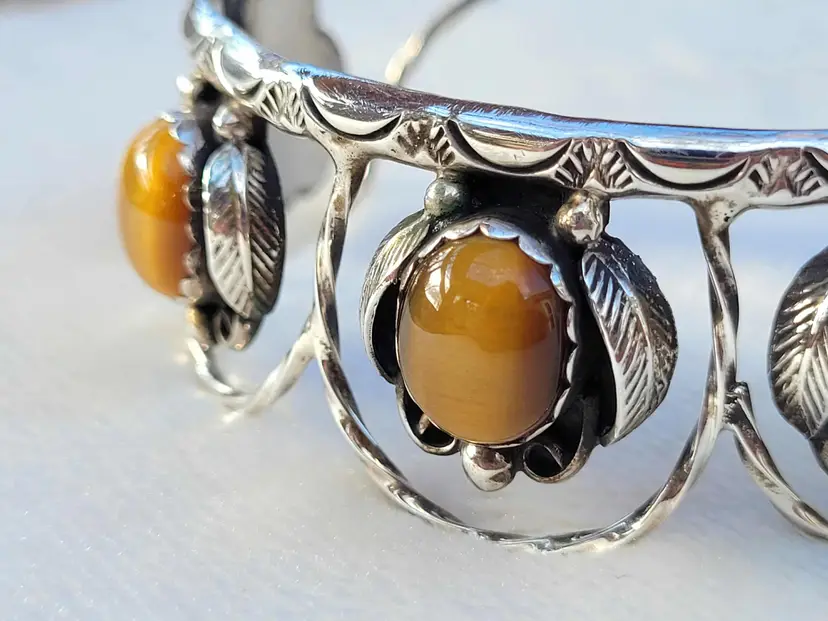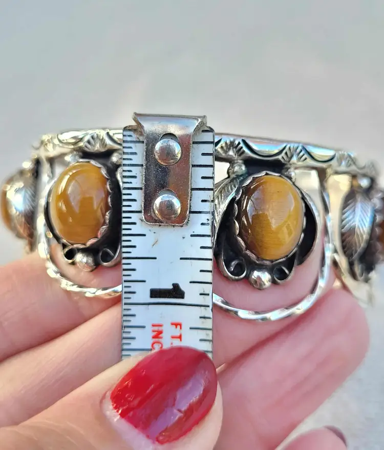 One-of-a-kind heavy sterling cuff with large iridescent Tiger's Eye polished cabachons, from an estate and I believe to be 1970s or so. It is signed by the artisan and appears to say "DK." The metal content is unmarked so it has been tested to verify purity of the sterling. It measures 7.5" in circumference including the opening. It's in good condition, please see pictures for details and measurements.